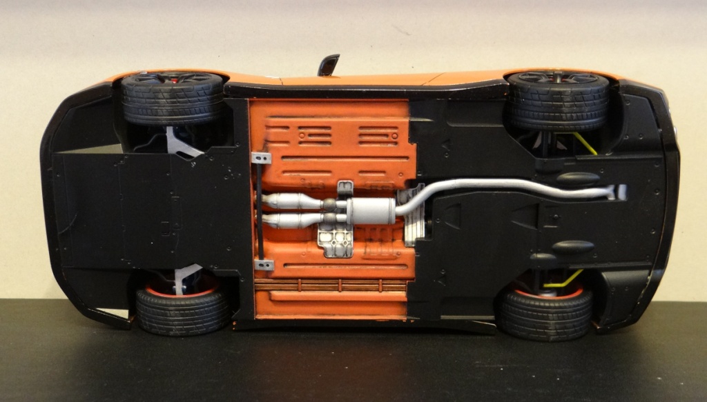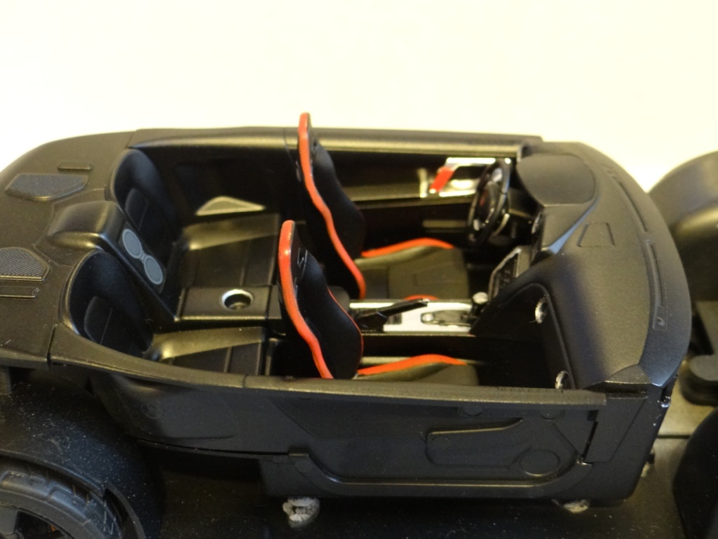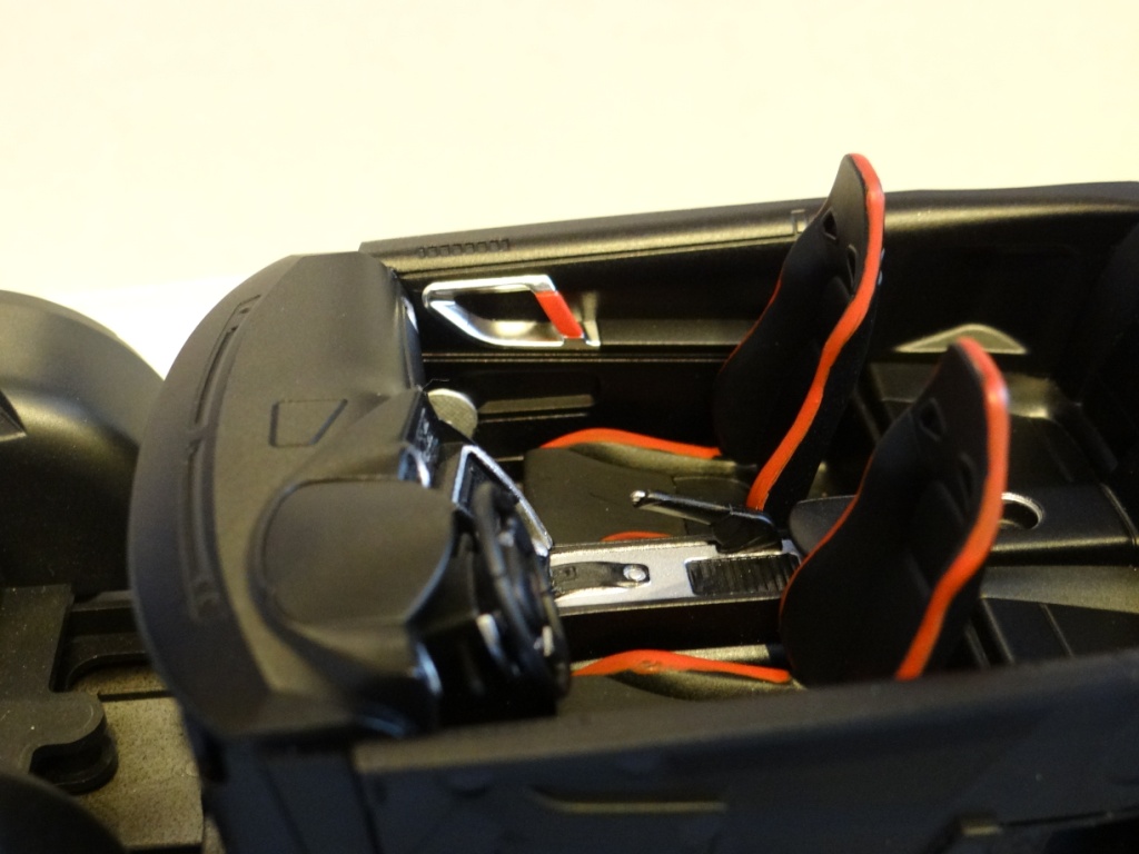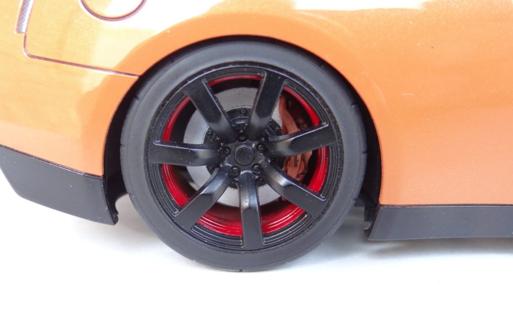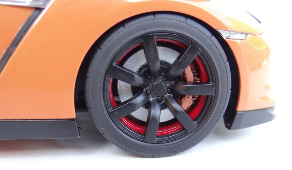 Модель очень интересная, стыкуемость великолепная и в сборке никаких проблем не составила, но не без косячков к сожалению. Единственное только не понравился двигатель, уже вылитый под капотом, это было скучно и не удобно. Благодаря тому, что диски собираются из двух деталей, сделал диски с красной внутренней окантовкой, по моему получилось не плохо.