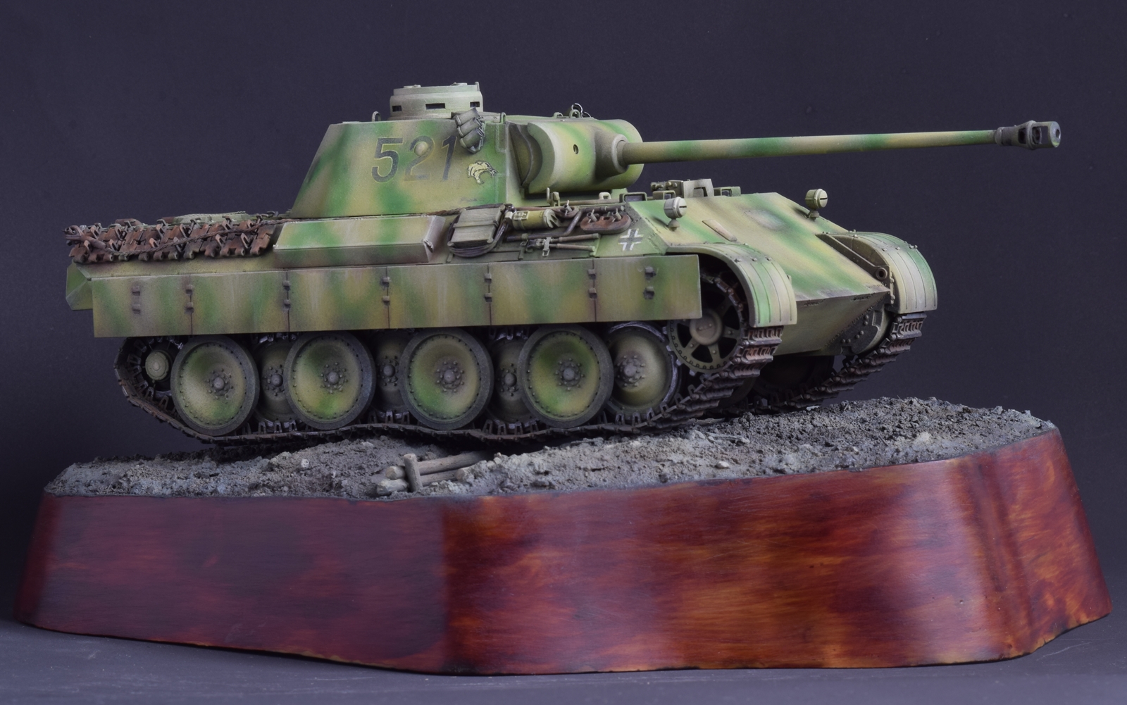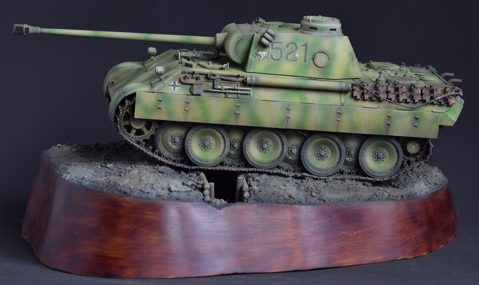 Лично у меня - проблема: литые поверхности слишком литые. У Вас - тоже проблема, но обратка: что литые, что катанные - одной фактуры, а ведь у "Пантеры" интересный переход от лобовой детали башни например к катаным бортам башни, литая маска орудия... Что с дульным тормозом - не понятно. Пулемёт спаренный показан не корректно. Суть замены кронштейнов я не понял: они выглядят как отлитые с экранами вместе. Та же окраска: выглядит как лютый оверспрей. Не знаю как так, тем более не знаю, как красить темперой - но что есть, то есть. Плюс вот это выделение аж светлым люка на ВЛД и стыка лобовой детали башни с её бортами напрочь съело люк и нивелировало сварные швы на башне...