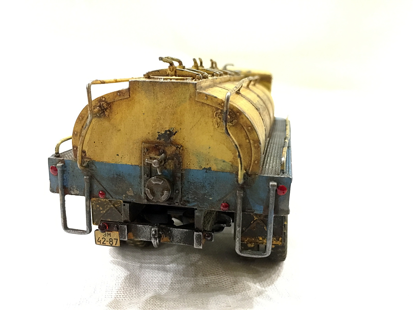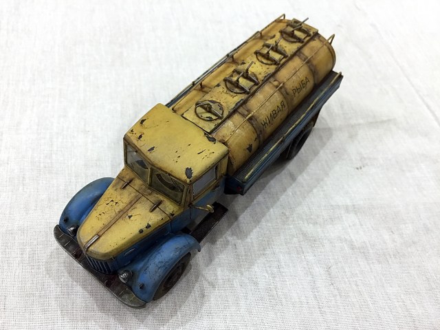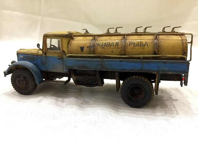 Краски использовал от Пасифик, грунт от Валехо, смывку от Тамии, жидкость для обдирания – от Миг, вет-эффект (потеки жидкости по цистерне) тоже от миг. Теперь о самом трудном. Так как в коробке декали «Живая рыба» не было (ну не сделал ее производитель просто для этой модели), а надпись сделать было ну просто необходимо, то я задался целью сделать декаль самому. Но не тут то было ! Все варианты, которые выложены в инете (типа распечатать на принтере на обычной бумаге, наклеить на скотч, опустить в воду и ободрать пальцами бумагу)- к успеху не привели. Даже не пытайтесь: фигня полная, не получится ! Пришлось рыскать в поисках трансфертной бумаги для холодных декалей. Нашел ! По 140 руб за лист формата А4. Но это еще не все, найти лазерный принтер (цветной !) оказалось более трудной задачей ! Но я их всех все равно победил , чего и вам желаю !