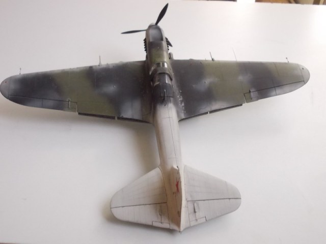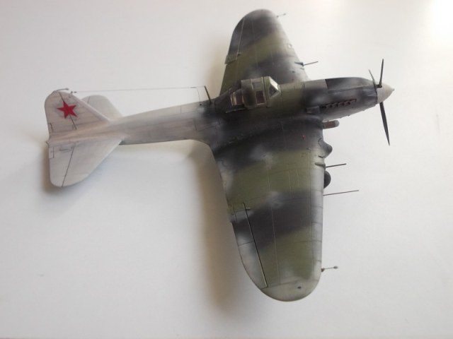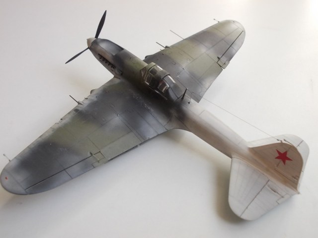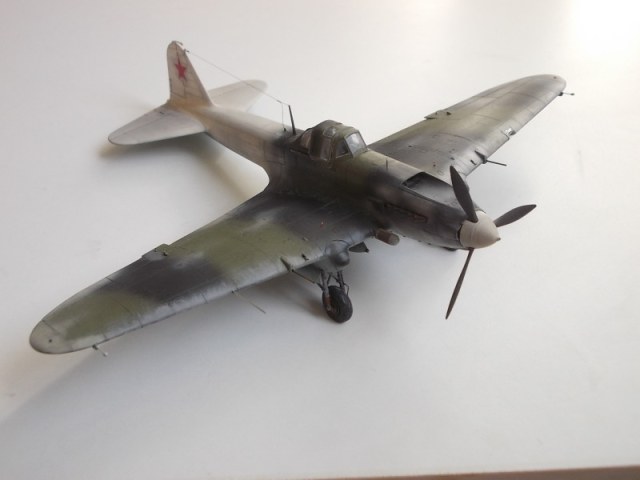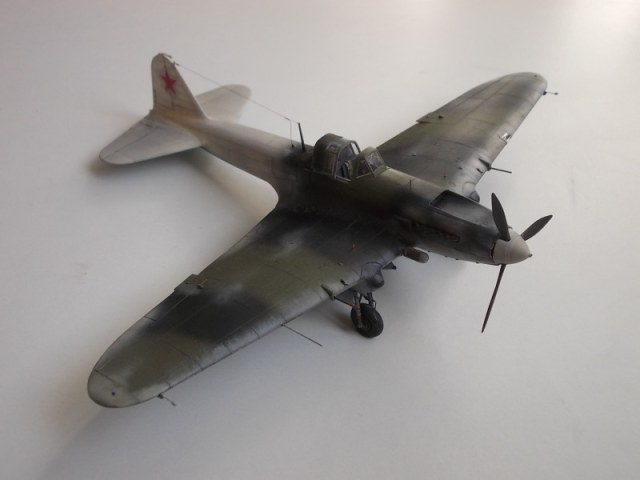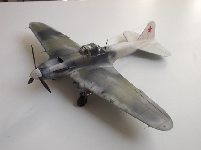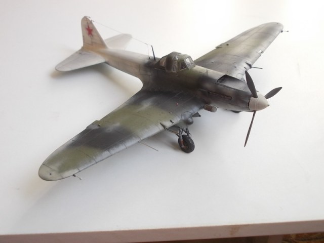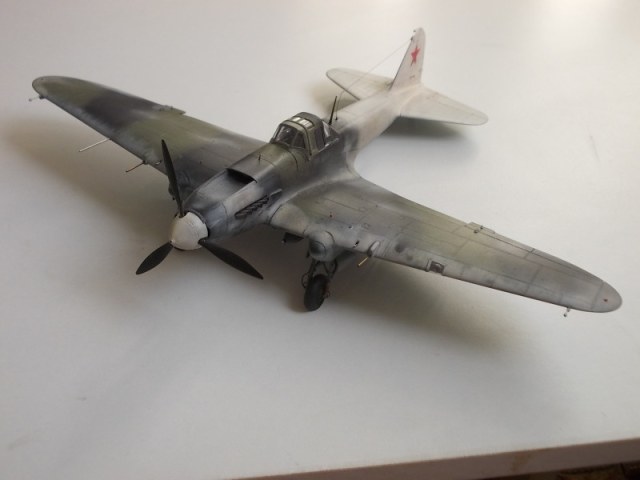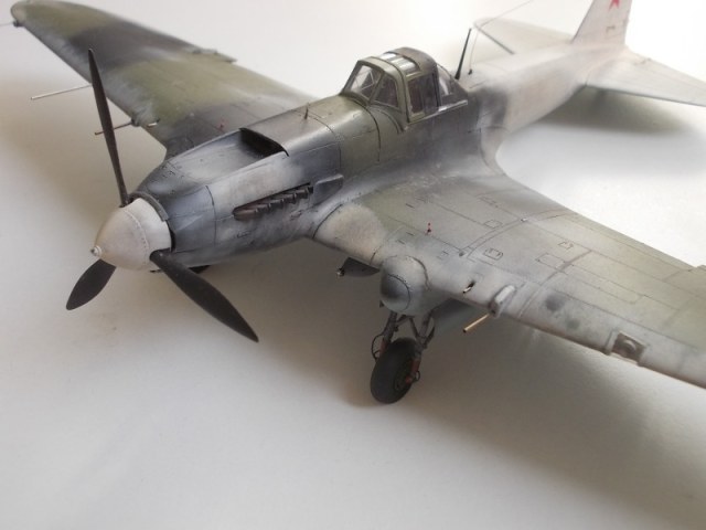 Хорошо выглядит Ил-2 в зимнем камуфляже. Интересная работа. Стволы вооружения имеют ржаво-латунный цвет, необычно как-то.