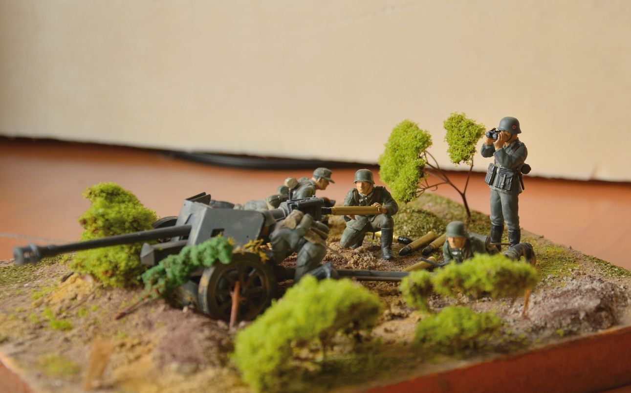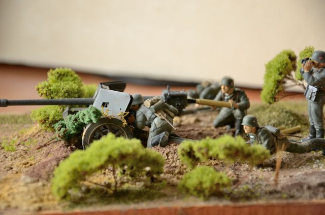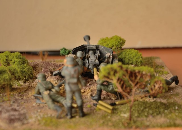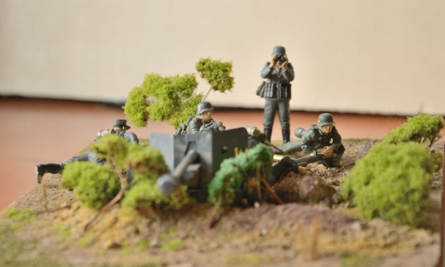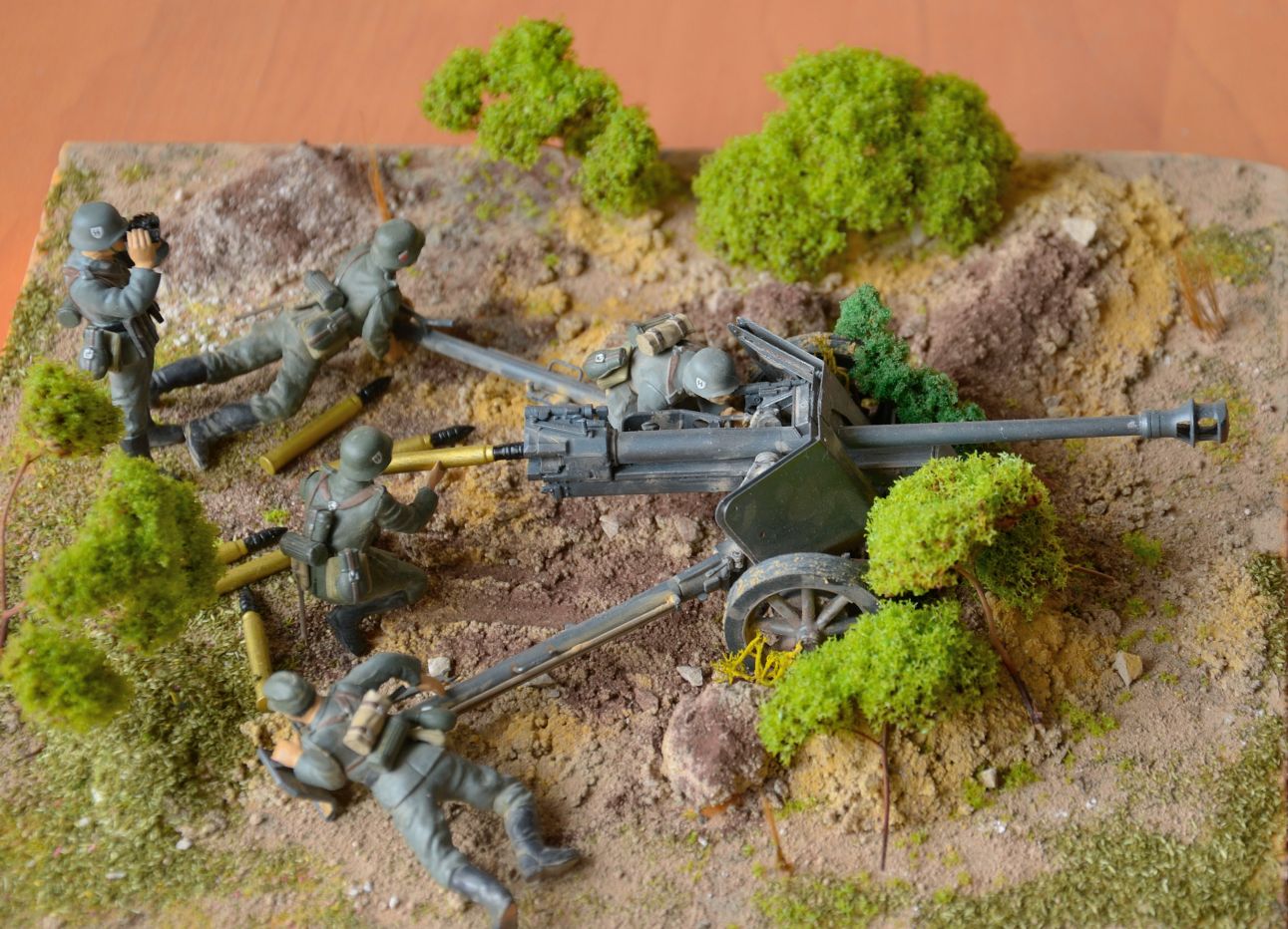 Орудие окрашено без изысков, но аккуратно. Фигуры, как удалось рассмотреть, просто в один цвет, без светотени. И с одним, по крайней мере, косяком по матчасти: подсумки для MP-38/40 кроились из брезента различных коричнево-песочных тонов, но никак не фельдграу, как у Вашего унтера с биноклем. Ну и основание, растительность из паралона в 21-м веке, да в Вашем возрасте...