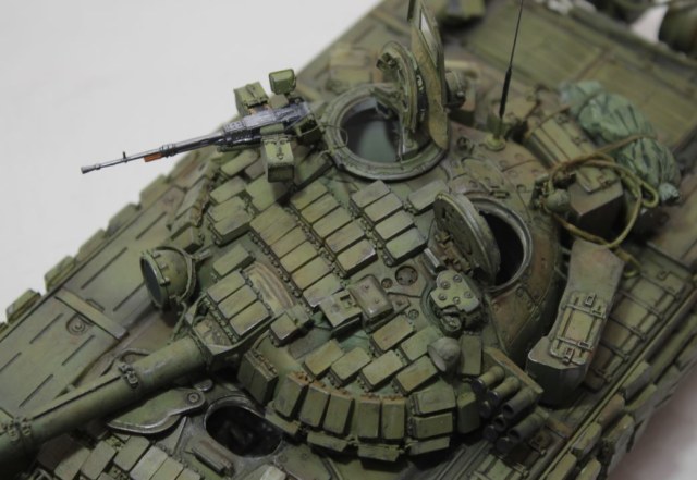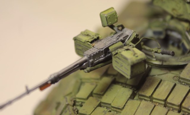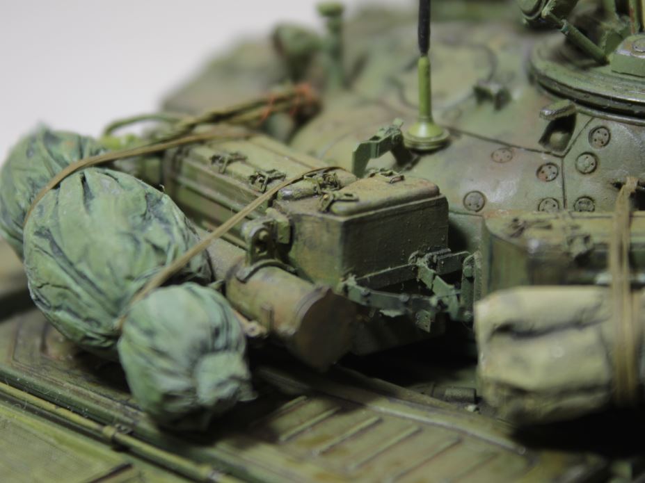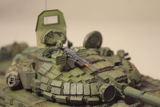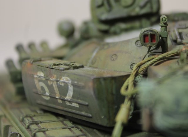 Модель задумывалась для диорамы на тему Чечни. По этой причине модель не "пакчаная", т.к. все зависит от цвета и фактуры грунта на предполагаемой диораме. Плюс есть сюжетные фишки, например, лежащий на крышке МТО пустой цинк от пулеметной ленты. Командирская башенка с пулеметом развернута вперед (Вроде как был интенсивный бой с использованием КПВТ, надо бы еще россыпь гильз симитировать).