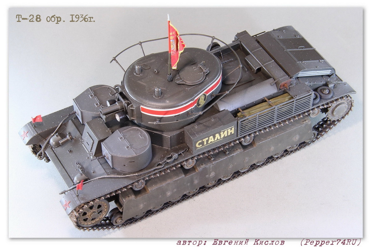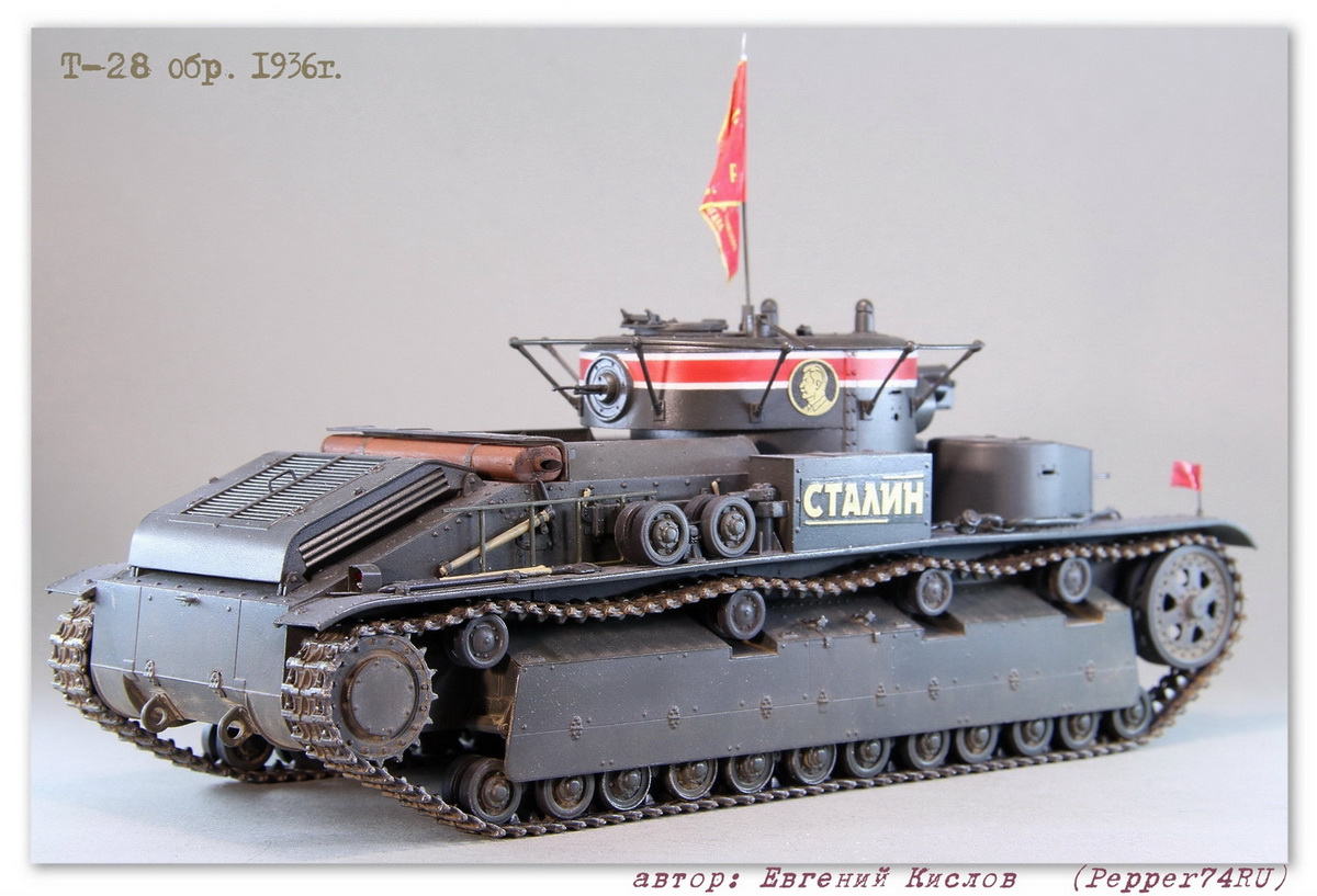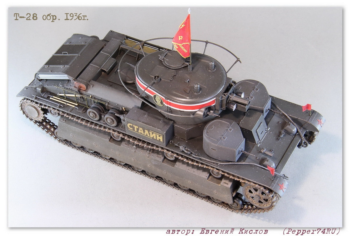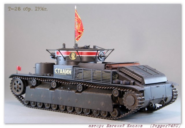 Именной танк Т-28 «Сталин» (выпуск 1936г.), в парадной окраске 7 ноября 1938г. Т-28 (1936 г.) - трёхбашенный советский средний танк межвоенного периода. вооружение - 76.2-мм КТ-28, 4-5 пулемётов ДТ. Осенью 1935 года в СКБ-2 начались работы по созданию «скоростной машины Т-28». Планировалось улучшить скоростные и манёвренные качества танка за счёт переконструирования бортового редуктора и коробки передач. После необходимых доработок в мае 1936 года комиссия под председательством командира 6-й тяжёлой танковой бригады полковника Лизюкова провела испытания «скоростной машины Т-28 «Сталин», заводской № С-910». Удалось поднять скорость танка до 56 км/ч по шоссе и 46 км/ч по рокаде. С июня по декабрь 1936 года в рамках изготовления серийных танков было изготовлено 52 машины. Для постройки данного прототипа, пришлось немного дорабатывать модель т.к. не всё соответствовало прототипу: - переделал буксировочные проушины - Частично заменил заклёпки и болты а также добавил недостающие - изготовил новые талрепы - сделал скатку и лестницу - заменил ствол пушки на точёный Из дополнений использовал: болты, заклёпки (Master Club), фототравление (ACE), Ствол пушки, (Magic-Models) Это уже второй Т-28 «Сталин», в этот раз учёл некоторые косяки котроые не были устранены на прошлой модели, в связи с нехваткой информации. А также был учтён момент с цветом, в этот раз использовал цвет серо-зелёный 3Б (ZIPmaket) В данный момент, модель заняла почётное место в коллекции моего друга