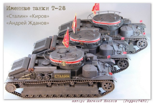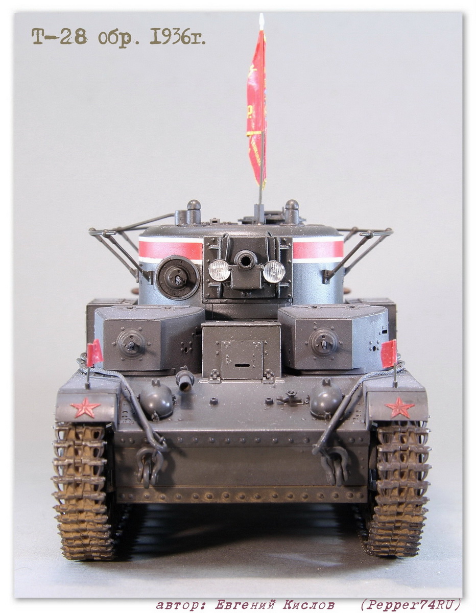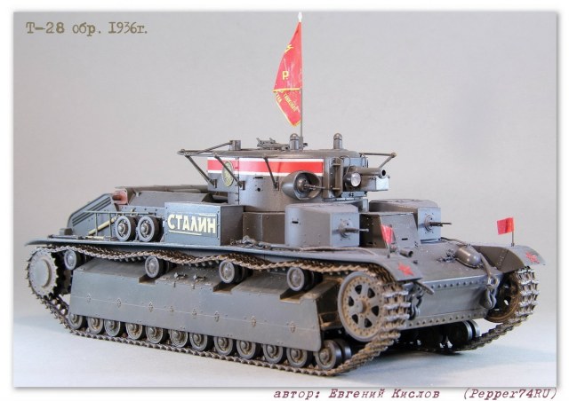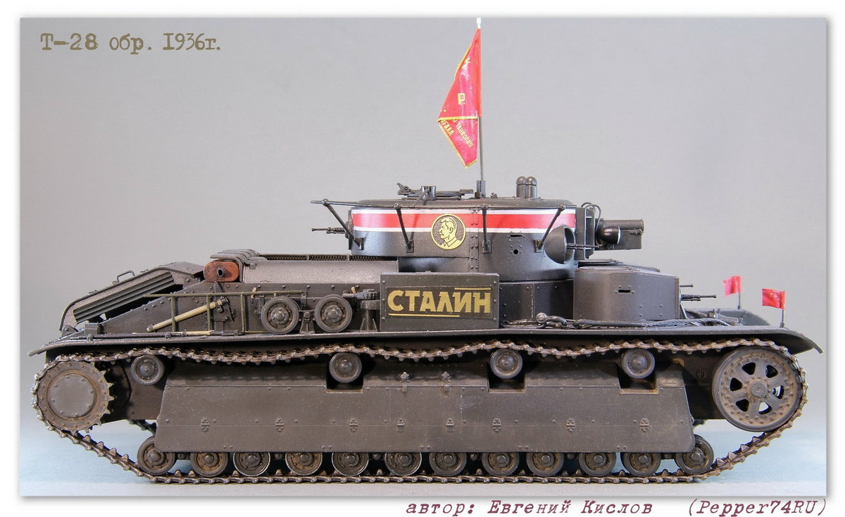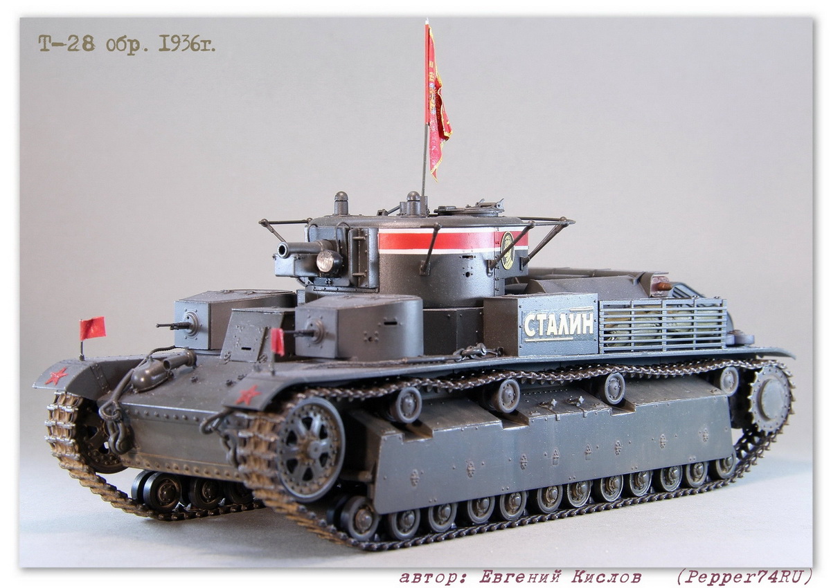 Именной танк Т-28 «Сталин» (выпуск 1936г.), в парадной окраске 7 ноября 1938г. Т-28 (1936 г.) - трёхбашенный советский средний танк межвоенного периода. вооружение - 76.2-мм КТ-28, 4-5 пулемётов ДТ. Осенью 1935 года в СКБ-2 начались работы по созданию «скоростной машины Т-28». Планировалось улучшить скоростные и манёвренные качества танка за счёт переконструирования бортового редуктора и коробки передач. После необходимых доработок в мае 1936 года комиссия под председательством командира 6-й тяжёлой танковой бригады полковника Лизюкова провела испытания «скоростной машины Т-28 «Сталин», заводской № С-910». Удалось поднять скорость танка до 56 км/ч по шоссе и 46 км/ч по рокаде. С июня по декабрь 1936 года в рамках изготовления серийных танков было изготовлено 52 машины. Для постройки данного прототипа, пришлось немного дорабатывать модель т.к. не всё соответствовало прототипу: - переделал буксировочные проушины - Частично заменил заклёпки и болты а также добавил недостающие - изготовил новые талрепы - сделал скатку и лестницу - заменил ствол пушки на точёный Из дополнений использовал: болты, заклёпки (Master Club), фототравление (ACE), Ствол пушки, (Magic-Models) Это уже второй Т-28 «Сталин», в этот раз учёл некоторые косяки котроые не были устранены на прошлой модели, в связи с нехваткой информации. А также был учтён момент с цветом, в этот раз использовал цвет серо-зелёный 3Б (ZIPmaket) В данный момент, модель заняла почётное место в коллекции моего друга
