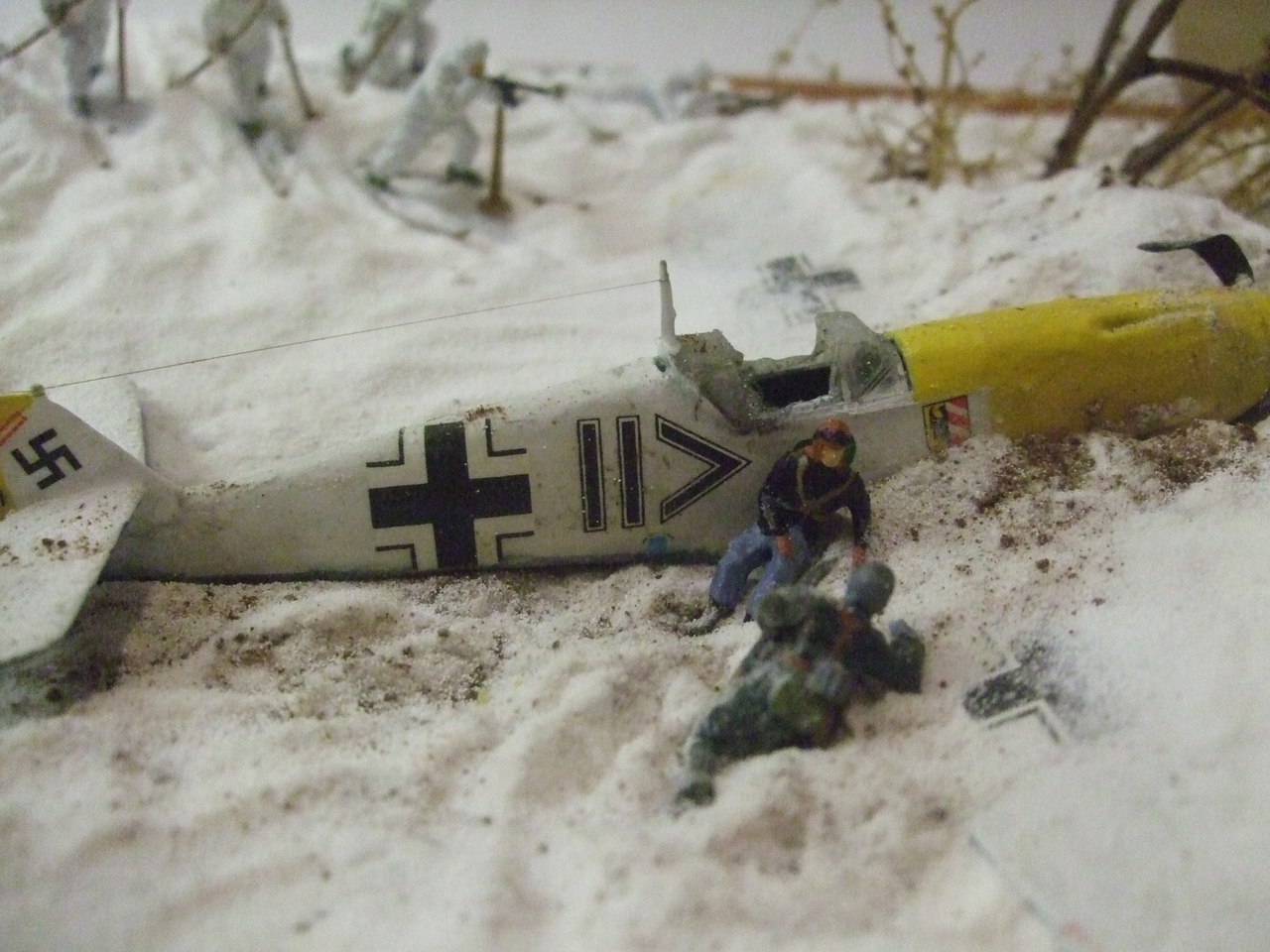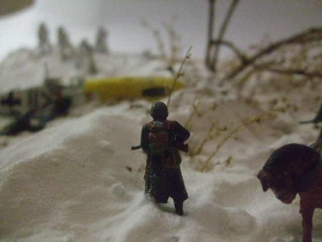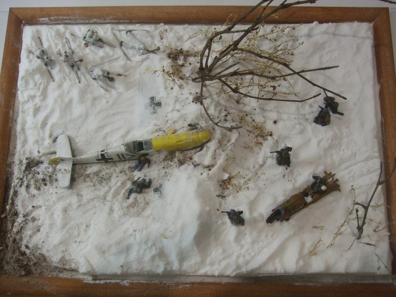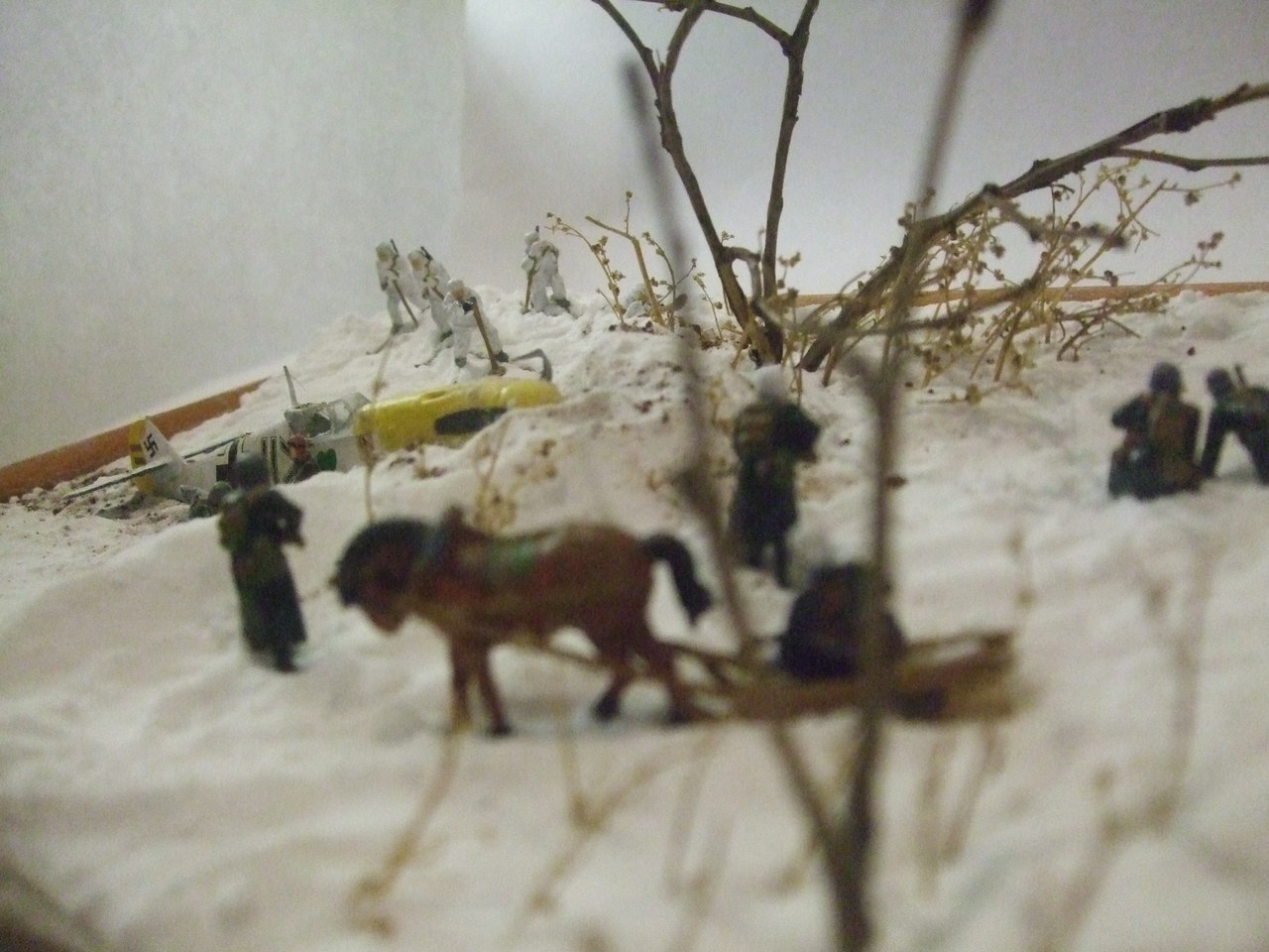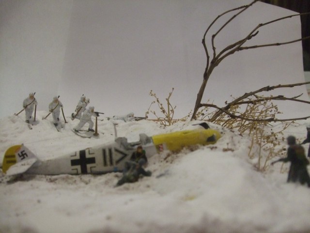 Ландшафт: картон, ПВА, сода, модельный снег от ЗИП, кофе растворимый. Дровни самодельные. Bf-109, советские лыжники и немецкая пехота звездинские, лошадь и пилот ревеловские, часть немцев из цезаревского танкового десанта, травленка на самолёт от микродизайна. Винт сам делал вместо "родного".