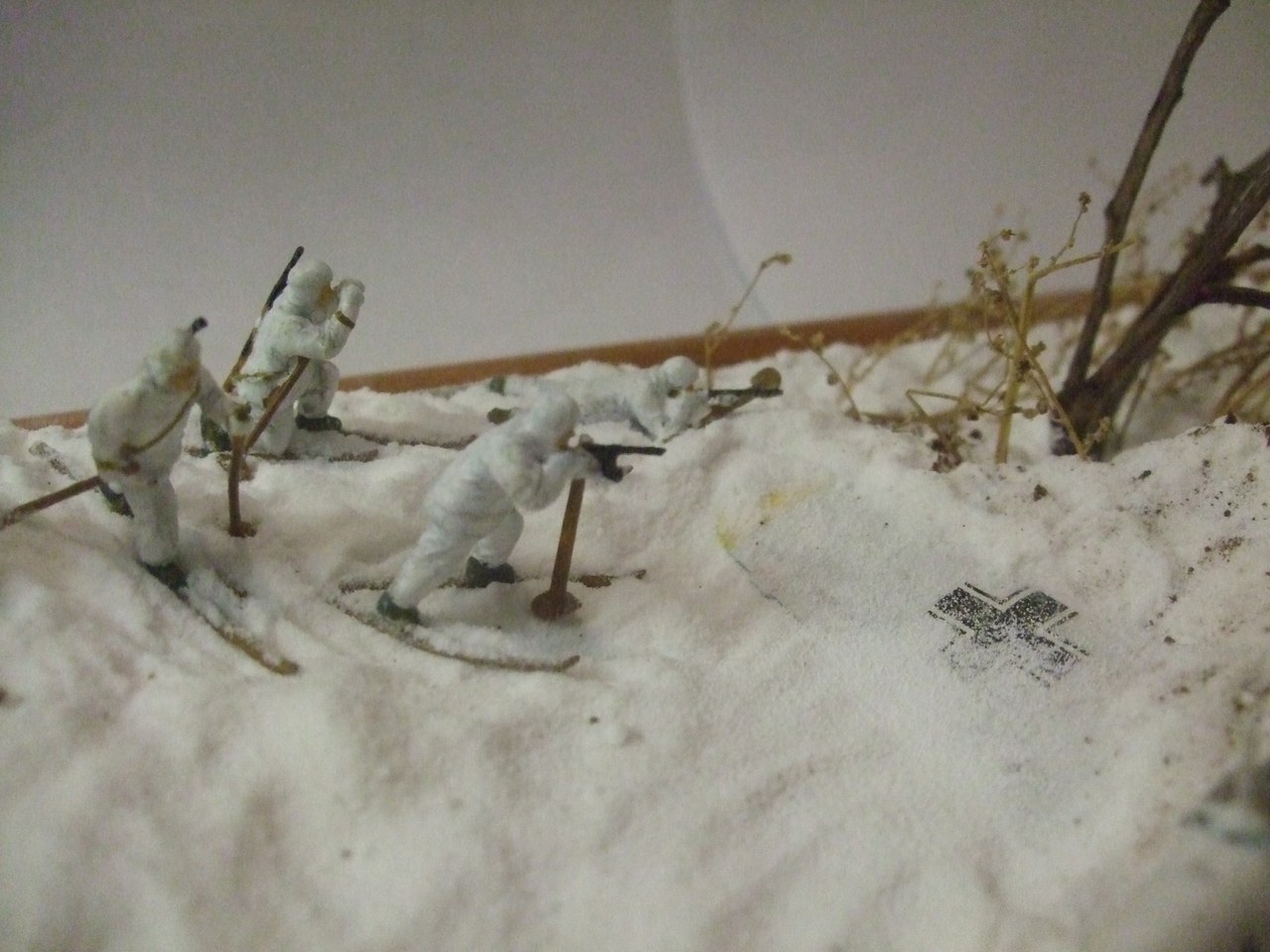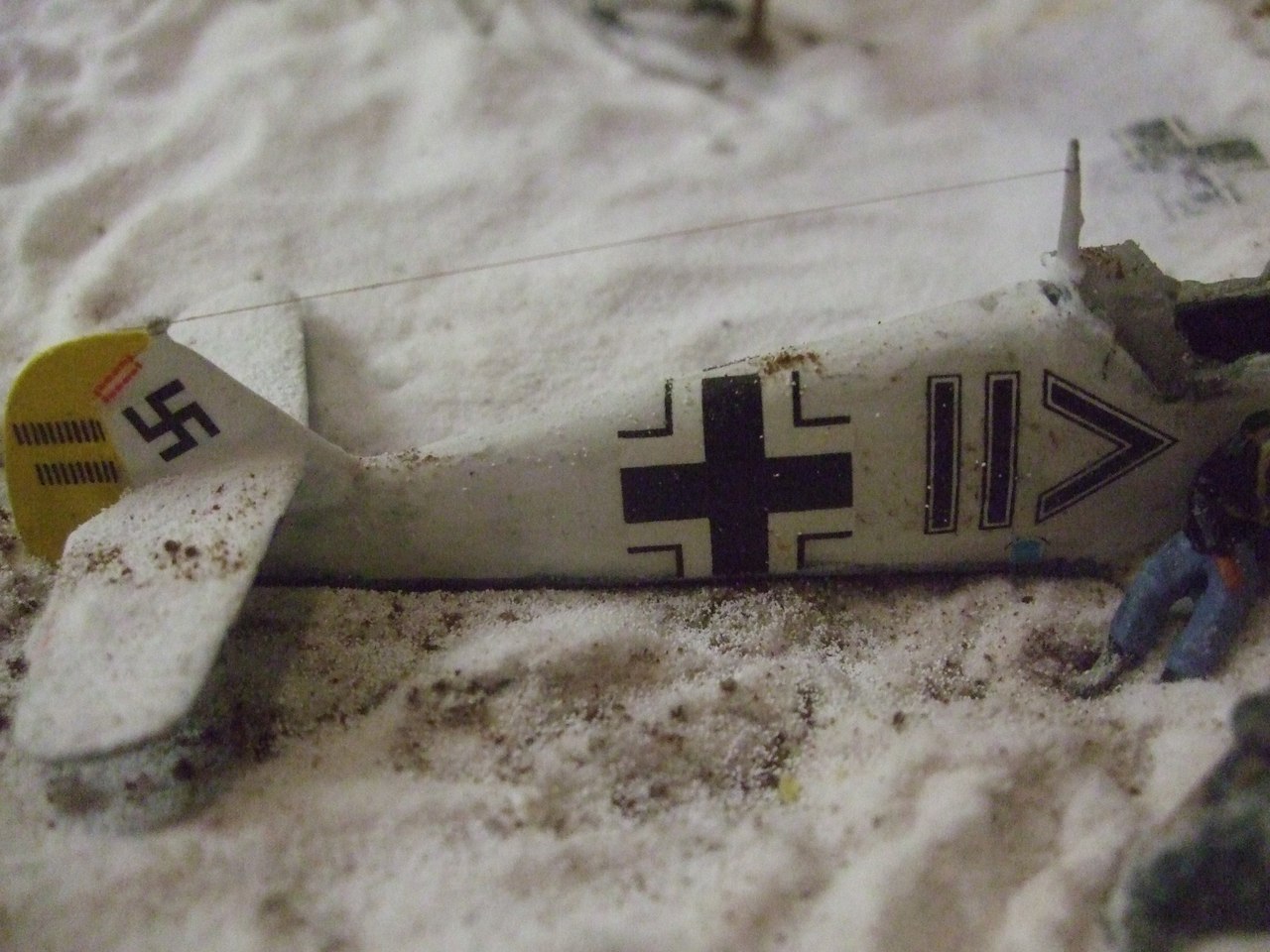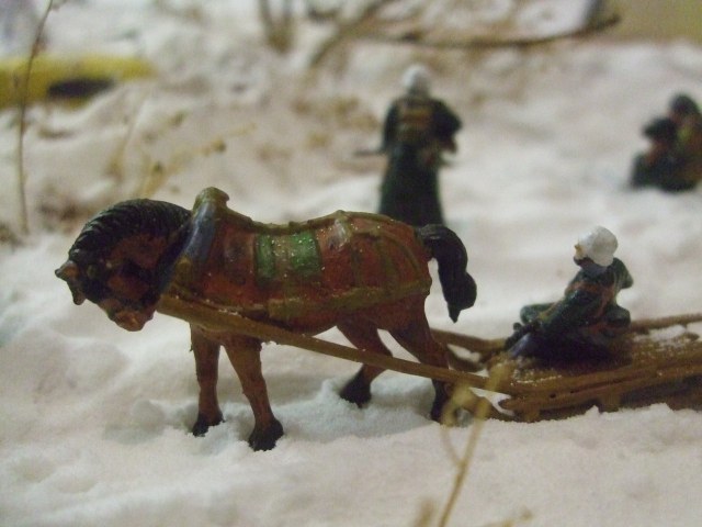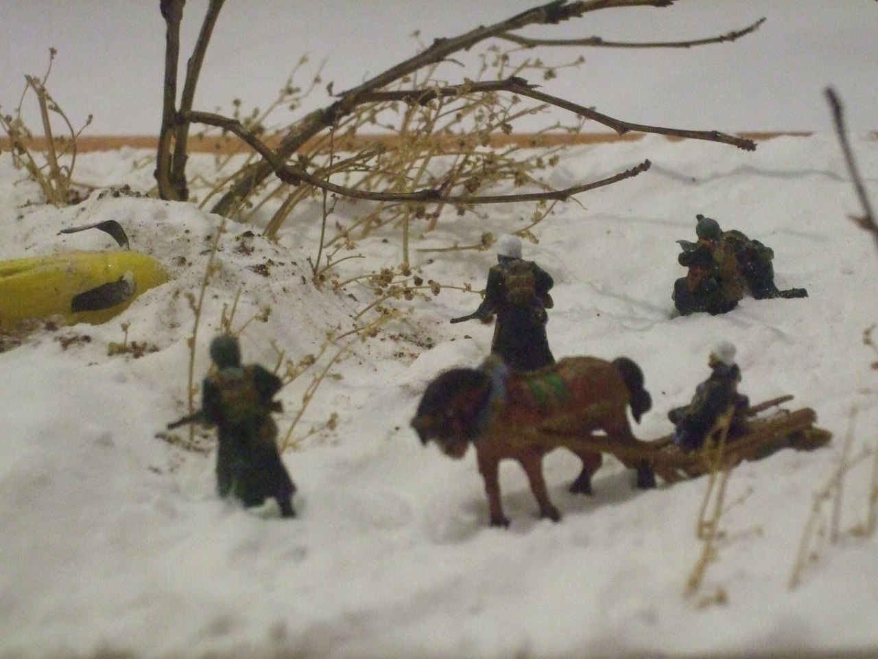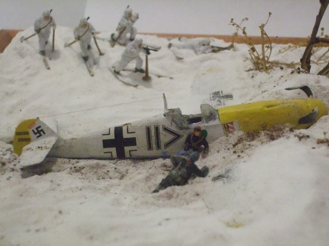 Ландшафт: картон, ПВА, сода, модельный снег от ЗИП, кофе растворимый. Дровни самодельные. Bf-109, советские лыжники и немецкая пехота звездинские, лошадь и пилот ревеловские, часть немцев из цезаревского танкового десанта, травленка на самолёт от микродизайна. Винт сам делал вместо "родного".