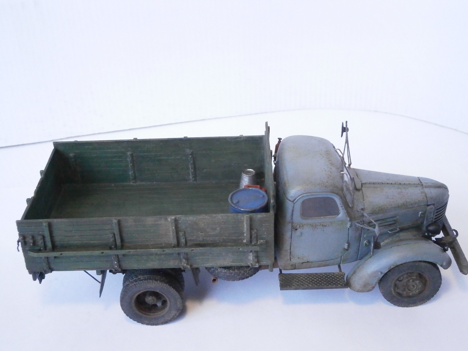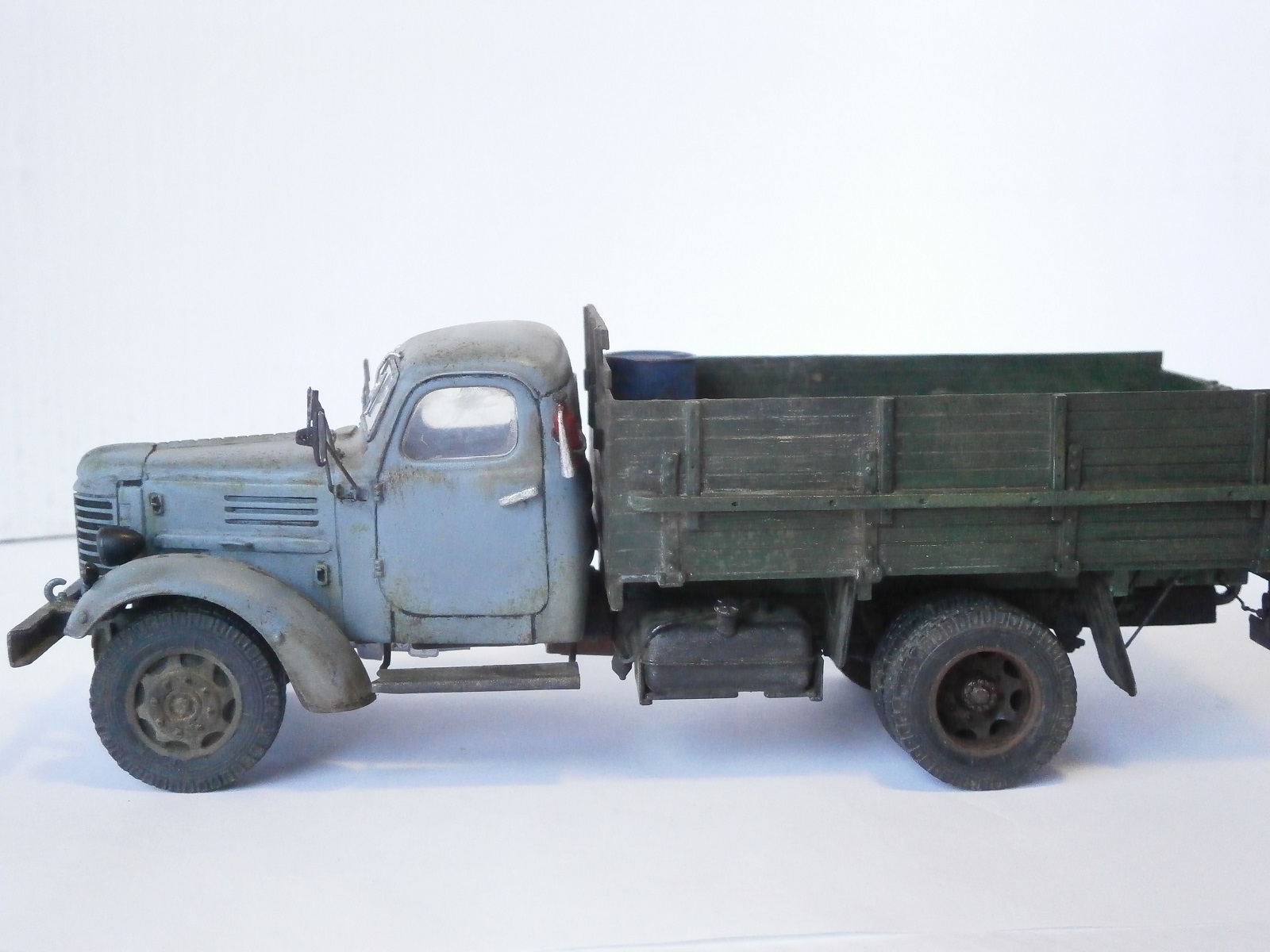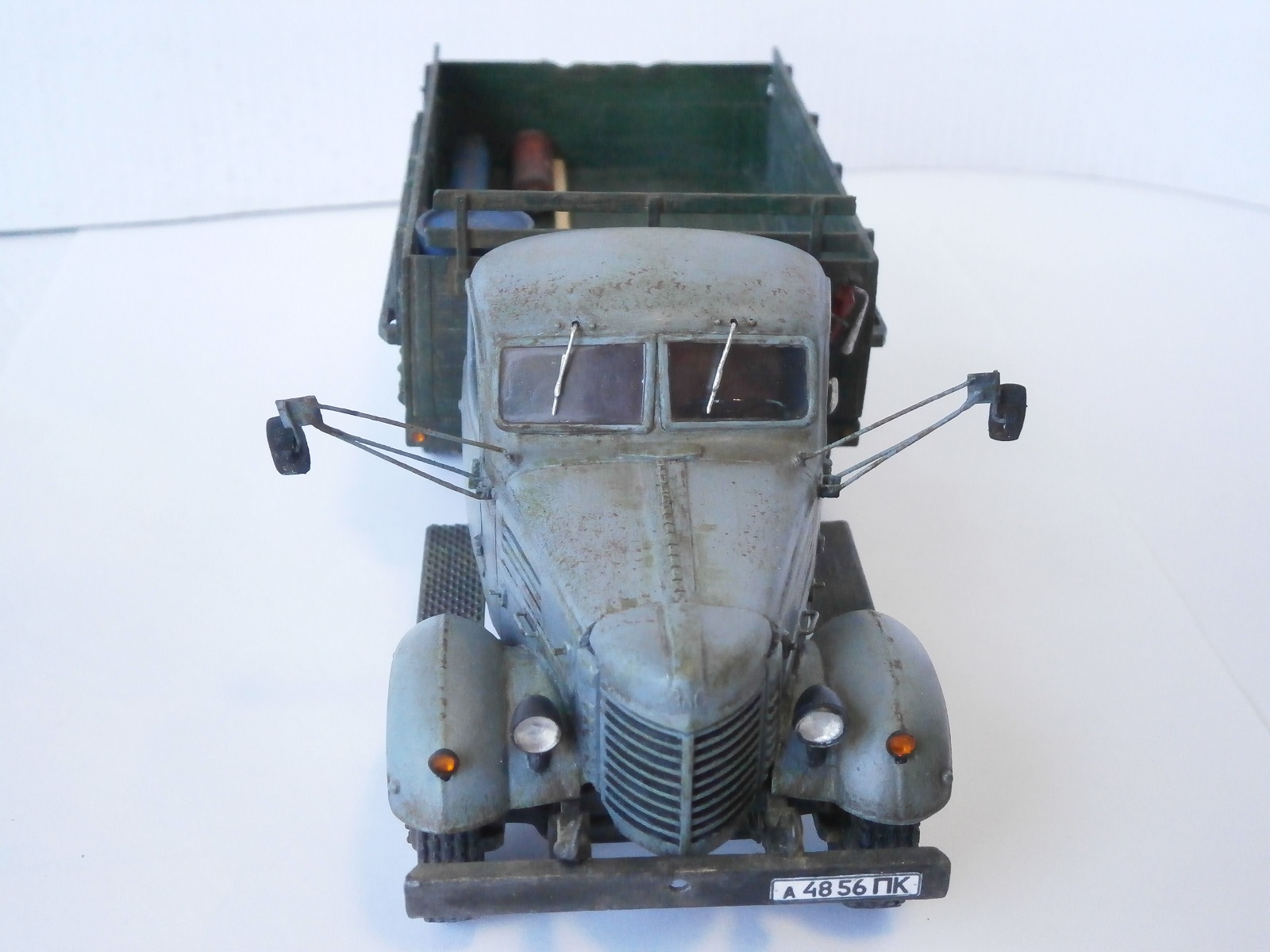 Доброго времени суток! Представляю очередной продукт соей переработки вторсырья. Новые только смоляные крылья(Armor) и смоляные колёса и решётка радиатора(R.I.M). Использовалась б\у кабина от ЗиС-151(Звезда), все остальное сделано из остатков моделей и различного хлама. Тент сделан из влажной салфетки,результат мне не нравится.Прототипа у грузовика нет.