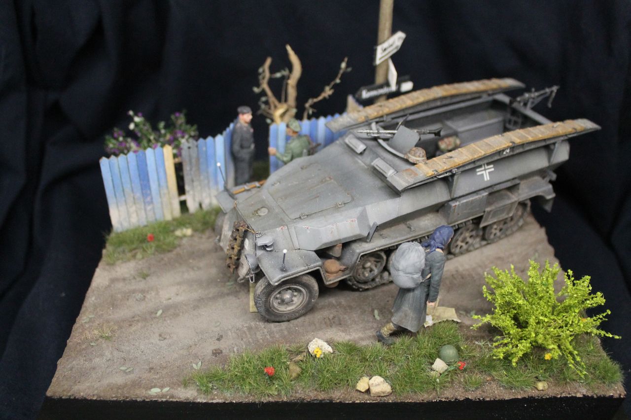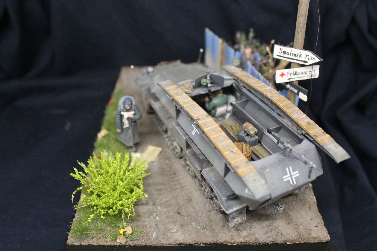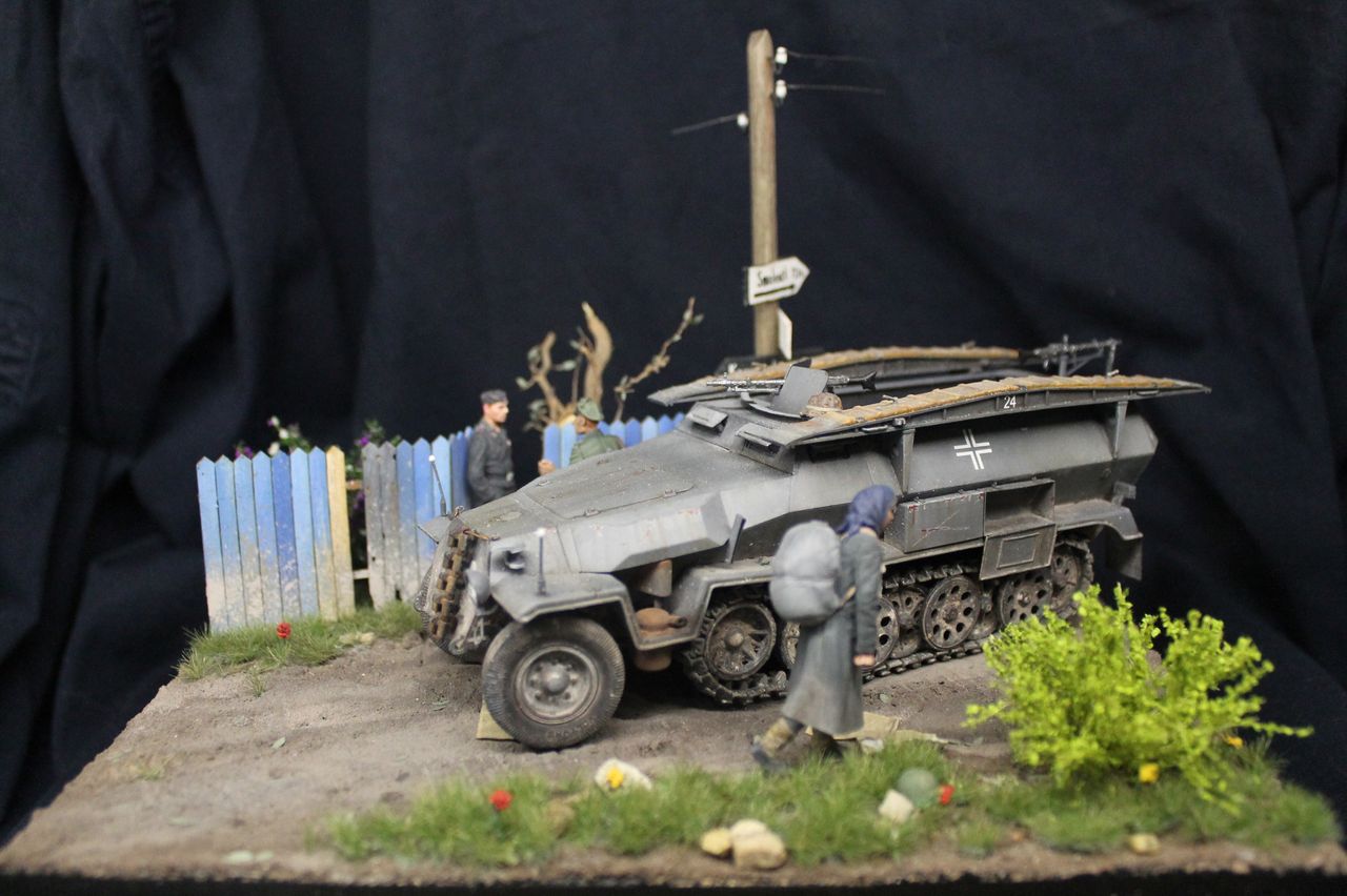 Наконец то закончил свою первую в модельной практике диораму. Сам ханомаг - драгоновский исходник,обильно справленный травлением от lion roar и колесами PanzerArt. Массовка - танк,сога,сталинград. Радист в бтр -резиновое изделие от того же драгона. Основание собрано из фоторамки и линеек,после покрыто текстурной пастой от зипмакет и тонировано пигментами и жижками. трава - миг аммо,кустики от Дмитрия Тебенькова,забор -зипмакет. Дерево и столб с указателями - самодел. Сам расцениваю получившиеся не как диораму,но больше как подставку,на которой можно отфотографировать что либо из немецкой техники на ранний период войны. Несмотря на некоторые трудности и типичные ошибки для новичка жанра,работа над ней мне пришлась по душе. Как то так.