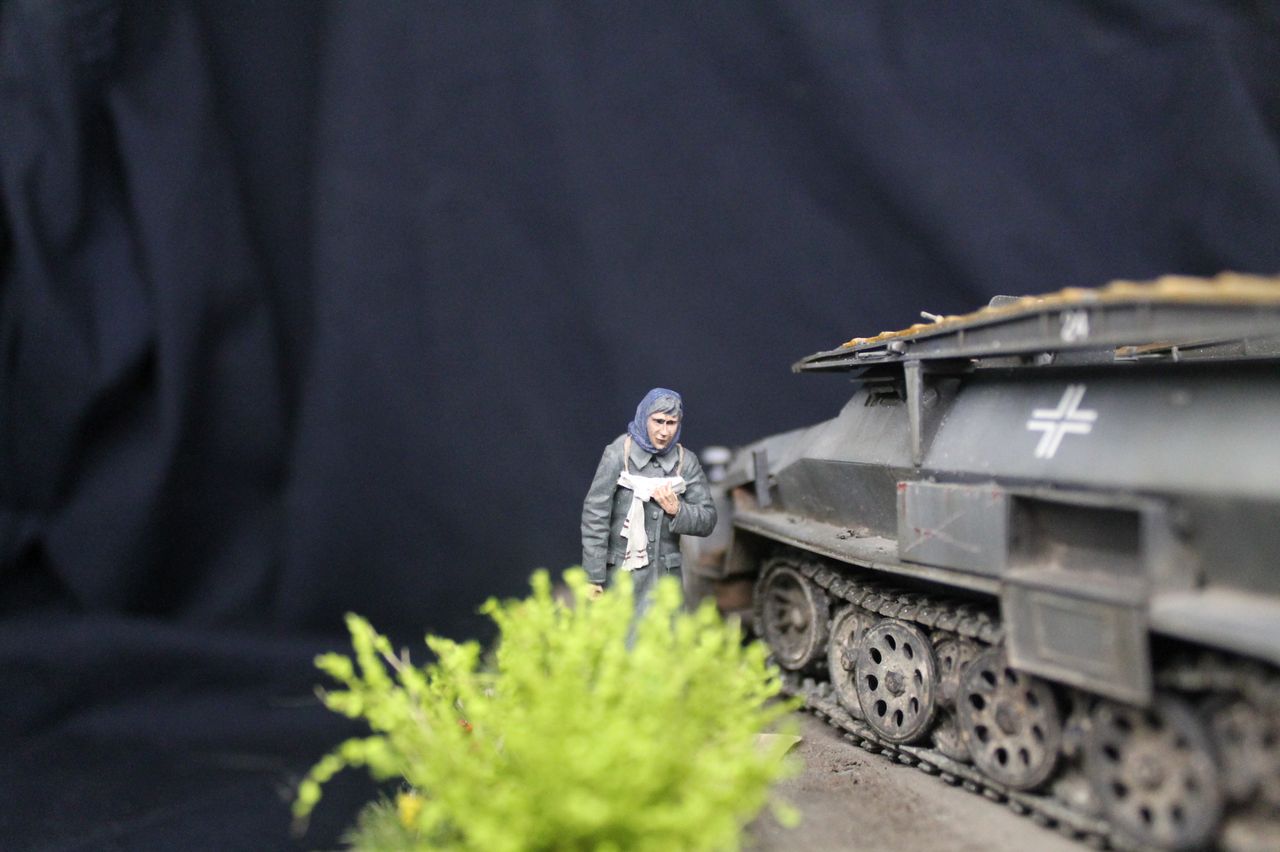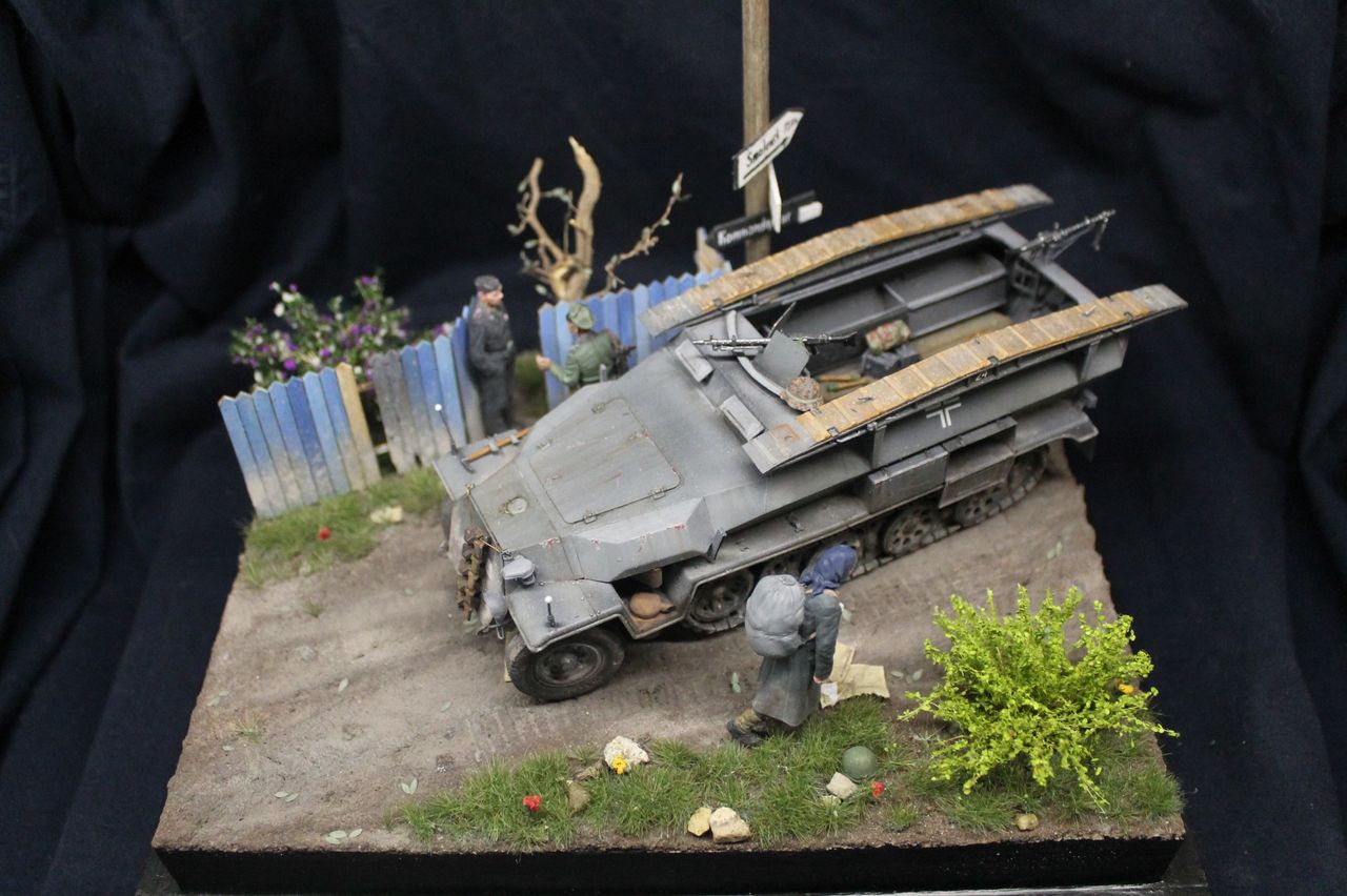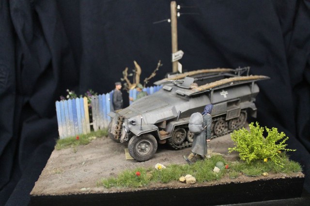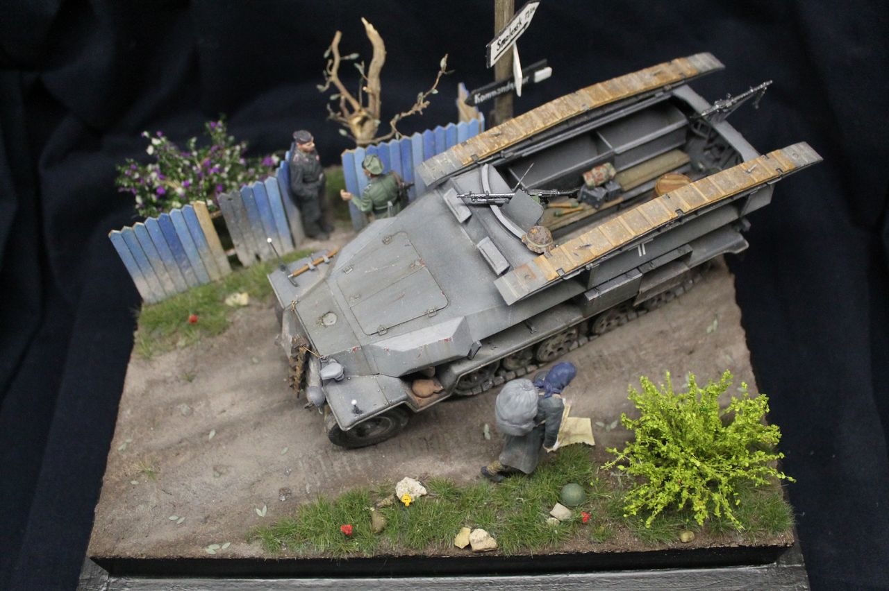 Наконец то закончил свою первую в модельной практике диораму. Сам ханомаг - драгоновский исходник,обильно справленный травлением от lion roar и колесами PanzerArt. Массовка - танк,сога,сталинград. Радист в бтр -резиновое изделие от того же драгона. Основание собрано из фоторамки и линеек,после покрыто текстурной пастой от зипмакет и тонировано пигментами и жижками. трава - миг аммо,кустики от Дмитрия Тебенькова,забор -зипмакет. Дерево и столб с указателями - самодел. Сам расцениваю получившиеся не как диораму,но больше как подставку,на которой можно отфотографировать что либо из немецкой техники на ранний период войны. Несмотря на некоторые трудности и типичные ошибки для новичка жанра,работа над ней мне пришлась по душе. Как то так.
