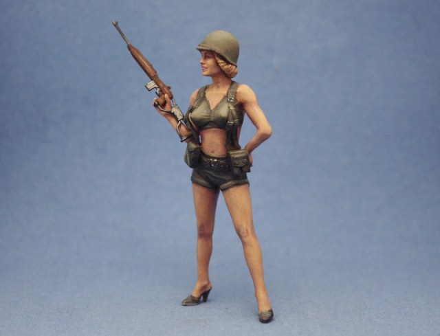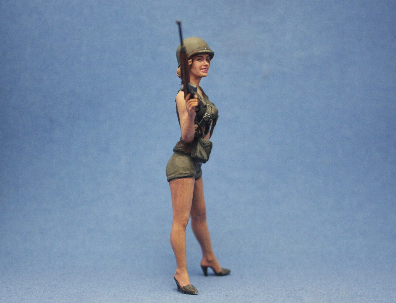 Закончила пин-ап девицу в масштабе 1/24 (75 мм). Сперва попробовала расписать её маслом, но мне не удалось добиться достаточного качества теней, к тому же масло легло рельефом. Уже высохшее масло я обработала наждачной бумагой, после чего доработала фигурку темперными красками.