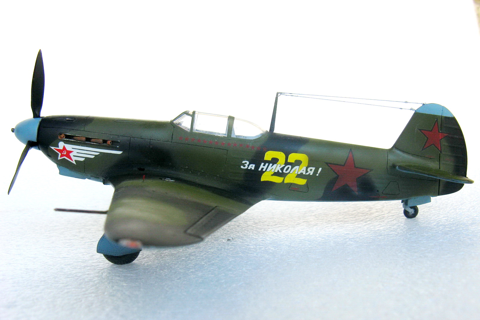 На счет кривизны не согласен, там все в порядке, а вот форма да, не соответствует. Если найду лопасти от "сбитого МиГ-3" (там лопасти из жести, а коробочные, должны остаться), то переделаю, а если не найду, оставлю как есть.