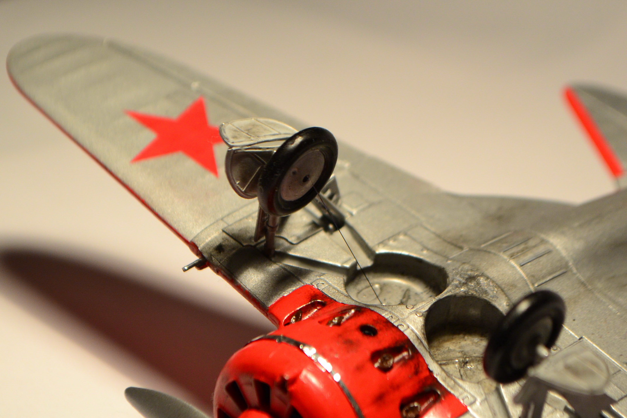 По прототипу, даже начинать не хочу, - завал полный. Там и элероны были длиннее, и посадочных щитков не было, не было верхних пулеметов и их обтекателей. не было правой дверцы пилота и люка доступа к р/станции. и это только то, что меняет внешний вид модели. Трос уборки шасси был кольцевой и снаружи обтекателей должны быть еще короткие тросы.