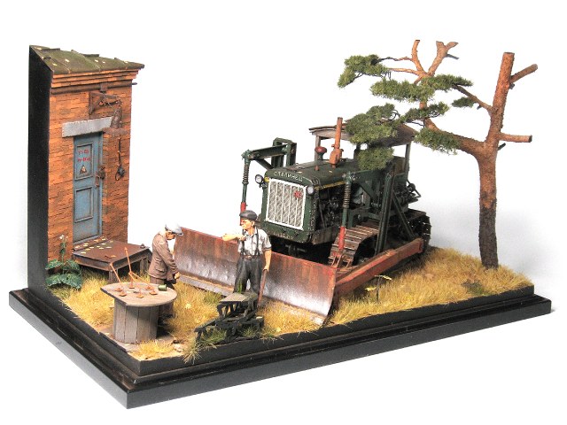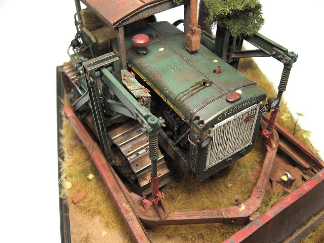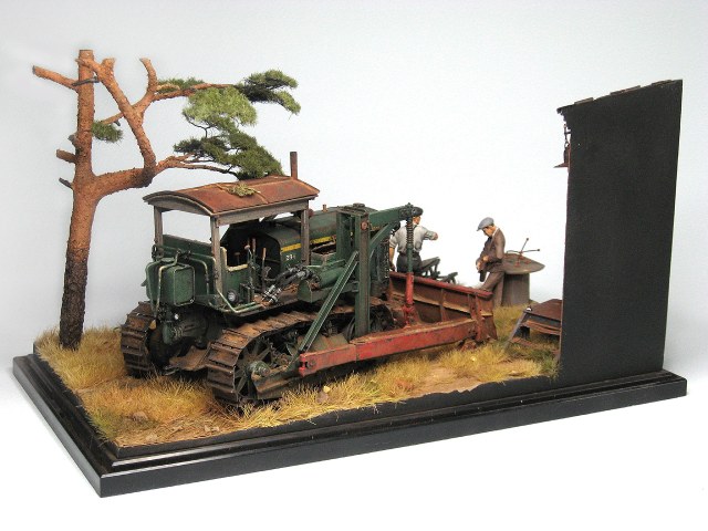Уважаемые коллеги по хобби, хочу представить вам мою последнюю работу в основе которой довоенный бульдозер Д-54 на базе трактора С-65. Набор от Trumpeter'a я купил лет пять назад вместе с мотором LZ-Models, в надежде перепилить его в более поздний трактор Т-100М, но при ближайшем рассмотрении оказалось, что использовать для этой цели можно разве что гусеницы, но и в них не хватает колличества траков. Сам "Сталинец" меня не интересовал, поэтому набор лег на полку на долгое время. В конце концов я решил собрать его с довоенным прицепным катком Д-126 от Red Iron, но как то не хватало сил начать его. И вот как то в поиске информации по послевоенной строительно-дорожной технике попалось мне описание довоенного бульдозера БГМ (бульдозер гидравлический модернизированный), имевшего индекс Д-54, и ставившегося на трактора С-60 и С-65. Я обратился к человеку, у которого был атлас конструкция дорожных машин 1954 года издания, и благодаря ему получил чертежи этого бульдозера. Идея построить бульдозер вызвала интерес, к тому же возникла идея сделать машину интереснее, путем установки самодельного навеса. Сама конструкция навеса подсмотрена у американцев на стареньком Caterpillar D-7. А идею сделать его деревянным подсказал мне отец, припомнивший такой трактор из своего детства. Еще один толчек дала цветная фотография катков при строительстве сталинской высотки в Москве на "Красной Пресне". В результате сложилась концепция позволяющая построить на базе , в общем то, довольно скучного и, наверно, самого безликого в линейке ЧТЗ трактора "Сталинец-65" интересного агрегата. Постройка велась со спортивным интересом избежать использования 3d печати в работе, что и удалось. В модели 3d печать использовалась только для создания штуцеров на гидавлических трубках, для добавления модели проработанности. Все остальное сделано из уголков Evergreen, листового пластика Tamiya, листовой меди, проволоки и секций телескопической антенны, а так же болтиков Masterclub. Для создания подставки использовано основание которое коллега Velik отлил для своей самоходки М110. Здание склеено из кусков здания с другой моей диорамы "Воскрешение" и листового пластика. Сосна сделана из сосновой ветки, проволоки 0,12мм, стальной шерсти и пучков травы Modelscene. На подставке использована трава Fredericus Rex, Modelscene и Modellers of Fortune. Лапух сделан из проволоки 0,12 мм и тонкой алюминиевой фольги. Окрашено все красками Tamiya и Vallejo, оттонировано смывками MIG и AK и запигменчено пигментами MIG и AK.