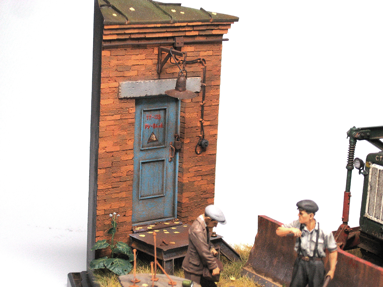Владислав, благодарю за развернутый комментарий. Вообще говоря, меня особо не смущает обрезаность предметов, они должны только давать импульс фантазии зрителя, но в данном случае соглашусь, лучше бы смотрелась целая катушка. Металлические столбы уместить целиком на диораме не получилось бы в любом случает. Но, возвращаясь к катушке, ее пришлось выдвинуть за границу диорамы иначе уж слишком мало места было бы для фигурок. Картуз у работяги приклеен вместо мютце, чтобы изменить наклон пришлось бы наращивать отсутствующую половину головы (старался отделаться малой кровью при перепиле фашистского танкиста в советского работягу). По поводу кирпичной кладки могу сказать только, что надо было на этапе склеивания ее из кирпичей проклеивать все пластиком для расширения щелей с раствором, теперь покрасить кладку и не покрасить раствор невозможно. За историю спасибо
