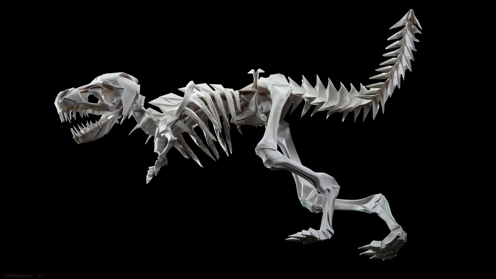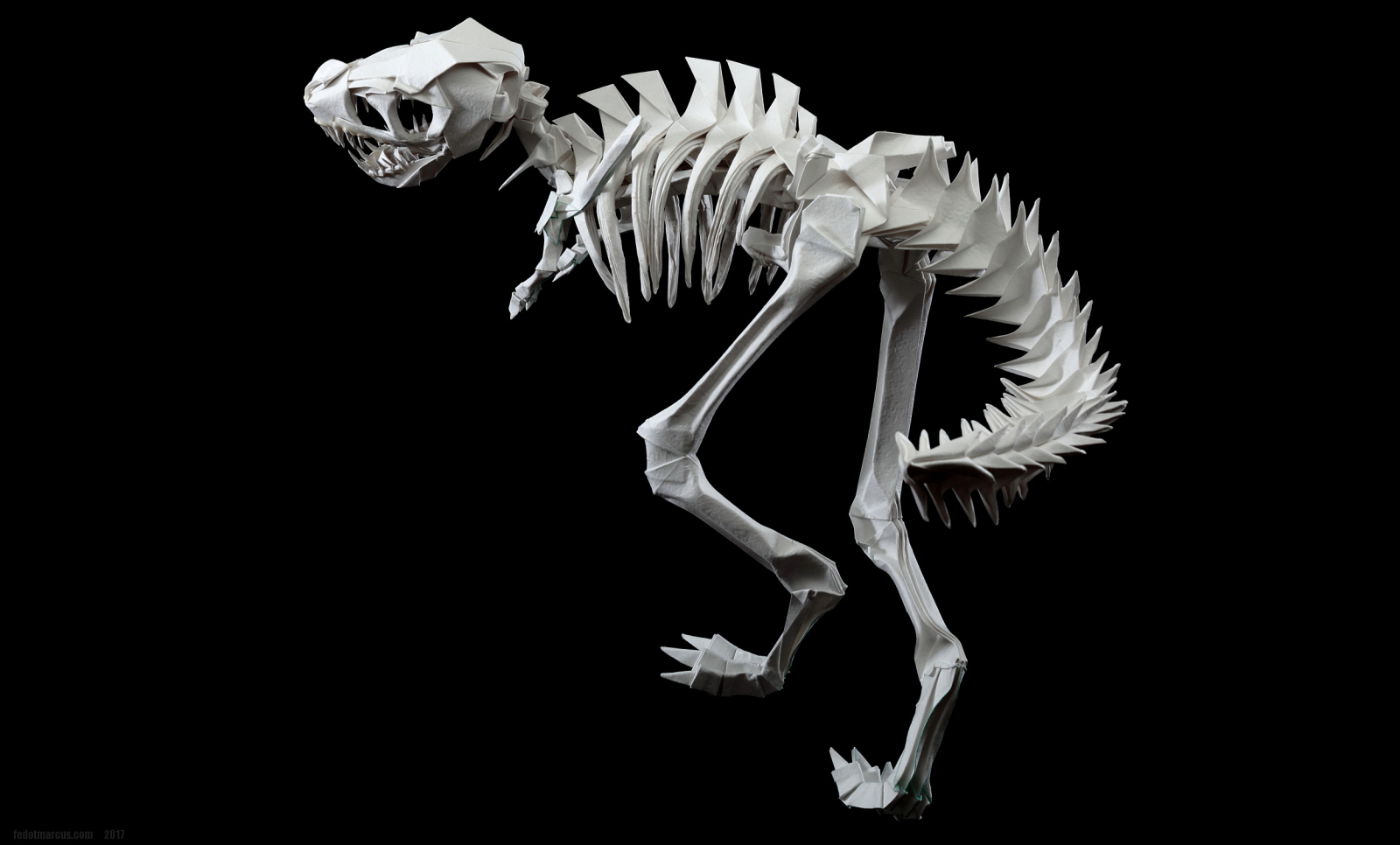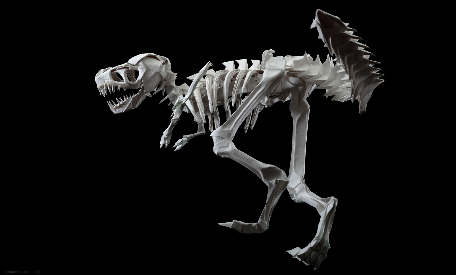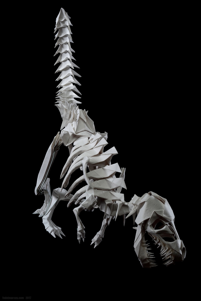 Первые свои скульптуры я делал по такому же принципу… не только динозавров, но и обычных домашних животных. Изучив довольно подробно гетеромодульное оригами, я решил собрать скульптуру, отличавшуюся от того, что делал ранее и не похожее на то, что было у других авторов. А именно – большое число модулей, объёмность, и узнаваемость с любого ракурса. Сложение выполнялось из акварельной бумаги плотностью 210 г/кв.м. Рельефная сторона листа стала лицевой, для придания некоторой «текстуры» костям.