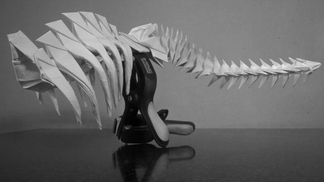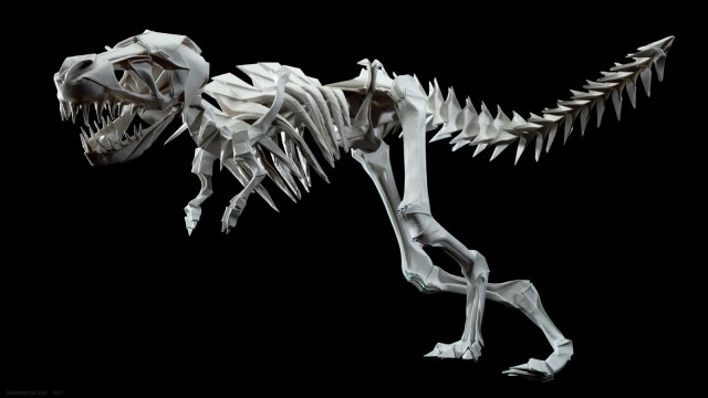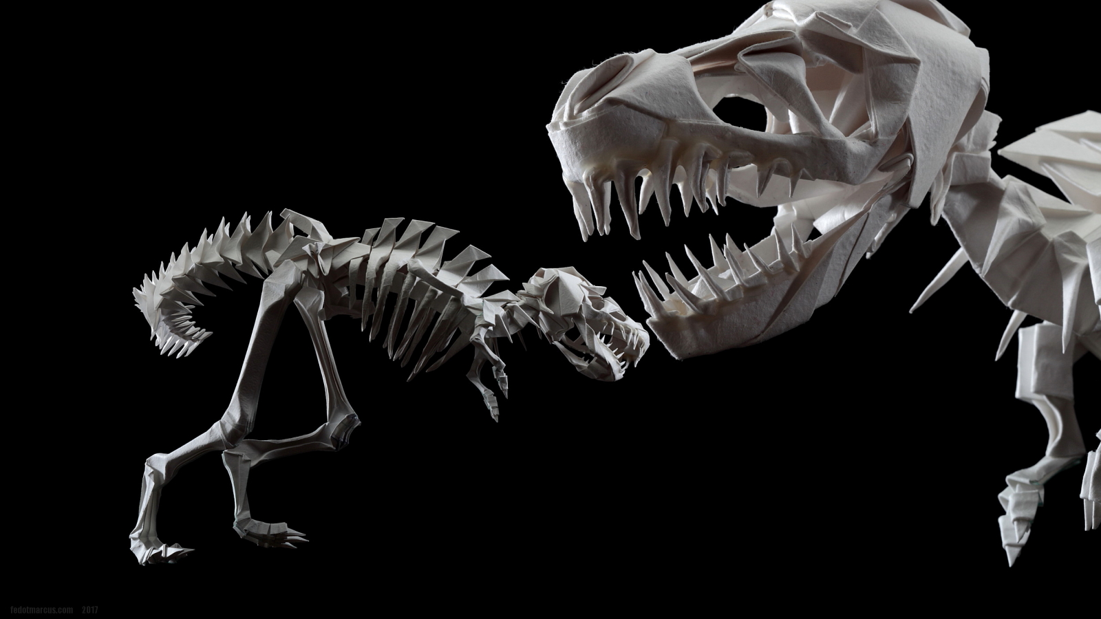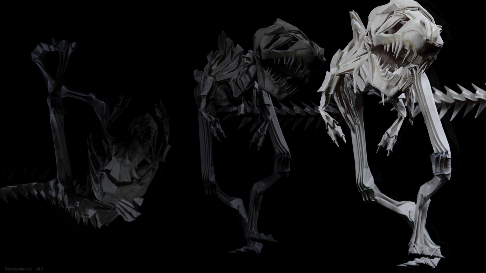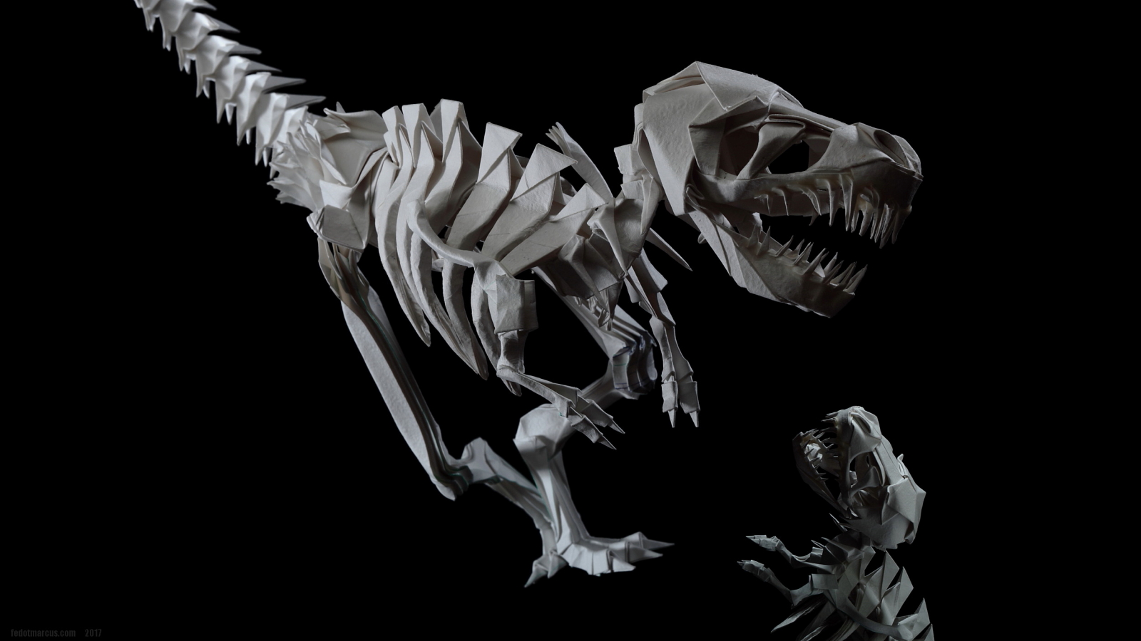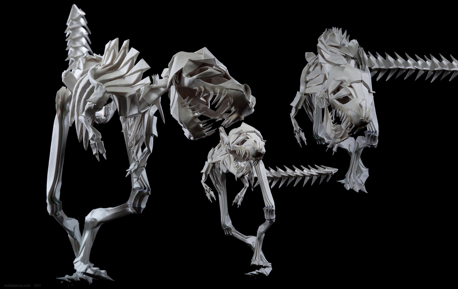 Первые свои скульптуры я делал по такому же принципу… не только динозавров, но и обычных домашних животных. Изучив довольно подробно гетеромодульное оригами, я решил собрать скульптуру, отличавшуюся от того, что делал ранее и не похожее на то, что было у других авторов. А именно – большое число модулей, объёмность, и узнаваемость с любого ракурса. Сложение выполнялось из акварельной бумаги плотностью 210 г/кв.м. Рельефная сторона листа стала лицевой, для придания некоторой «текстуры» костям.