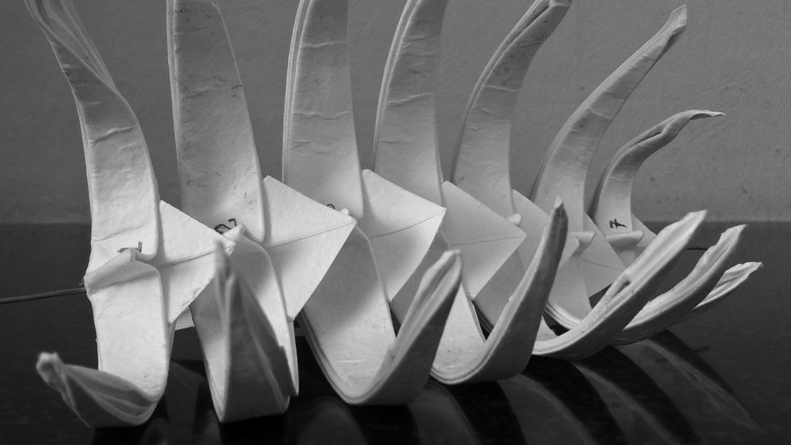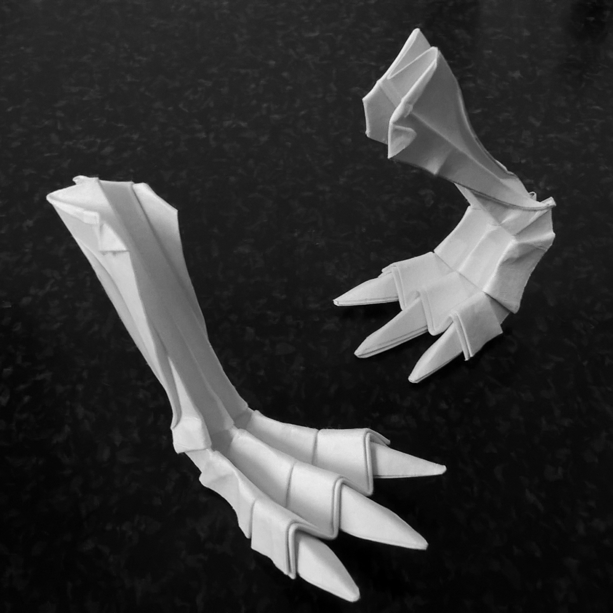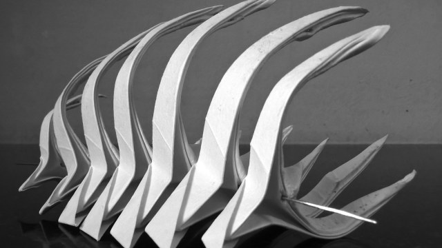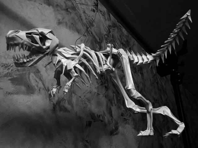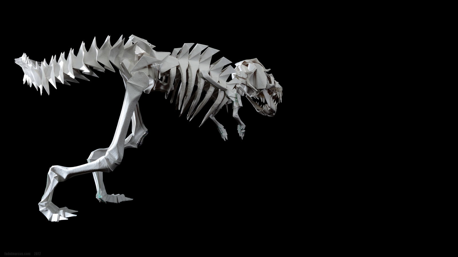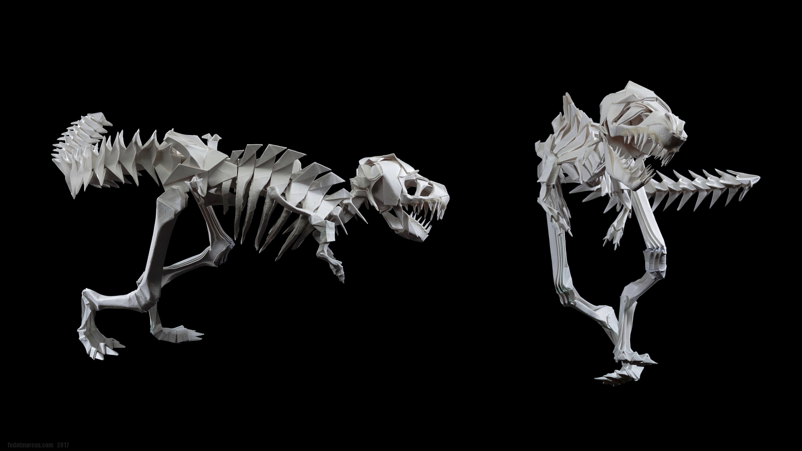 Первые свои скульптуры я делал по такому же принципу… не только динозавров, но и обычных домашних животных. Изучив довольно подробно гетеромодульное оригами, я решил собрать скульптуру, отличавшуюся от того, что делал ранее и не похожее на то, что было у других авторов. А именно – большое число модулей, объёмность, и узнаваемость с любого ракурса. Сложение выполнялось из акварельной бумаги плотностью 210 г/кв.м. Рельефная сторона листа стала лицевой, для придания некоторой «текстуры» костям.