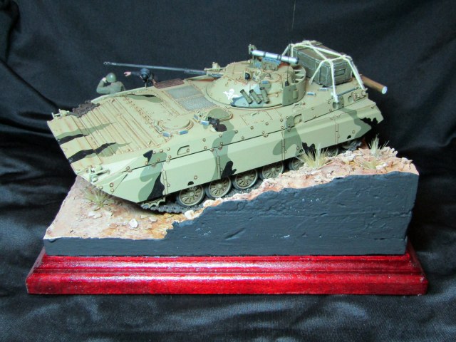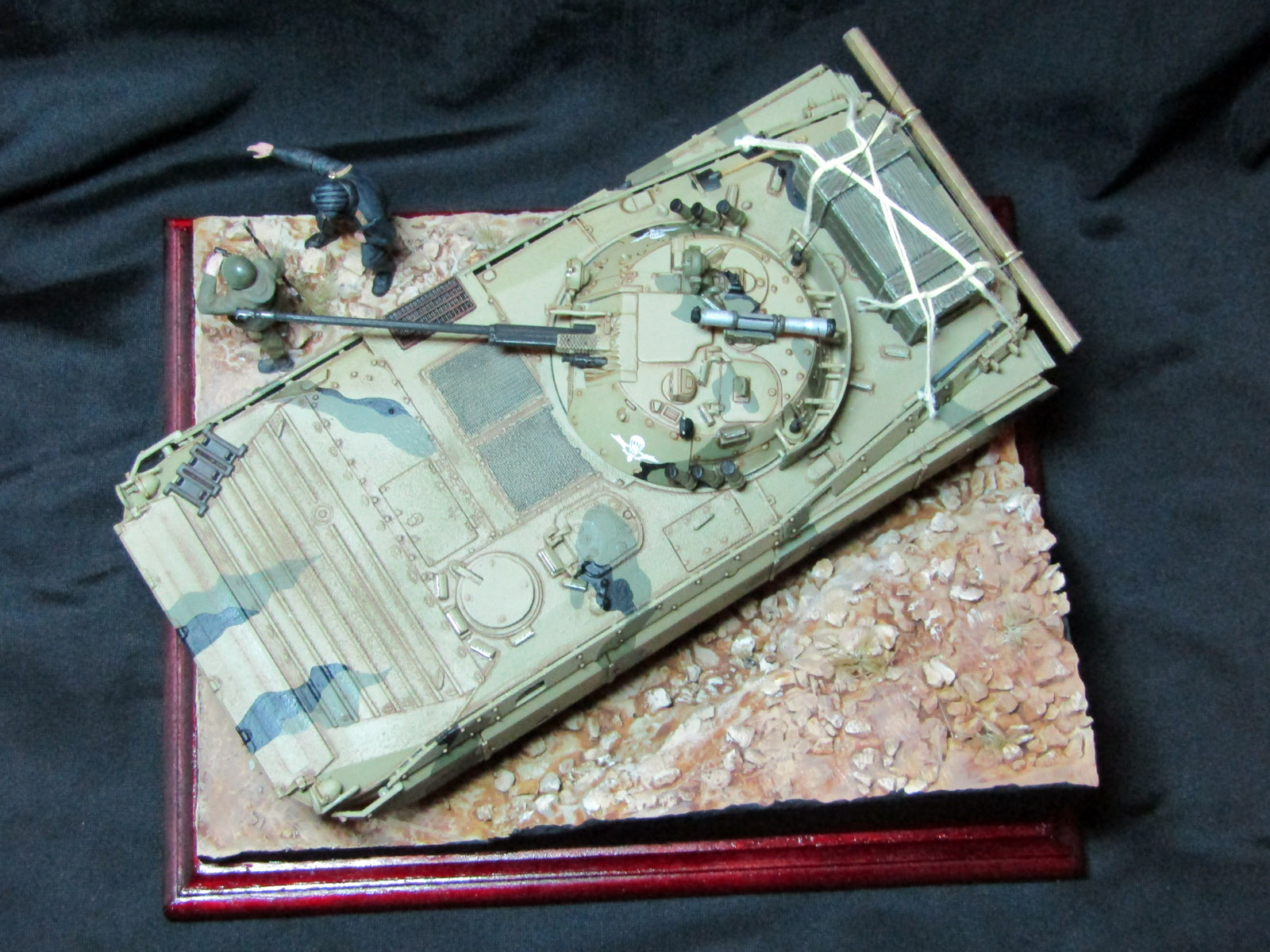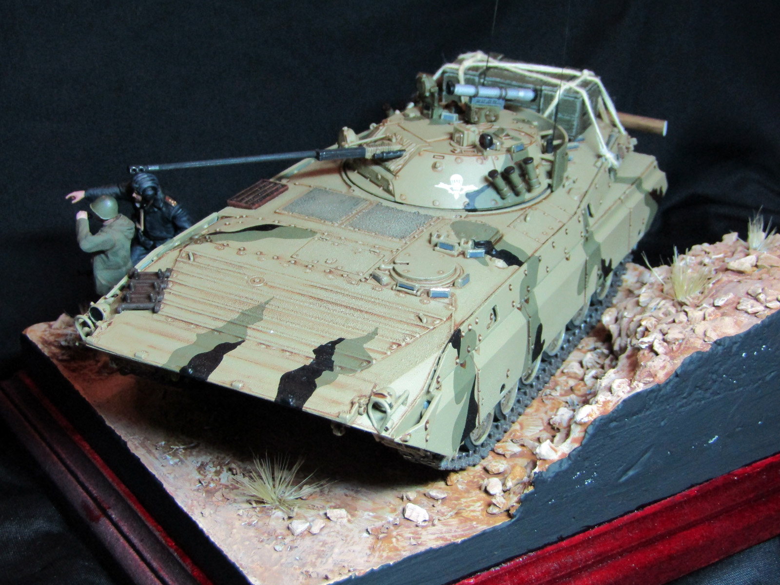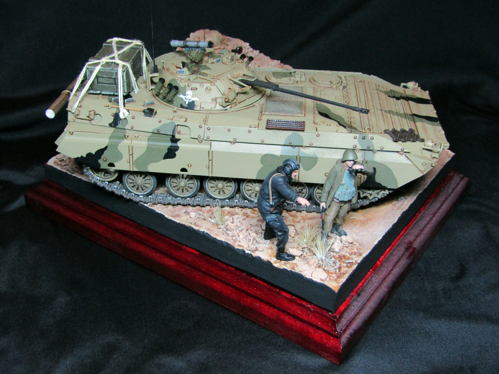 Композицию делал на заказ (попросили сделать данную машину на какой-нибудь подставке). Если честно давно хотелось собрать данный кит, уж очень красивый прототип, на мой взгляд это самая красивая боевая машина пехоты всех времён. Сам по себе кит особых трудностей при сборке не предоставил. Про "косяки" производителя писать не буду всем о них давно известно. Однако, при вскрытии данной коробки всё-же одно серъёзное "Но" неожиданно неприятно удивило меня: ванна в коробке лежала совсем не от "бэхи", и даже не от единички, а представьте себе от легендарного т-72!!! Но это "Но" меня всё-таки не остановило, возвращать или запрашивать у производителя новую деталь не стал, а ради интререса, изготовил на её основе при помощи чертежей Виктора Мальгинова, опубликованных в журнале "М-Хобби" искомое изделие. Правда немного наверное накосячил с интервалом между катками. Вместе с тем, самостоятельно изготовил "жалюзи"-брызговики (не знаю как они правильно называются), расположенные сзади над гусянкой; бревно - палочка производства "суши Wok"; верёвки - из канцелярской нитки; антенны - из тянутого литника; триплексы - из прозрачного листа пластика; расточил пламегаситель на основной пушке и ствол пулемета. Фигурки - также очень хорошего качества, без облоя или утяжин. Зная про неточности изготовителя в форменном обмундирования десантника каких-либо изменений и дополнений вносить не стал. Основание - самодельное, плакетка покрыта лаком, основание из гипса + разнокалиберные камушки и щетина от малярной кисти (трава). По покраске: БМП - всё покрашено кистью на автомобильный грунт "KUDO" акановским и звездовскими акрилами, а также эмалью и матовым лаком "revell", смывка - акварель на "Фейри"; основание и фигурки - ПВХ темпера. Вот собственно и всё описание, приятного просмотра коллеги)...