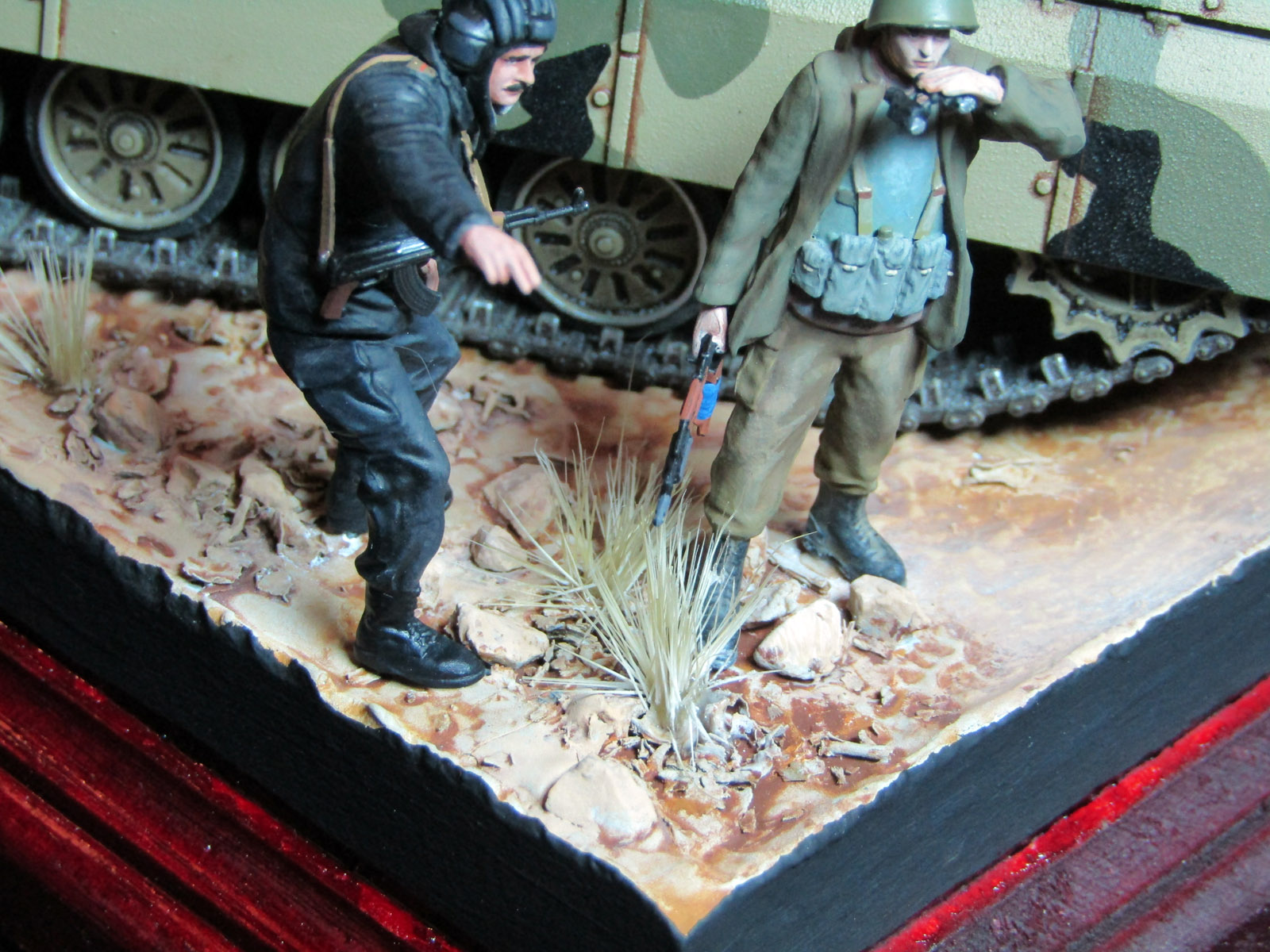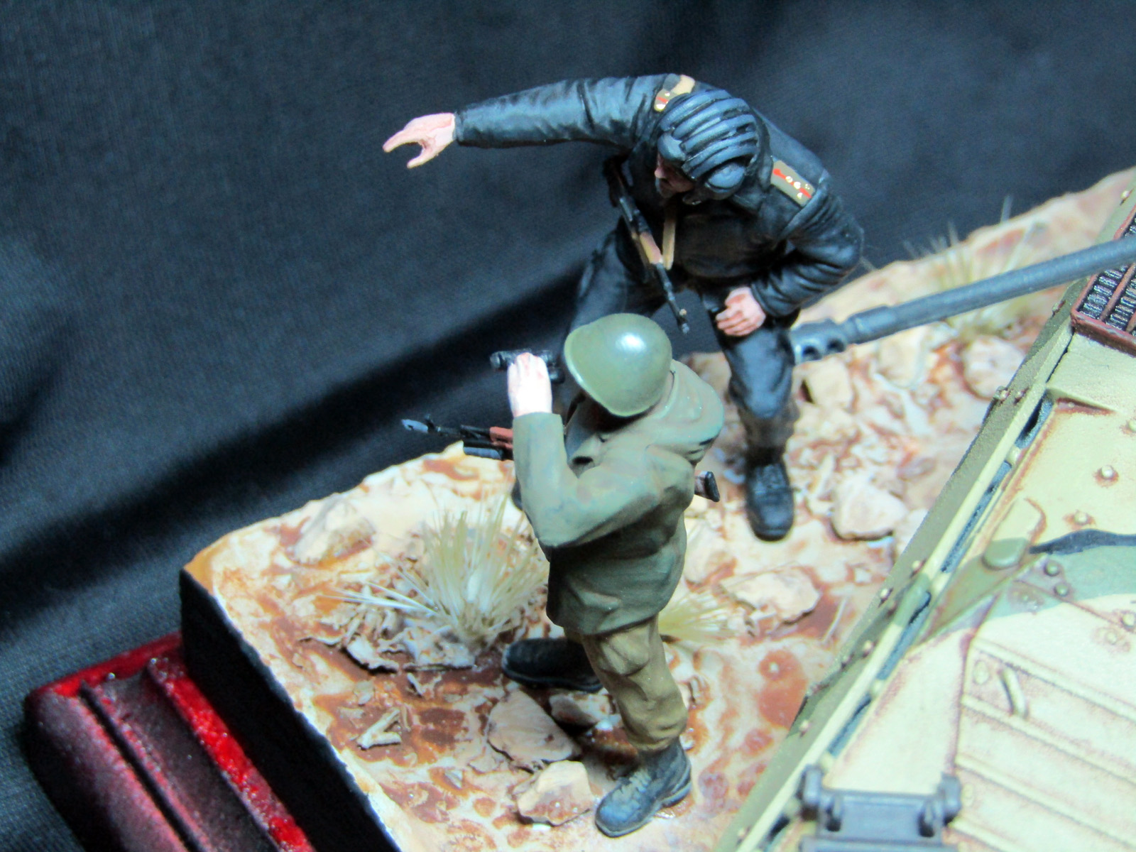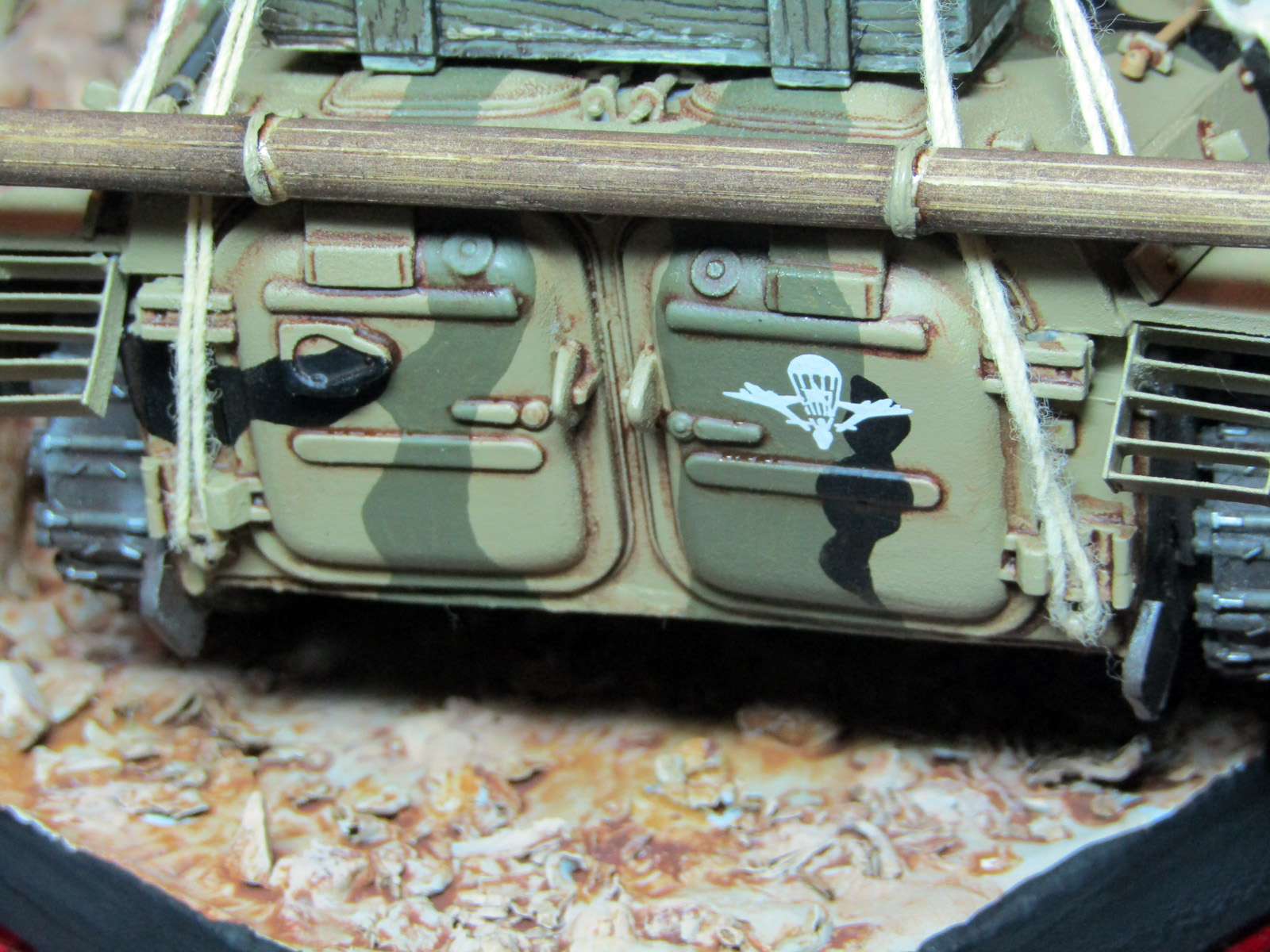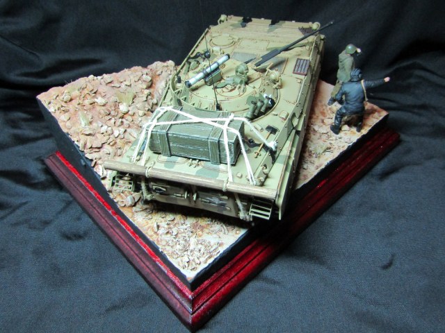 Композицию делал на заказ (попросили сделать данную машину на какой-нибудь подставке). Если честно давно хотелось собрать данный кит, уж очень красивый прототип, на мой взгляд это самая красивая боевая машина пехоты всех времён. Сам по себе кит особых трудностей при сборке не предоставил. Про "косяки" производителя писать не буду всем о них давно известно. Однако, при вскрытии данной коробки всё-же одно серъёзное "Но" неожиданно неприятно удивило меня: ванна в коробке лежала совсем не от "бэхи", и даже не от единички, а представьте себе от легендарного т-72!!! Но это "Но" меня всё-таки не остановило, возвращать или запрашивать у производителя новую деталь не стал, а ради интререса, изготовил на её основе при помощи чертежей Виктора Мальгинова, опубликованных в журнале "М-Хобби" искомое изделие. Правда немного наверное накосячил с интервалом между катками. Вместе с тем, самостоятельно изготовил "жалюзи"-брызговики (не знаю как они правильно называются), расположенные сзади над гусянкой; бревно - палочка производства "суши Wok"; верёвки - из канцелярской нитки; антенны - из тянутого литника; триплексы - из прозрачного листа пластика; расточил пламегаситель на основной пушке и ствол пулемета. Фигурки - также очень хорошего качества, без облоя или утяжин. Зная про неточности изготовителя в форменном обмундирования десантника каких-либо изменений и дополнений вносить не стал. Основание - самодельное, плакетка покрыта лаком, основание из гипса + разнокалиберные камушки и щетина от малярной кисти (трава). По покраске: БМП - всё покрашено кистью на автомобильный грунт "KUDO" акановским и звездовскими акрилами, а также эмалью и матовым лаком "revell", смывка - акварель на "Фейри"; основание и фигурки - ПВХ темпера. Вот собственно и всё описание, приятного просмотра коллеги)...