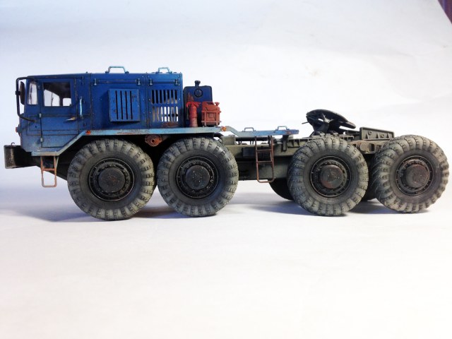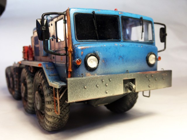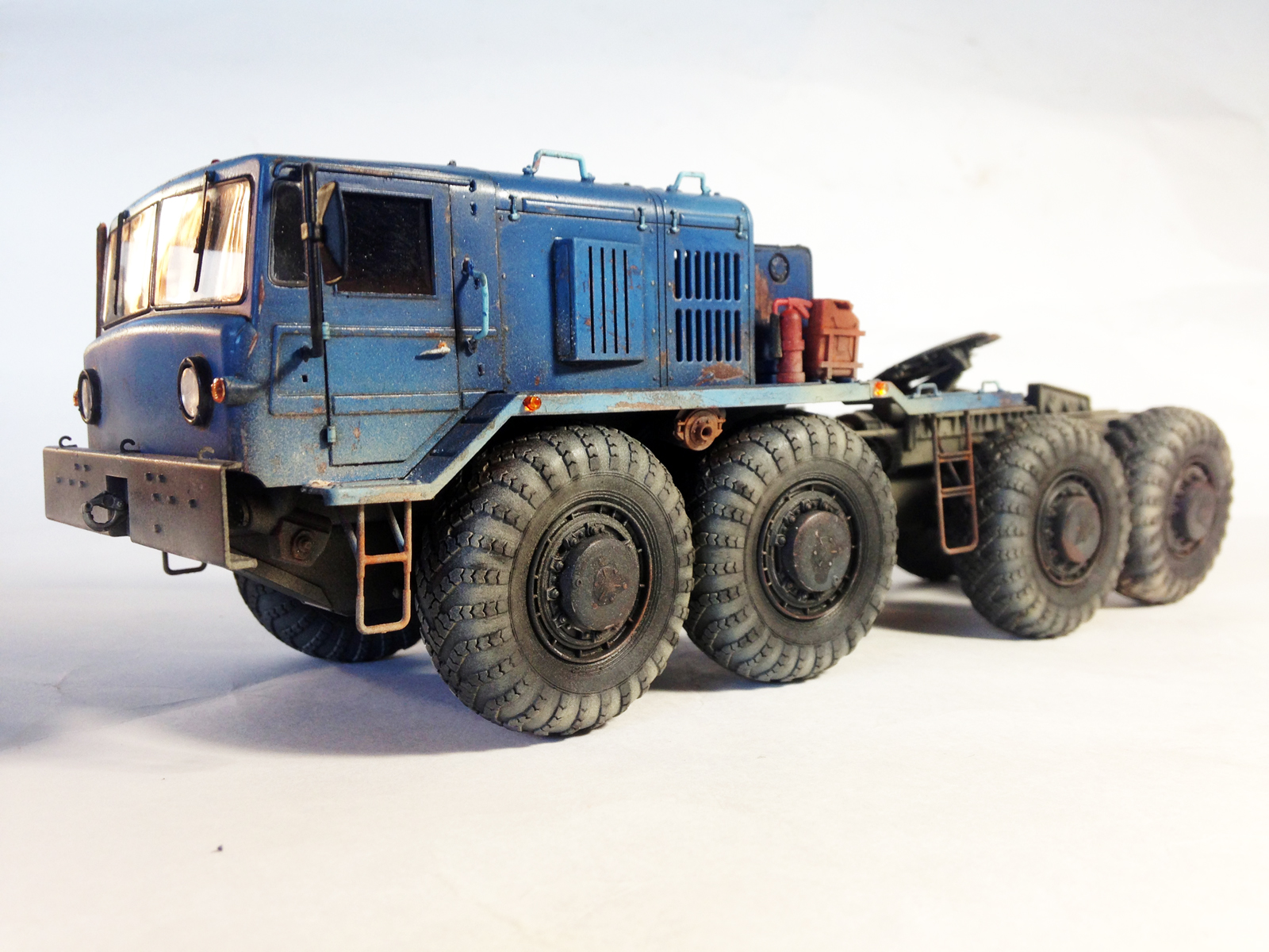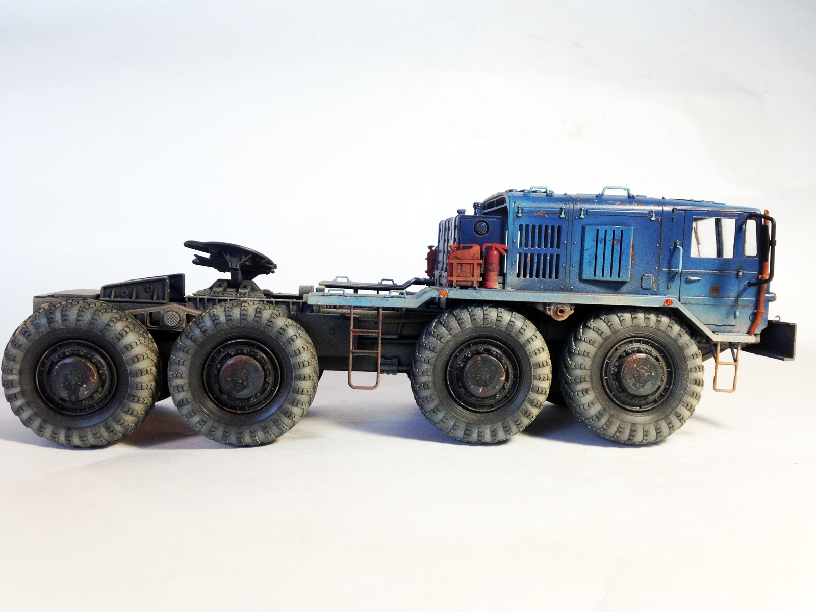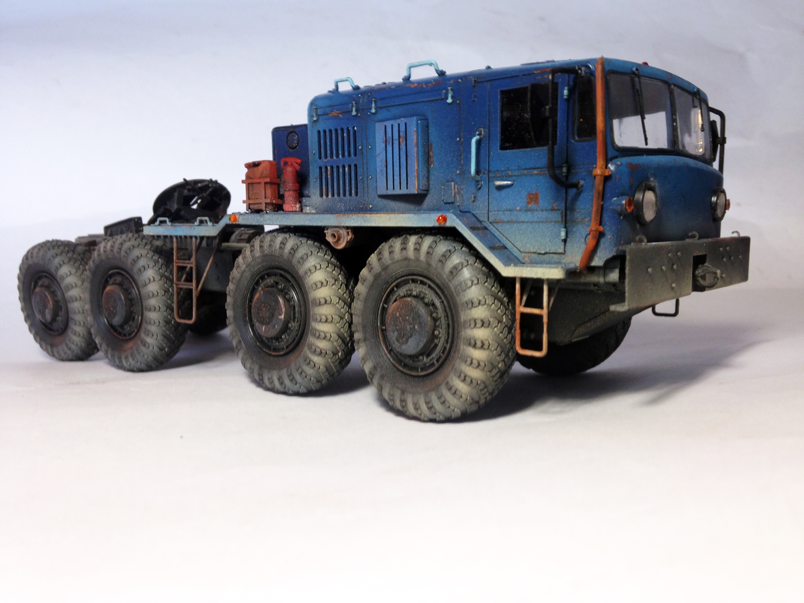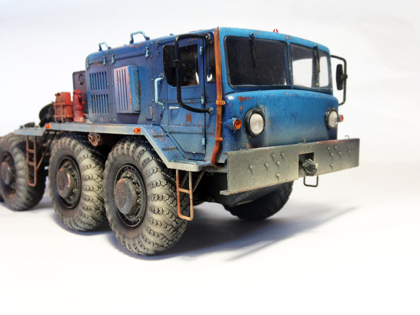Отличная модель, махина то что надо. Вначале заморочился с рабочей подвеской, потом плюнул и собрал как есть, но чуток функционирует)) по фото видно. Видел в сети, синий окрас, взял за основу, конкретно к прототипу не привязывался, как кисть ложилась так и делал. Историю не придумал машины, списали, где-то пашет))