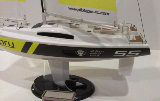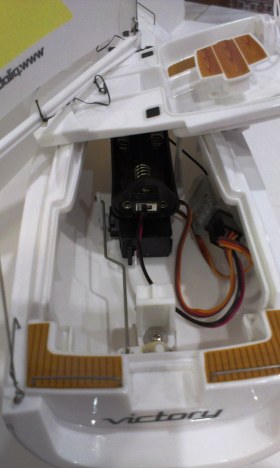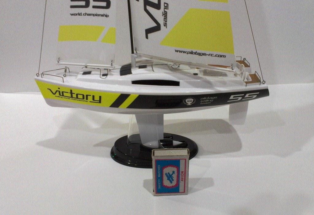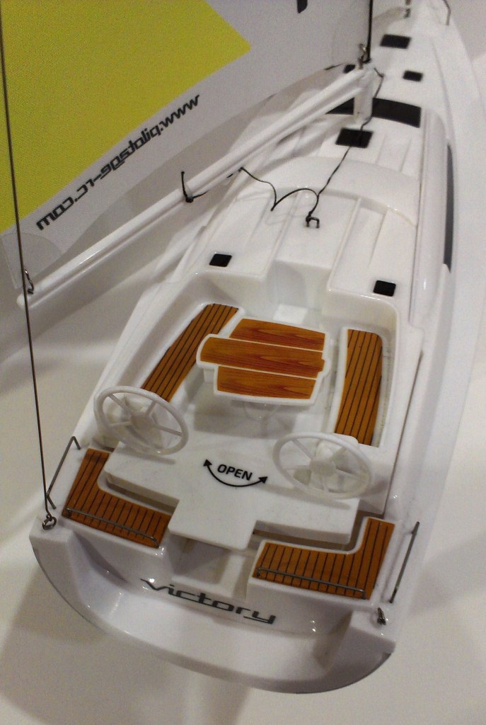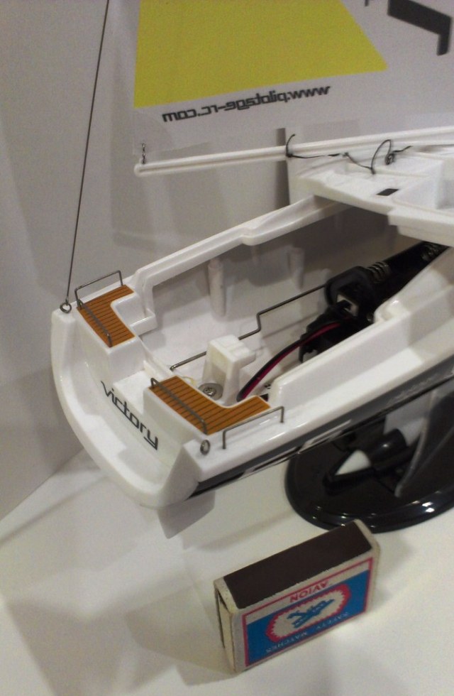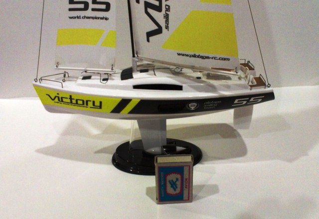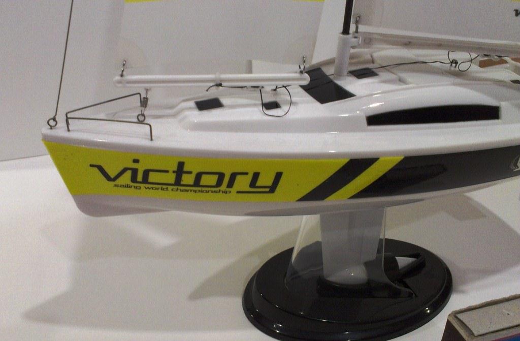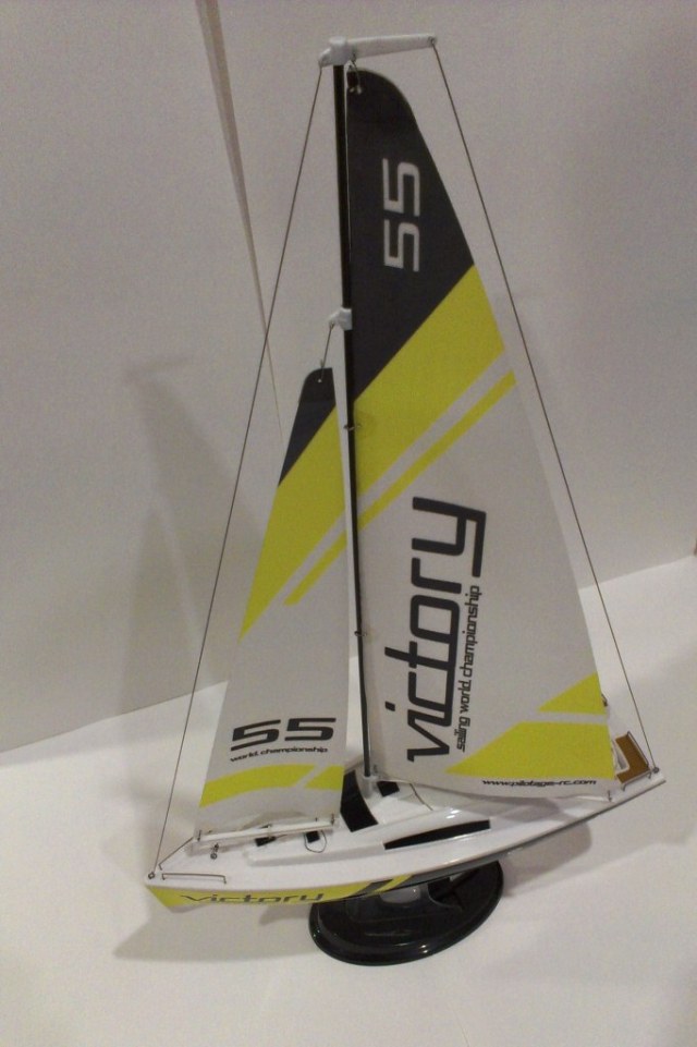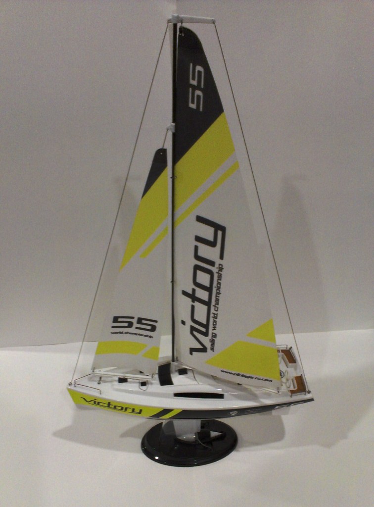 Из особенностей яхты Victory55 можно отметить: мачта изготовленная из карбонового волокна и намертво прикреплена, точнее приклеена к палубе, и оторвать ее можно только зубами, все управление состоит из двух сервоприводов – один для управления рулем и второй для парусов, окрашенные нейлоновые паруса с надписями неплохо смотрятся, водостойкая желтая и черная краска на парусах и корпусе яхты, металлический киль из непонятного материала, корпус яхты выполнен из прочного белого пластика ABS, пульт управления в комплекте и готов к работе).