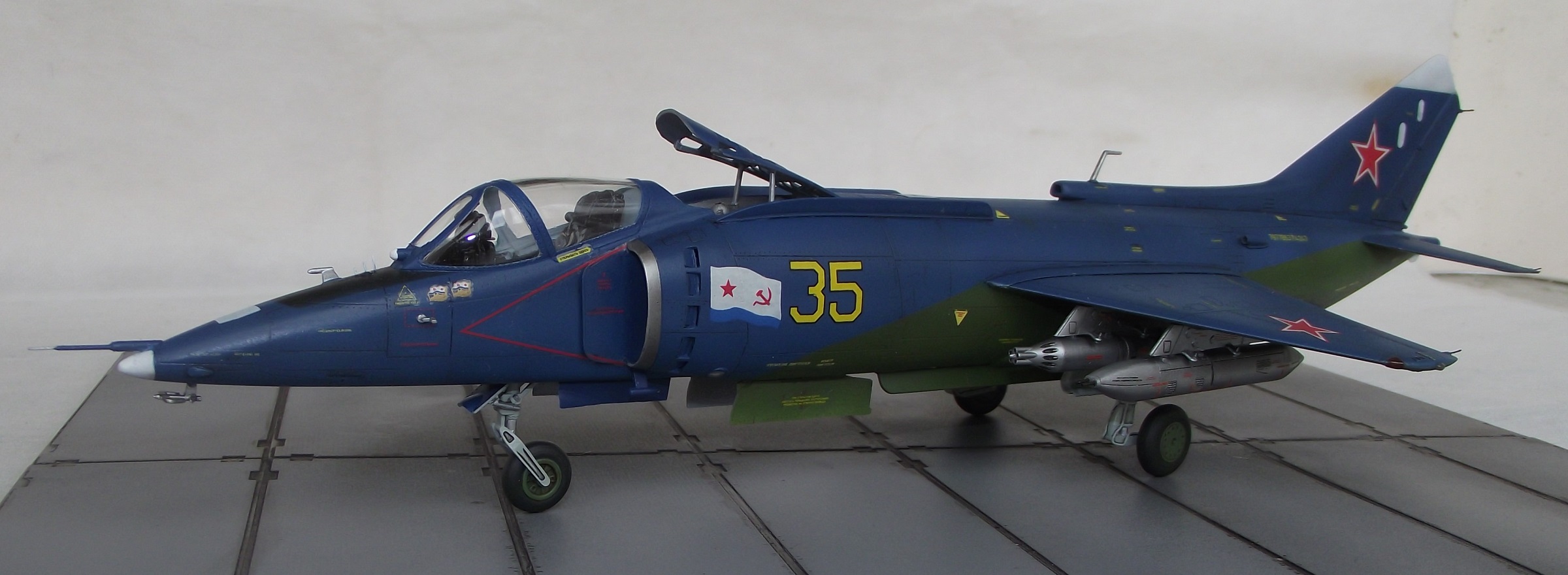 Добрый день уважаемые коллеги! Позвольте представить Вам свою работу. Это известная модель самолёта Як-38 от известного производителя моделей Хобби Босс. В работе над моделью применены дополнения: смоляные воздухозаборники маршевого двигателя и воздухозаборники подъёмных двигателей от QB, кабина и выхлоп маршевых двигателей от Aires, выхлоп подъёмных двигателей от Армори, декаль от Бегемота. Последняя кстати подвела. Оказалась довольно жесткой и потребовала усилий для приварки на место. Что получилось судить Вам, уважаемые коллеги.