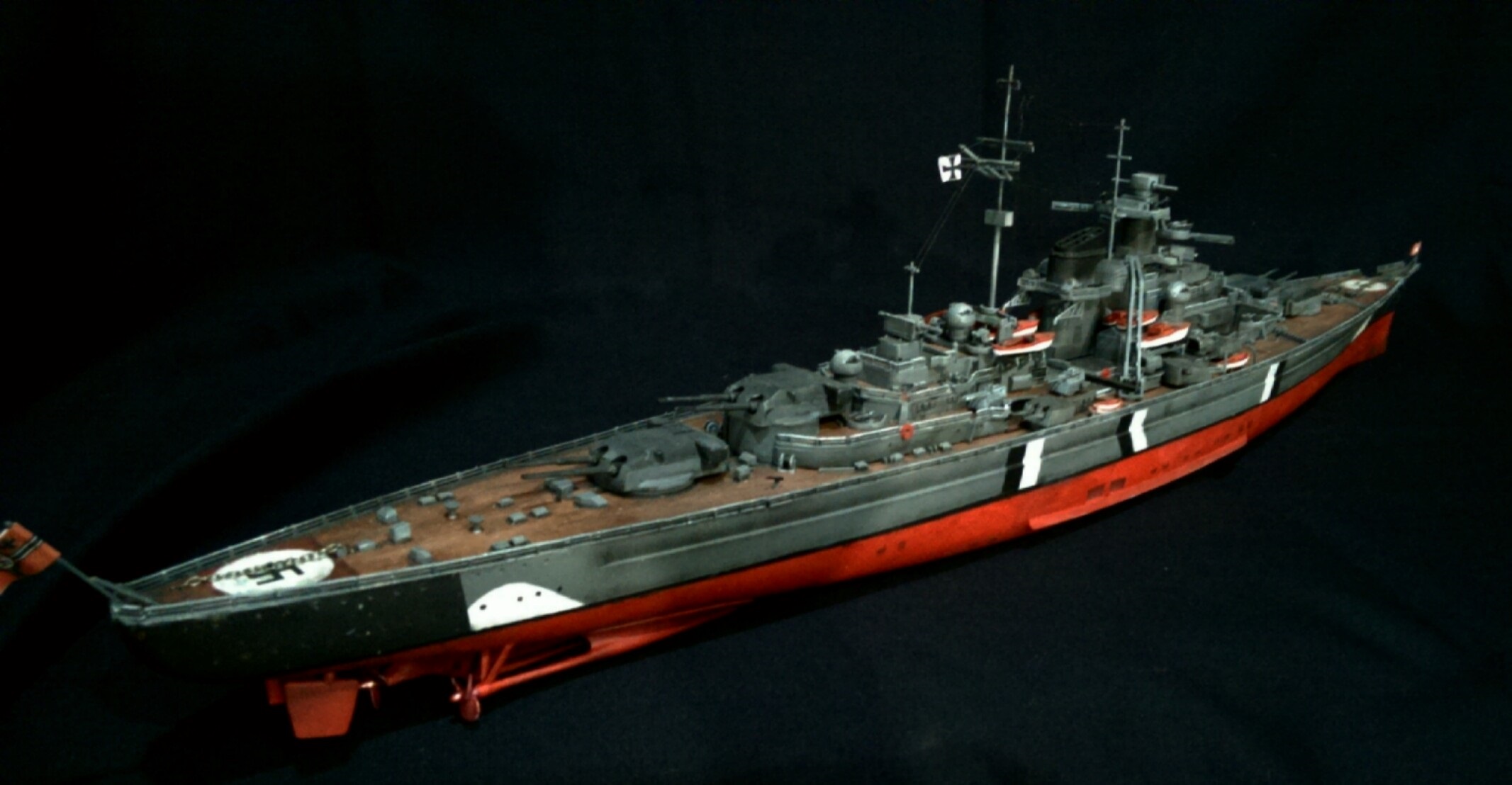 5) Не стоит слепо доверять инструкции - в 95% случаев там есть серьезная ошибка. Конкретно у Бисмарка ни при каких условиях не могло быть черного козырька дымовой трубы, линия переменных ватерлиний должна быть толще раза в два. Орла на корме никогда не было, гербы на носу были только при спуске на воду...