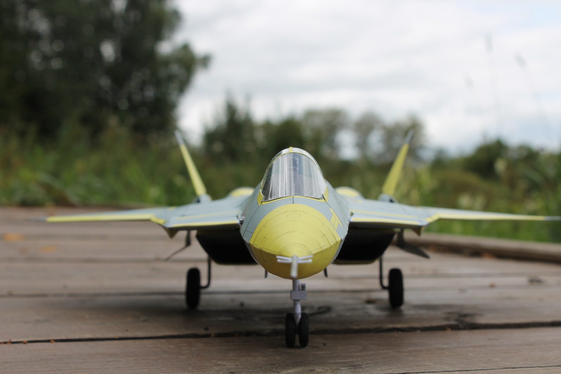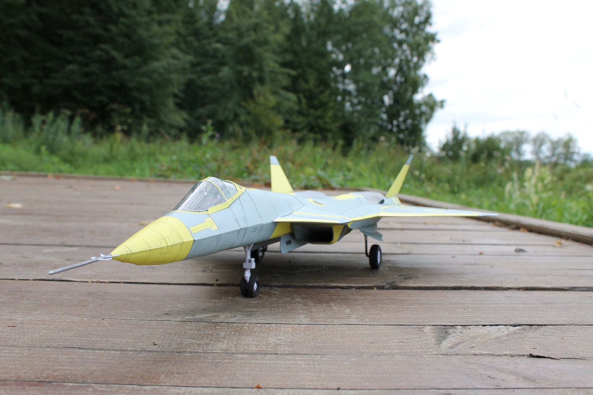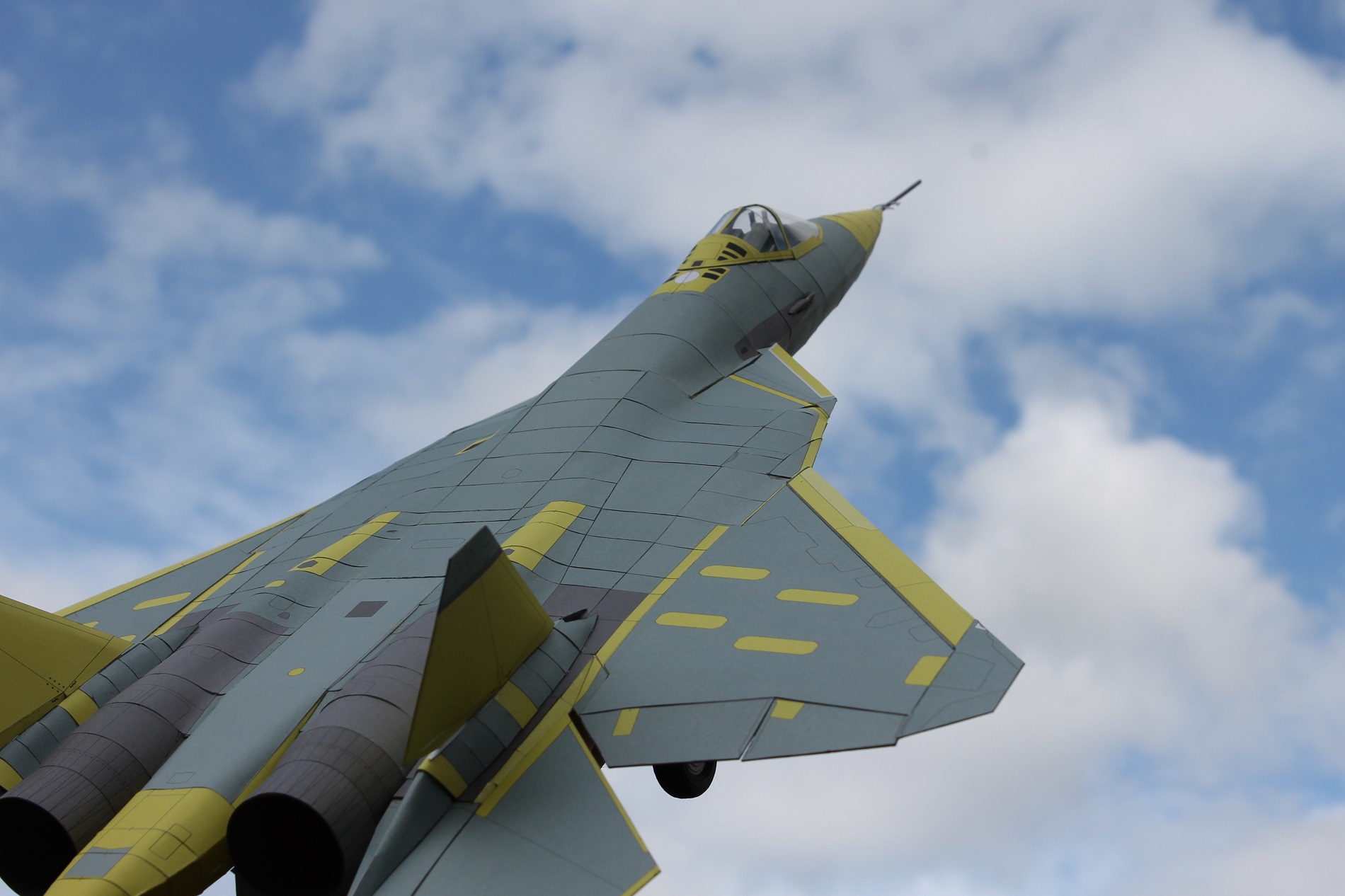 Привет всем ! на днях закончил вторую модель (из бумаги ) в авиации ПАК ФА Т-50-1 . Это самый первый лётный образец нового российского истребителя 5 поколения ( официальное название у него Су-57 ) . самолёт совершил свой первый полет в 2010 году . Особенность этого образца в том , что он без камуфляжа , так что можно увидеть на макете использование композитов в конструкции ( это все серые части ) . Жёлтые детали - это покрытые грунтом металлические части .