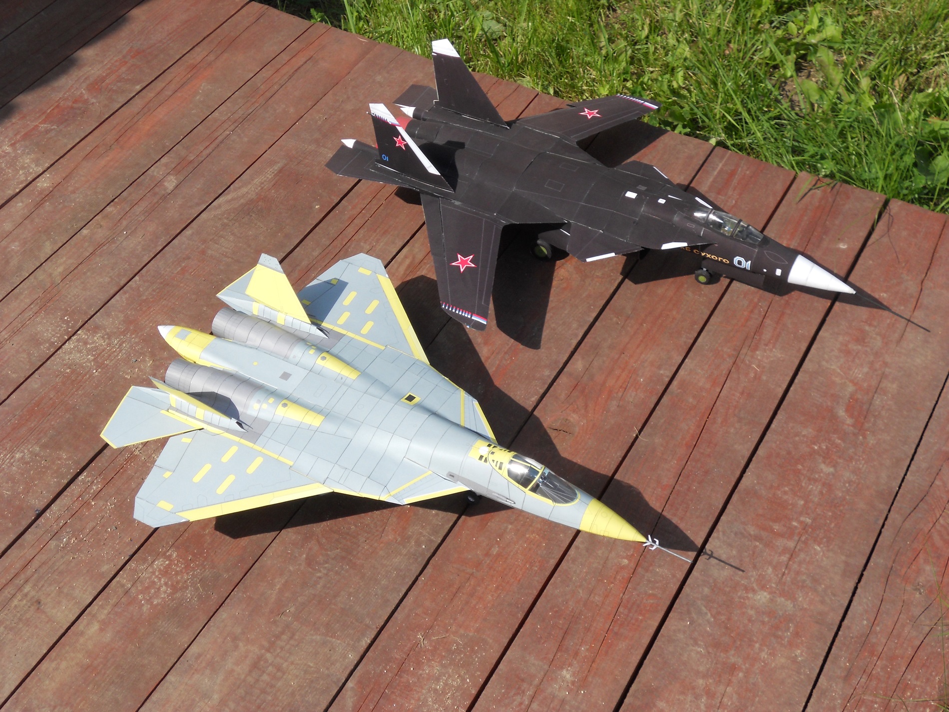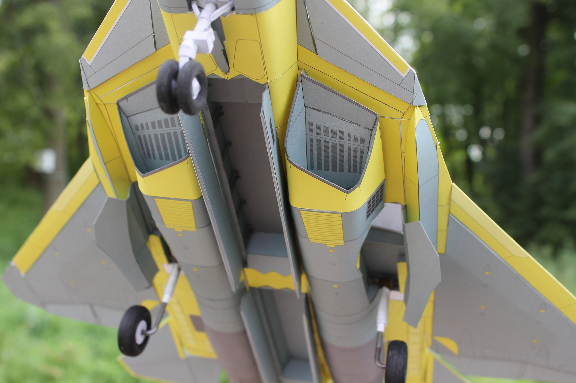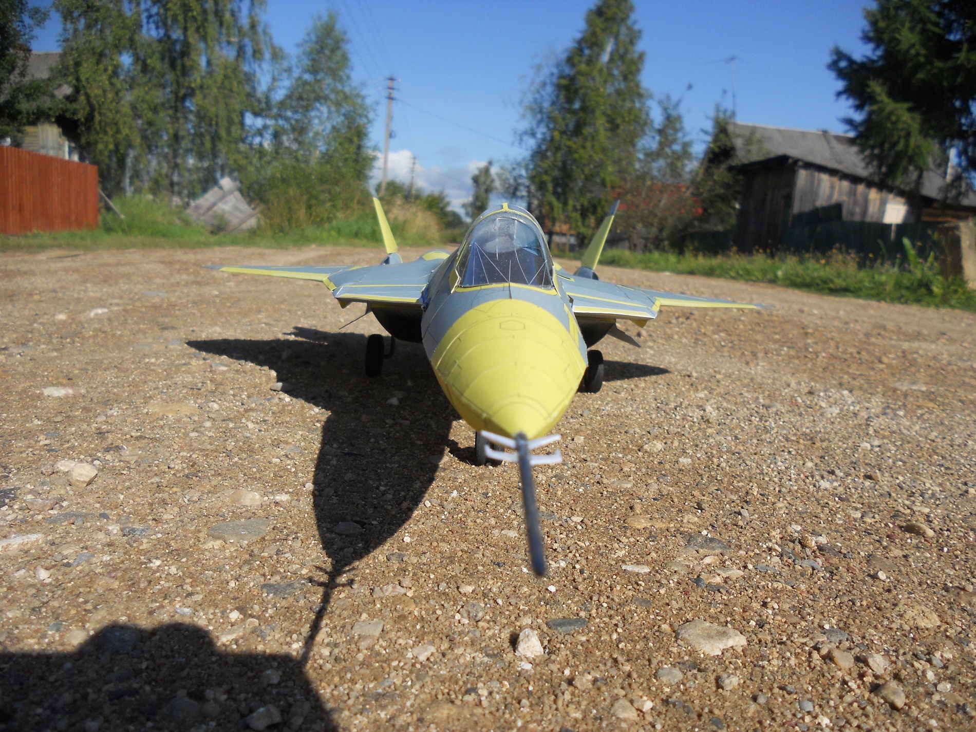 Привет всем ! на днях закончил вторую модель (из бумаги ) в авиации ПАК ФА Т-50-1 . Это самый первый лётный образец нового российского истребителя 5 поколения ( официальное название у него Су-57 ) . самолёт совершил свой первый полет в 2010 году . Особенность этого образца в том , что он без камуфляжа , так что можно увидеть на макете использование композитов в конструкции ( это все серые части ) . Жёлтые детали - это покрытые грунтом металлические части .