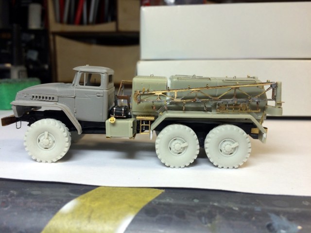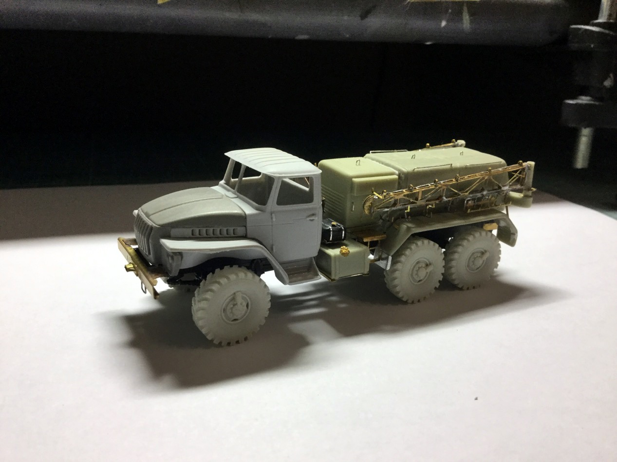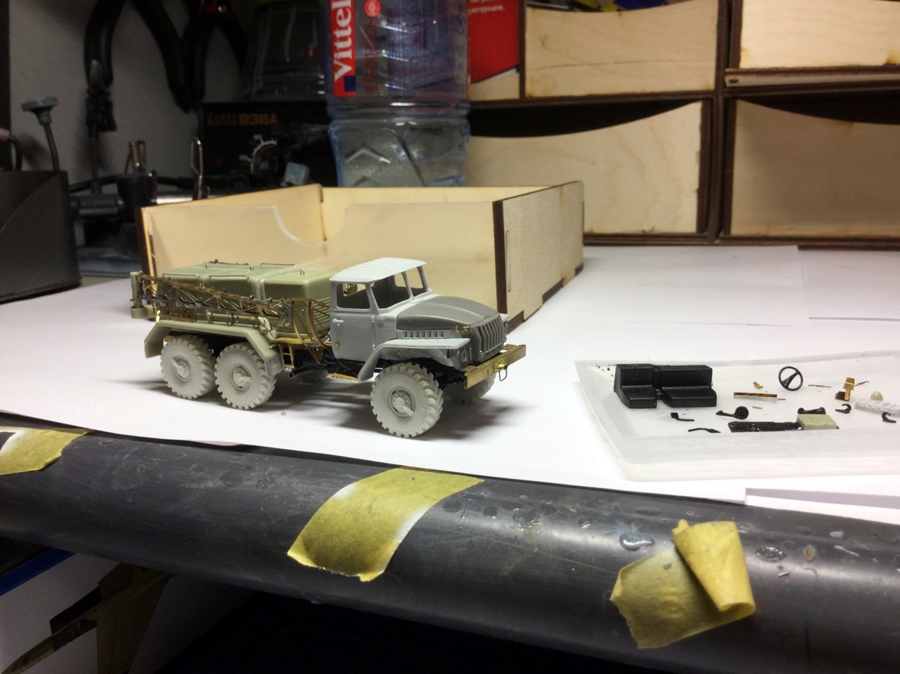 Кабина сначала была от ICM, с доработкой радиатора, она не устраивала горбом на капоте, грубой проработкой, потом сделал микс из ICM и танкоградовской кабины Урал 375, и наконец спустя 4 месяца ожиданий Танкоград по моей просьбе возобновил отливку искомой кабины 4320. Кабина отличная, особенно удалась решетка радиатора, решетки охлаждения сбоку, нет горба на капоте.