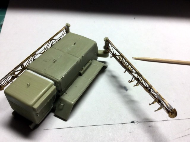 Самое сложное для меня в модели было спаять фермы пускового агрегата, держатели на них делал сам, родные слишком мелки, припаять их оказалось очень сложно, в итоге посадил на эпоксидку, она держит нагрузку лучше тонкой пайки, долго пытался спаять ДЗК, в итоге получилось неплохо, и отдельной сложной задачей стало вклеить заподлицо стекла в кабину (делал из пленки, получилось с 5 раза). Резинки для стекол имитировал черным маркером по акрилу на контуре пленки.