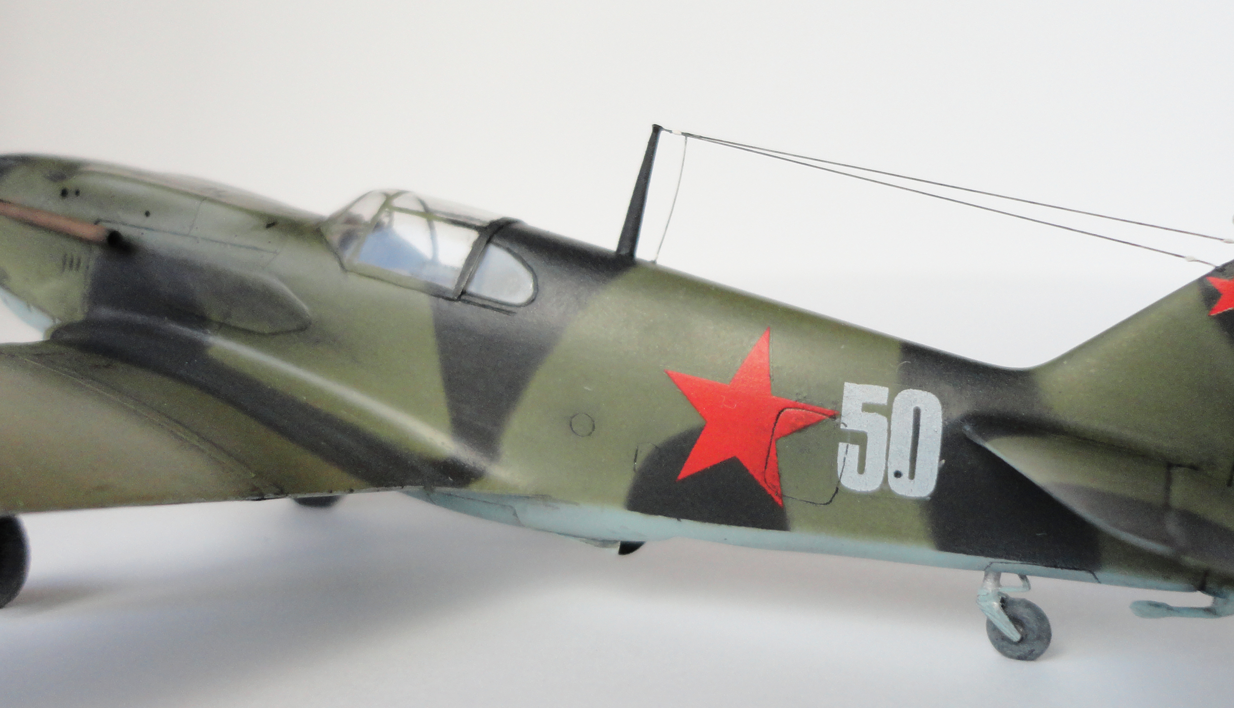 Заново изготовлены сиденье, ремни, бронеспинка, пол в кабине, штурвал, прицел, приборная панель , фонарь кабины и остекление. Установлены перегородки за кабиной пилота. Сточены до приемлемой толщины задние кромки крыла, элеронов и рулей направления. Элероны и рули высоты отделены от деталей крыла и стабилизаторов. На рулях направления и элеронах сымитированы провисы полотняной обшивки. Из самоклеющейся фольги изготовлены детали закрывающие стыковочные швы плоскостей крыла и стабилизаторов, защитные тепловые экраны, закрылки крыла. Из иглы от шприца изготовлены трубка ПВД и трубка для крупнокалиберного пулемёта. С помощью серой шпаклёвки Tamiya были выполнены каналы воздухозаборников в корне крыла и воздухозаборник маслорадиатора. Из «пивной банки» изготовлены совки масляного и водяного радиаторов. Отражатель фары сделан из фольги, лампочка из прозрачного литника, плафон из упаковочного пластика. Опоры шасси дополнены поршнями из невидимки. Гидравлические цилиндры уборки шасси сделаны из литника и невидимки. Щитки шасси изготовлены новые и дополнены рельефными элементами из пластика и фольги. Изменены противовесы руля направления (сделаны разными). Колёса Elf: ступицы разрезались на две части и делались уже, пневматики разрезались, совмещались, циакрином склеивались половинки и проливался грубый шов. При окраске использовался «канцелярский пластилин» для создания размытых границ пятен камуфляжа.Краски Humbrol, Vallejo, ХоМа. Лаки ХоМа. Смывка Vallejo. Пигменты ХоМа. Антенна из лески. Дэкали изготовлены на заказ на Каробке, звёзды От AML.