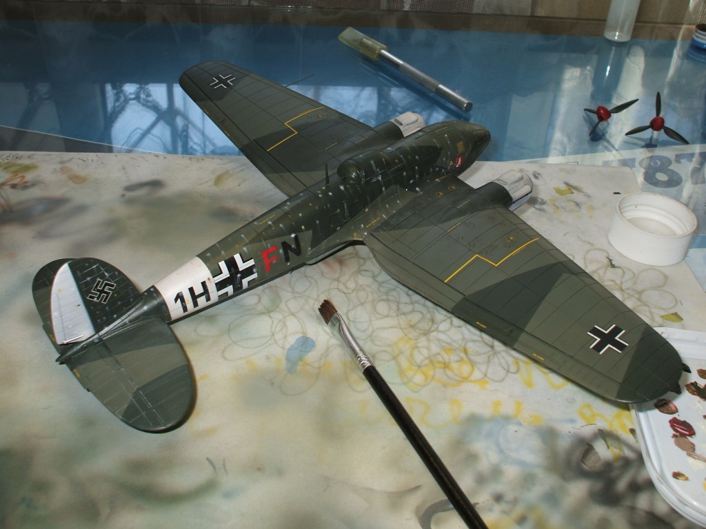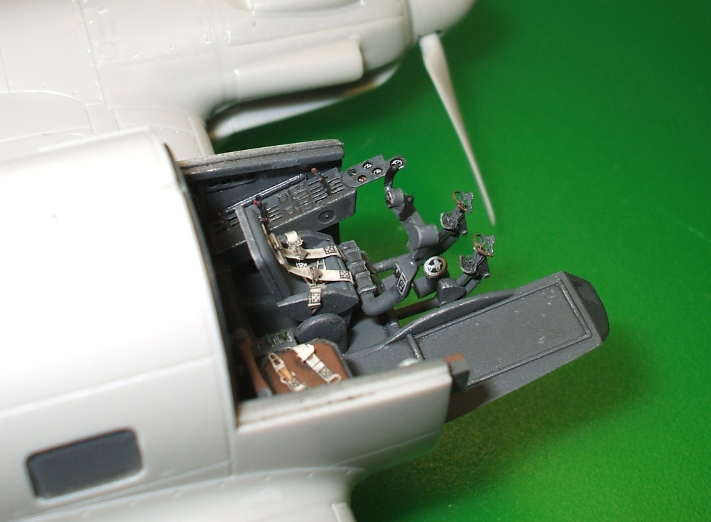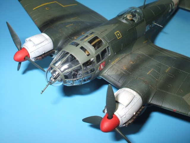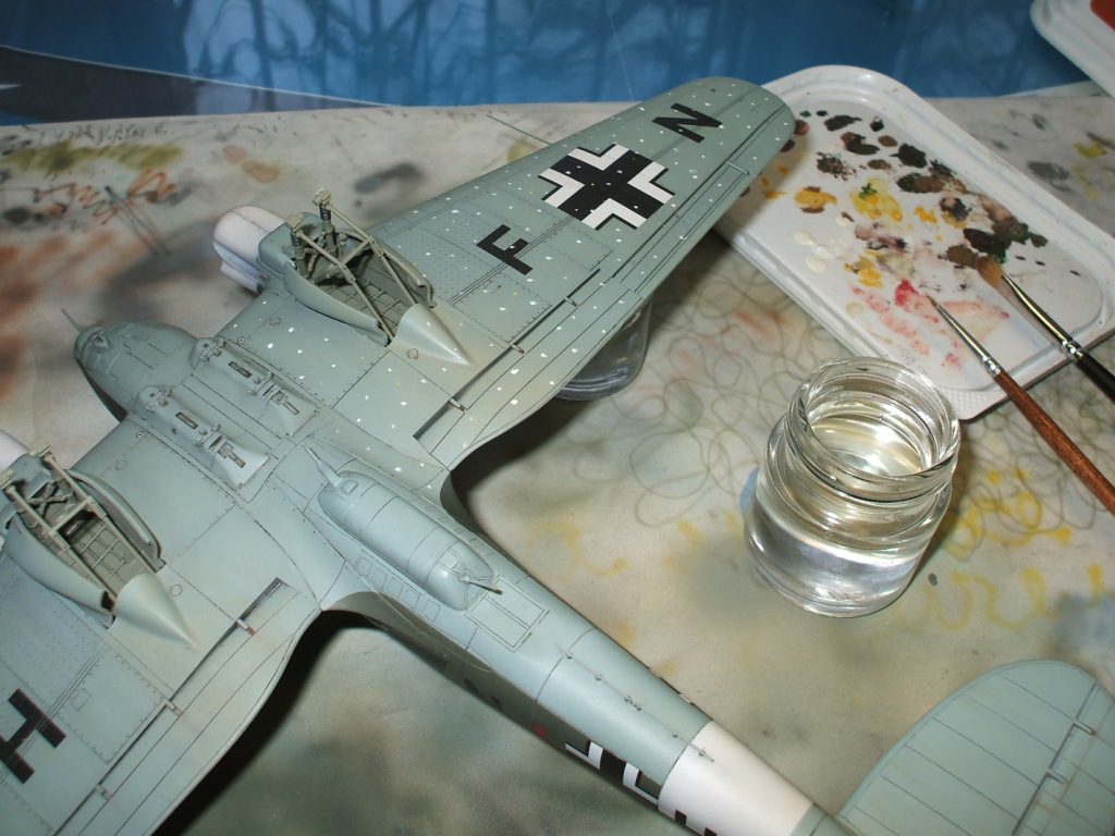 Так как модель выполнялась на заказ, по согласованию с заказчиком в геометрию модели решено было не упираться, но принимаясь за работу, хотелось как то сгладить недочеты производителя, по этому было решено дополнить интерьер пилотской кабины фотоэтчетом от фирмы Eduard, сточить до минимума «киперные ленты», а чтоб расшив не «резал глаз», выделять его очень умеренно. В процессе работы были рассверлены стволы на стрелковом вооружении, так же пулеметы и пушка получили прицелы сделанные из тонкой проволоки. Из проволоки так же сделаны антенна слепой посадки и ПВД. В торцах крыльев, из тянутого литника сделаны АНО и раскрашены лаком соответствующего цвета. Мачта антенны выточена из алюминиевой полосы, растяжка антенны – бантик. Окраска модели производилась химией от GS и Tamiya, также использовалась футура, смывка от MIG и масло от Wilder. Декаль штатная, прекрасно отреагировала на химию от GS.