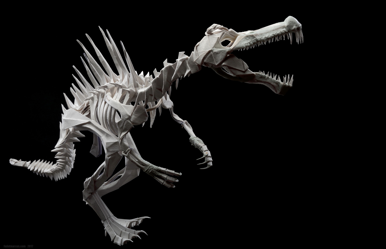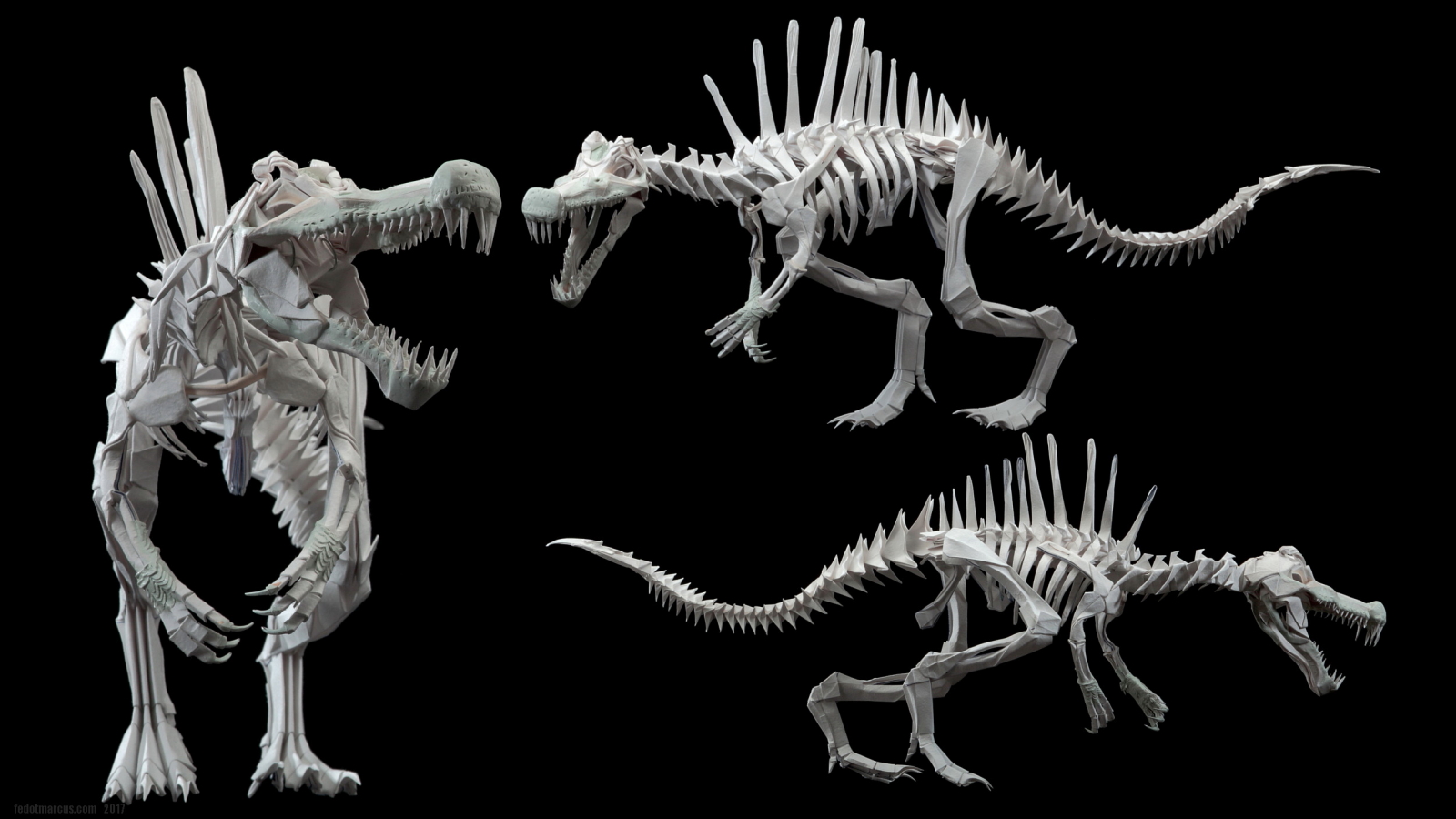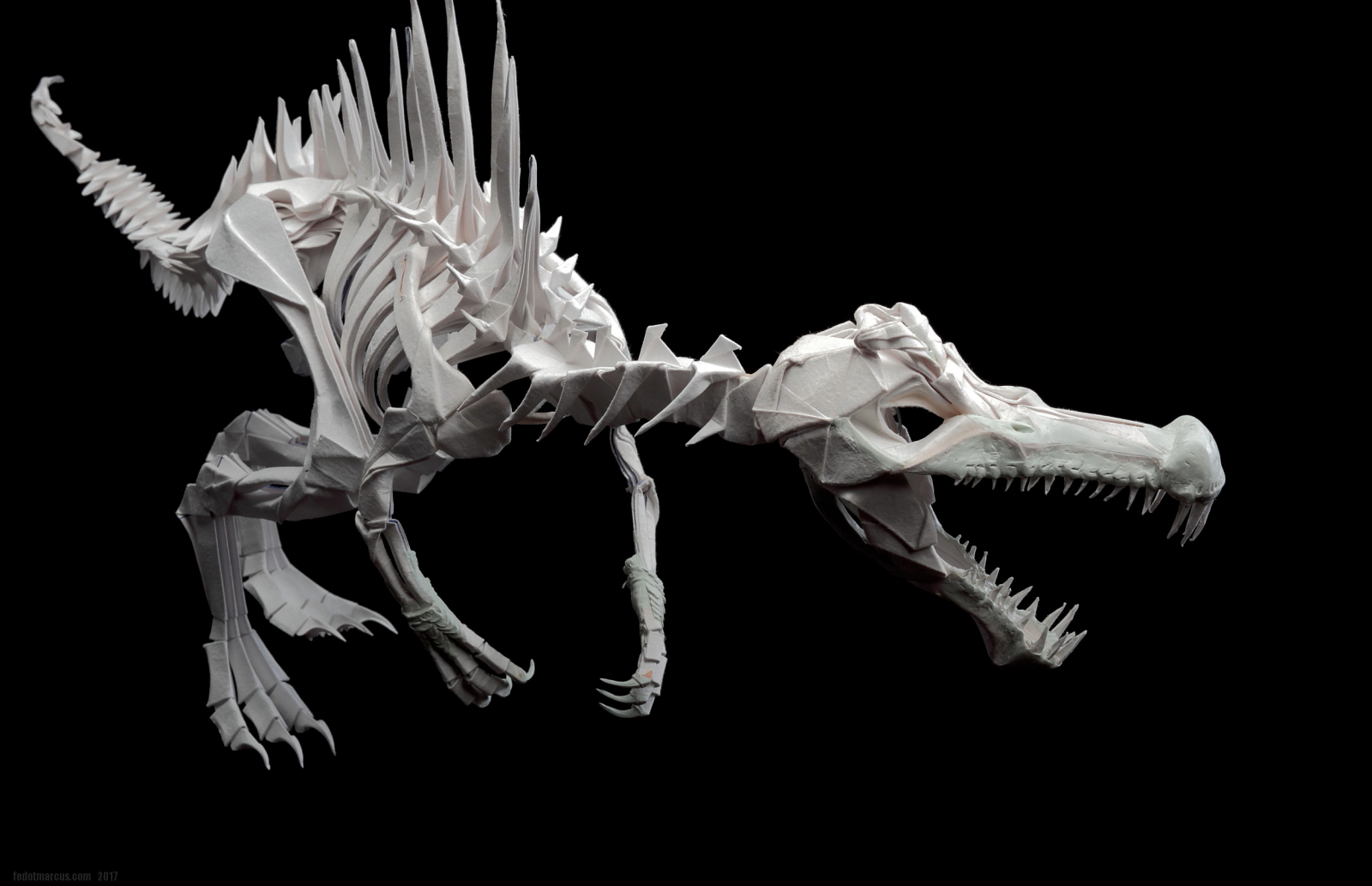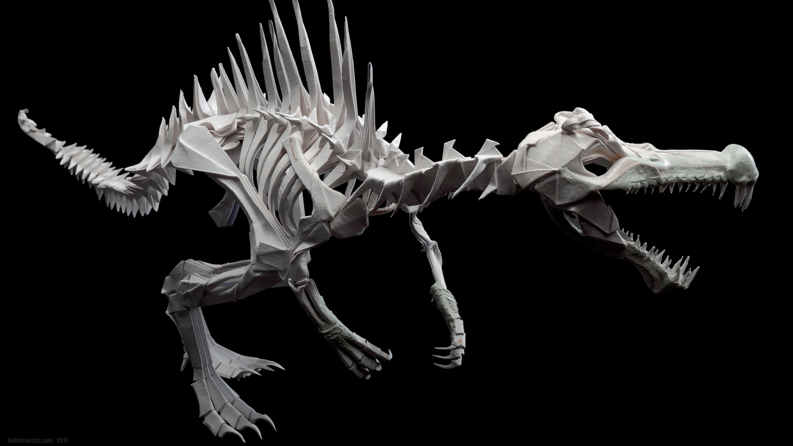 Работа выполнена из акварельной бумаги. С помощью двухкомпонентной шпаклёвки Tamiya сымитированы углубления для рецепторов в черепе, улавливающих движение под водой. Сделано это было в качестве эксперимента по совместимости материалов, а также по причине того, что Spinosaurus был рыбоядным и каналы рецепторов движения вдоль морды, характеризуют его не меньше, чем спинной «парус». Заодно шпаклёвкой были смоделированы носовая часть, скулы, ноздри, гребень на лбу, дуги нижней челюсти и передние лапы.