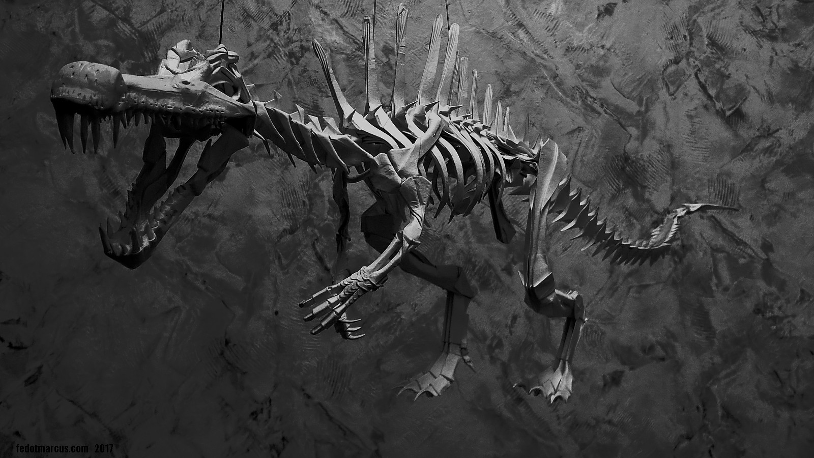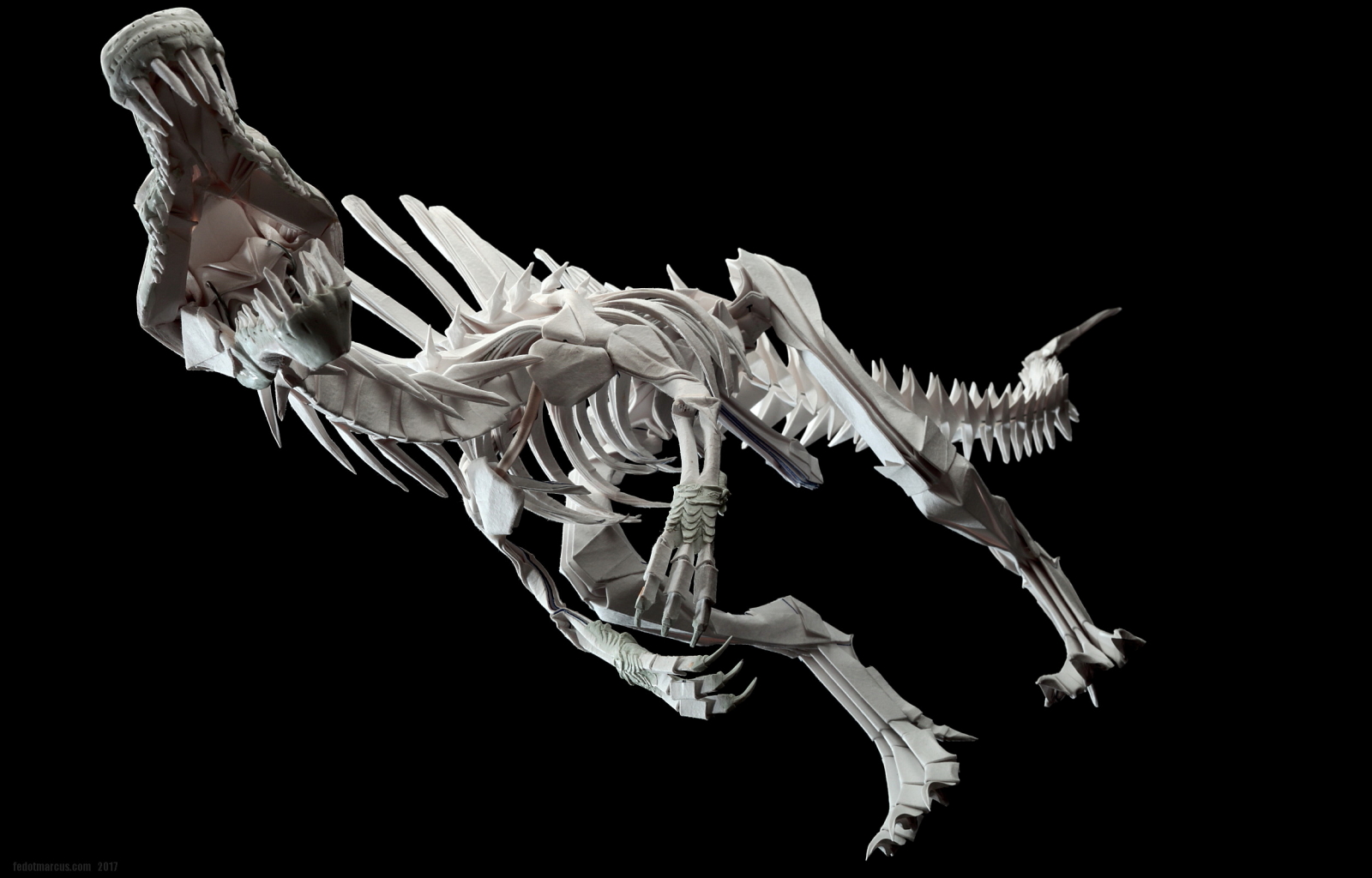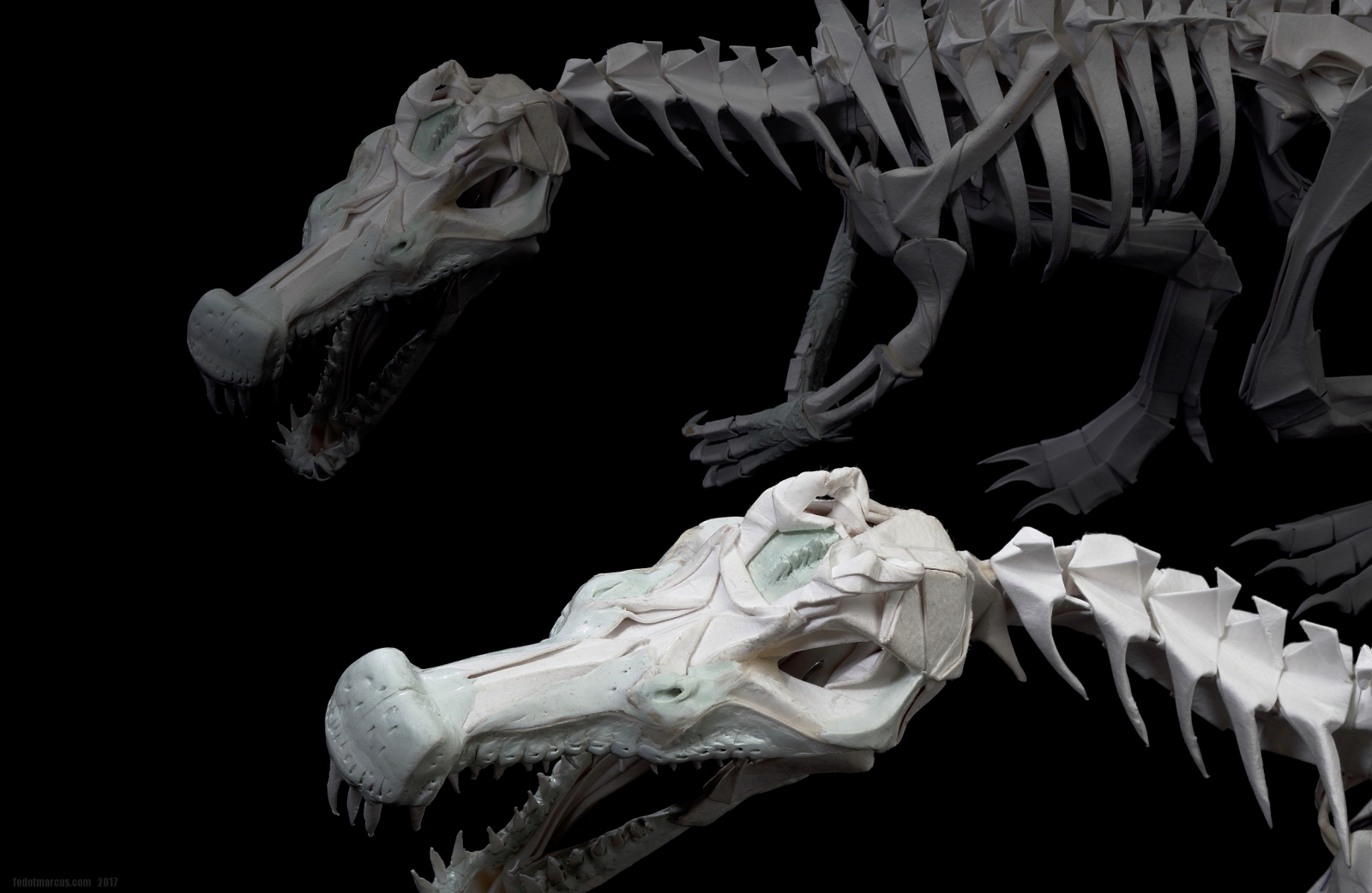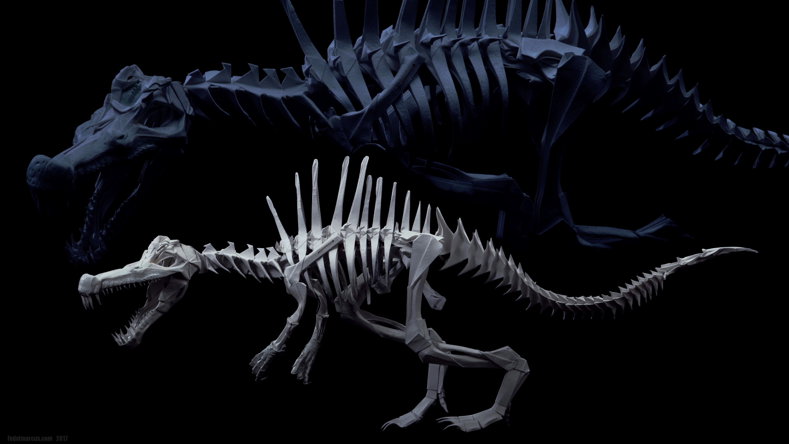 Работа выполнена из акварельной бумаги. С помощью двухкомпонентной шпаклёвки Tamiya сымитированы углубления для рецепторов в черепе, улавливающих движение под водой. Сделано это было в качестве эксперимента по совместимости материалов, а также по причине того, что Spinosaurus был рыбоядным и каналы рецепторов движения вдоль морды, характеризуют его не меньше, чем спинной «парус». Заодно шпаклёвкой были смоделированы носовая часть, скулы, ноздри, гребень на лбу, дуги нижней челюсти и передние лапы.