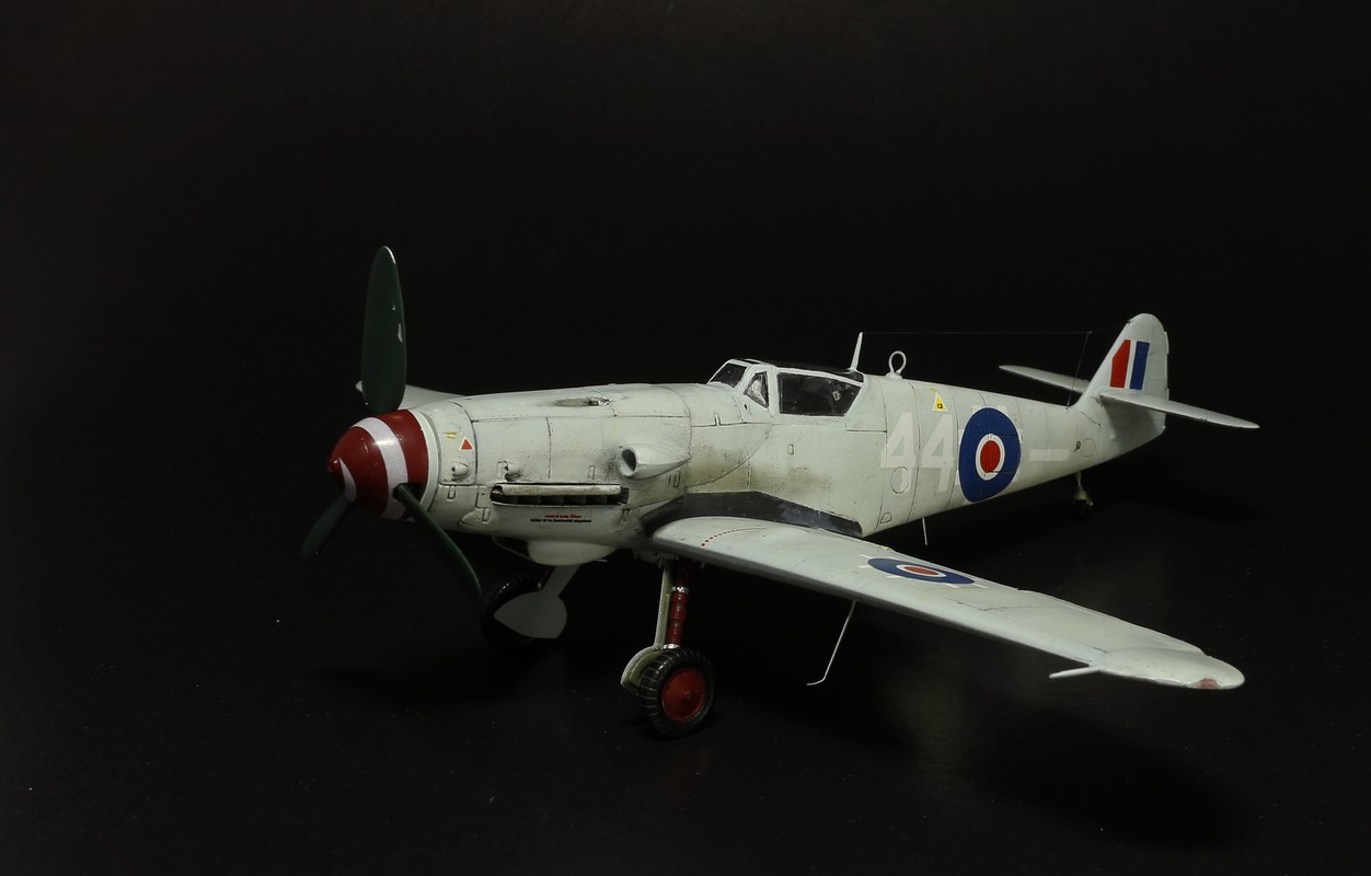 Данный экземпляр примечателен тем, что заправлялся высокооктановым топливом, в связи с этим стойки основных шасси были выкрашены в Wine Red. Также он подвергся "обританиванию", все немецкие ОЗ были закрашены британскими. К сожалению я не обратил внимания, что скорее всего английские ОЗ наносились без трафарета и получились слегка неровными. Декали же, которые выполнялись на заказ, абсолютно круглые.