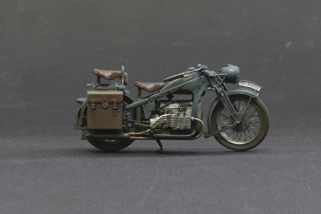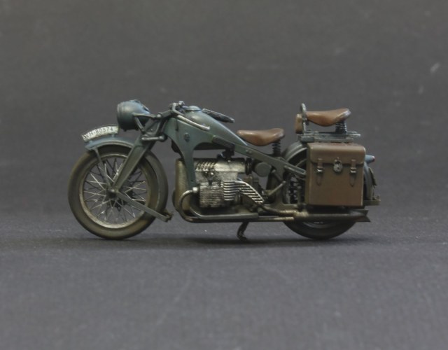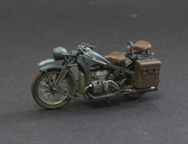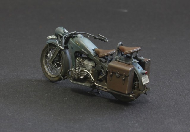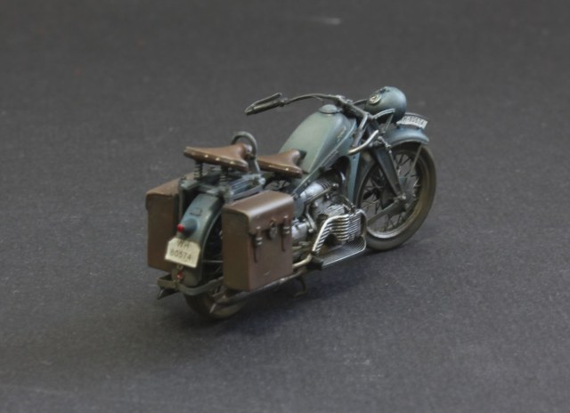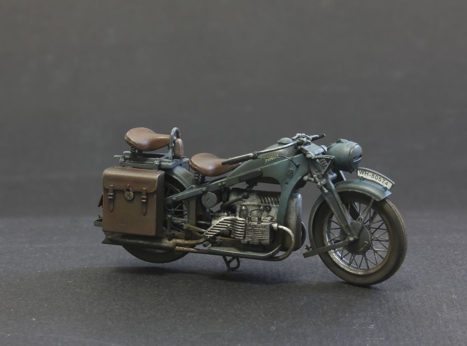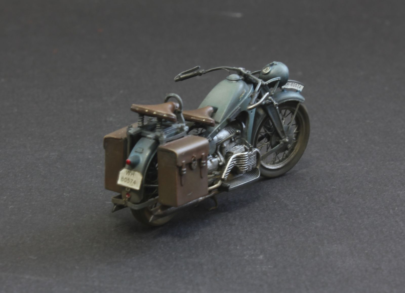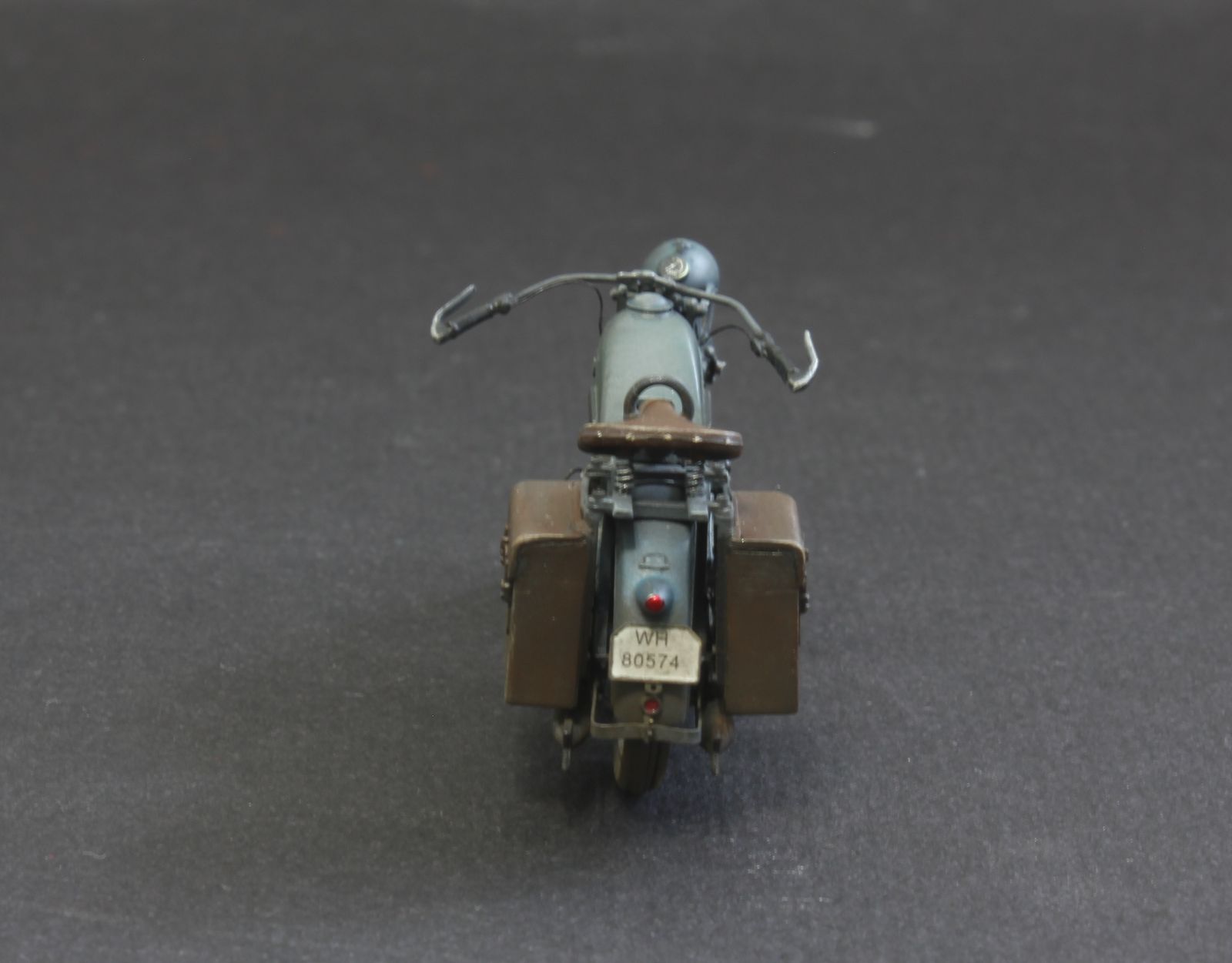 Итак, о сборке-окраске. В целом, набор произвел смешанные чувства - высокий уровень детализации соседствовал с не лучшей стыкуемостью и упрощениями. Все подробно описывать не буду - все равно мало кто прочтет))) скажу лишь о доработках: заменил руль на самодельный из проволоки, из нее же сделал кое-какие ручки, сам сделал из обрезков травла стояночные П-образные скобы (или как их там), с нуля выполнил подножку (ее производитель не сделал ни в каком виде!!!). Проводку изобразил, но упрощенно. Красил акрилом, тонировал маслами и пигментами МХП.