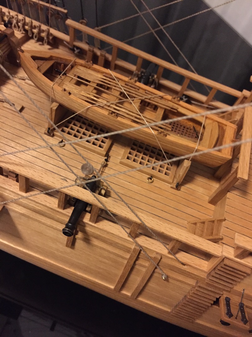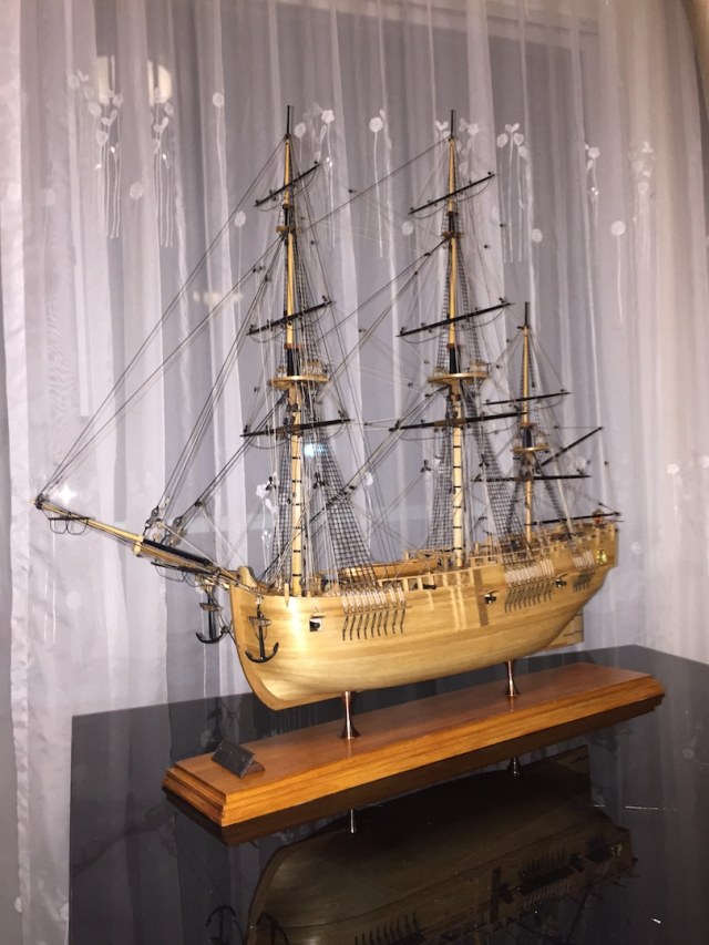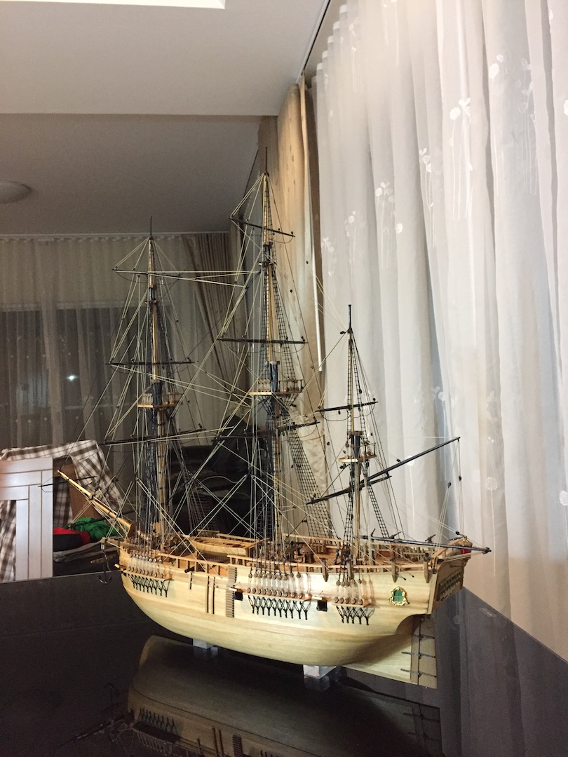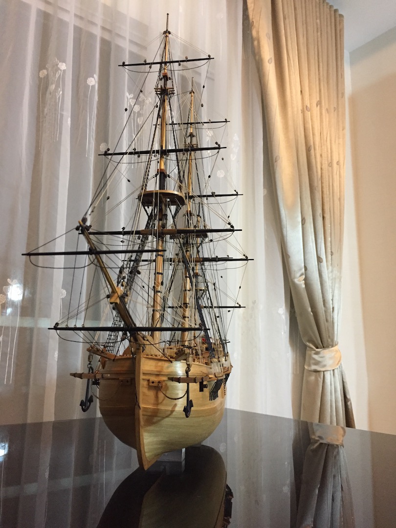 Кук бы мне самолично голову отрубил за это произведение. Первые поползновения в точности скопировать известный угольщик разбились о непробиваемую стену лени. Так что, с дистанции 5-10 метров барк похож на реальный "Индевор", но не ближе. Покраска минимальна, поскольку ценные породы дерева (в основном, орех) не хотелось лишать прелести оттенков. С этими "ценными породами" - одна головная боль, потому что огрехи под краску не спрячешь и не зашпаклюешь. Завершил стройку в октябре 2016 года (делал 3 года с полугодовыми перерывами). Всем очень нравится, потому что они не знают....
