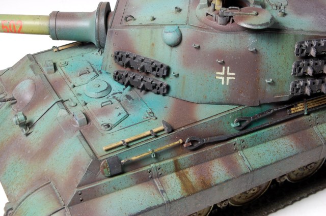 Башня имеет множество "финальных" черт но расположение креплений для крана (кроме одного - у люка заряжающего) и отсутствие козырька над прицелом соответствуют тигру "средних" производственных серий. На правом борту корпуса присутствуют крепления троса для натяжения гусениц, хотя он с марта 45-го крепился вокруг бронировки вентилятора на надмоторной плите. Отсутствуют трубки вентиляции топливной системы (все четыре штуки, учитывая "финальную" модификацию). Крепление бортовых экранов вообще "раннего" типа.