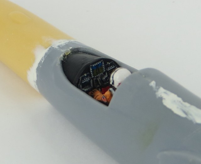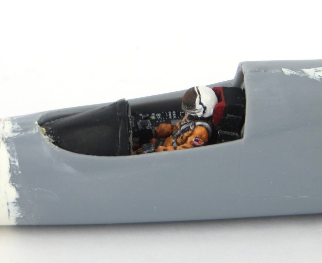 Изначально, планировал посадить в кабину пилота. Но поскольку, в самой модели фигурки не было, а что-то подобное на просторах интернета найти так и не смог, пришлось делать фигурку на заказ у одного "фигурщика". Мне кажется, пилот вышел очень хороший. Красил акриловыми красками Revell, Tamiya, Mr.Hobby. Используя их различную зернистость, а так же, путем смешивания с различными оттенками серой и белой краски, удалость передать некоторый панельный эффект поверхности.Всего было использовано 8 различных оттенков. Лак и смывка тоже тамиевская. Немного тонировки масляными красками Adam Wilder, а так же, слегка поскоблил сухой кистью.