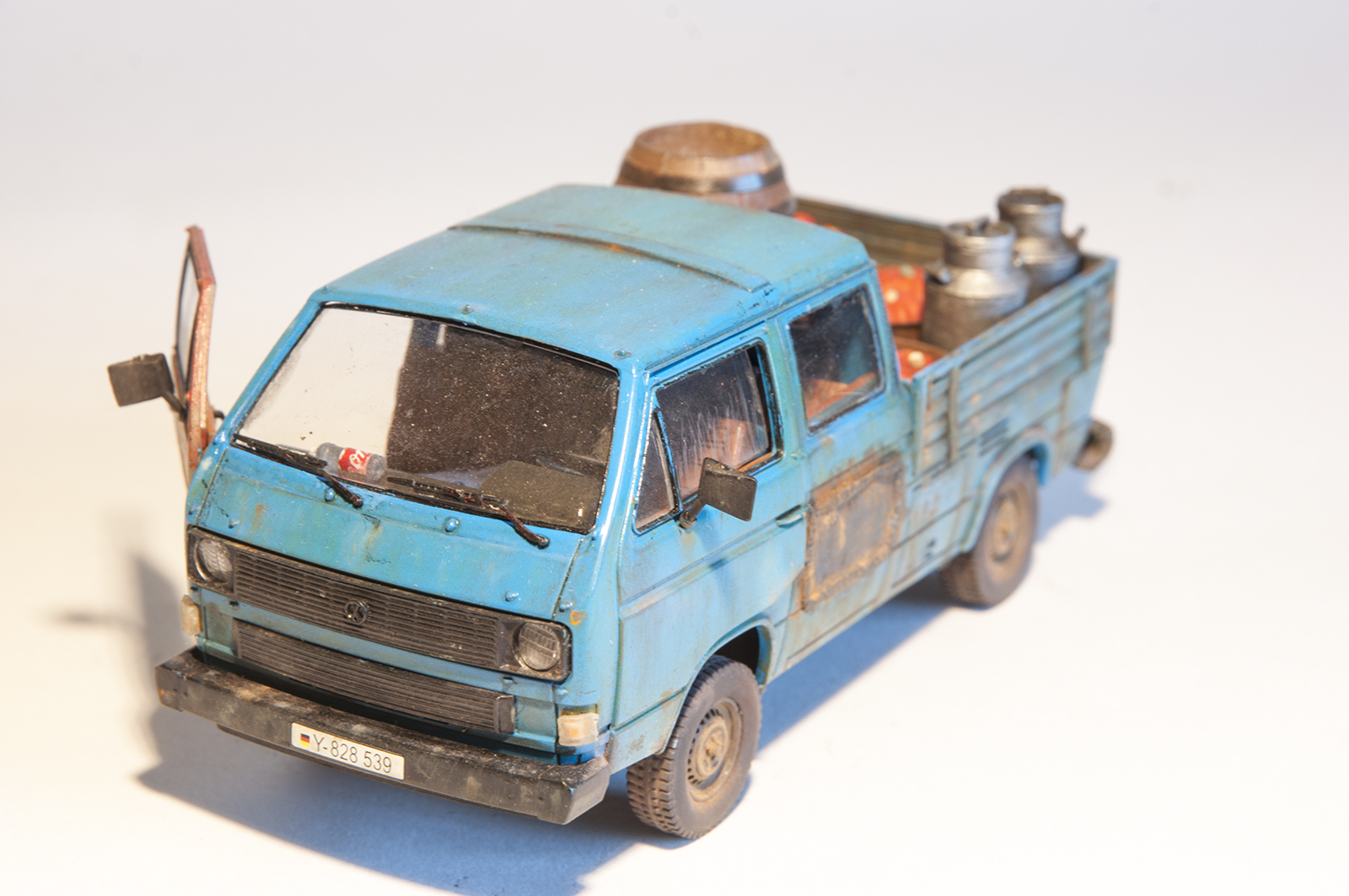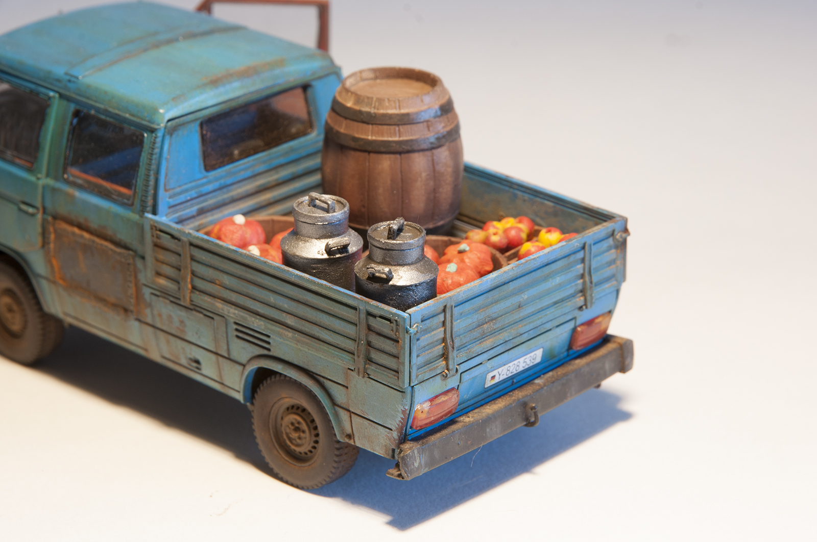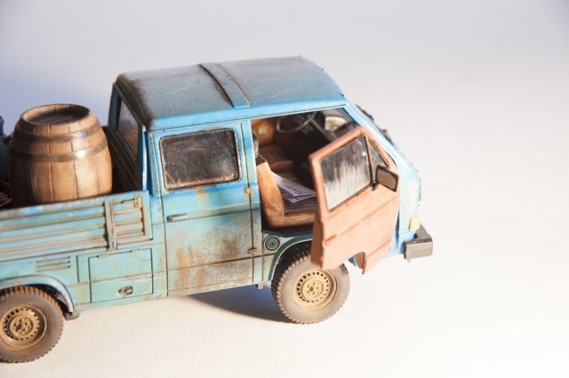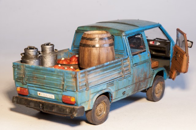 Хочу представить на Ваш суд модель T3 пикап. Производитель предлагает его в окраске BUNDESWEHR, но мне она показалась грустной для такой машинки. В интернете, он чаще всего мне встретился в голубоватом цвете, его и попробовал воспроизвести. Учитывая возраст этой модели, решил, что будет уместным, сделать его "ушатаным". К прототипам не привязывался, но нашел несколько фото, по мотивам которых и делал.Собирал "из коробки", немного опустил заднюю подвеску, сам делал овощную начинку из пластилина, в ящики. В сборке никаких проблем не возникло. Все легко стыковалось, инструкция понятна. Думаю, что не очень правильно было снабжать машинку немецкими номерами, все-таки там машины редко доживают до такого состояния, но других у меня не было, а в комплекте шли еще ливийские, которые еще меньше подходят к моему замыслу. Краска TAMIYA, пигменты WILDER. Буду благодарен за комментарии и критику. Приятного просмотра!
