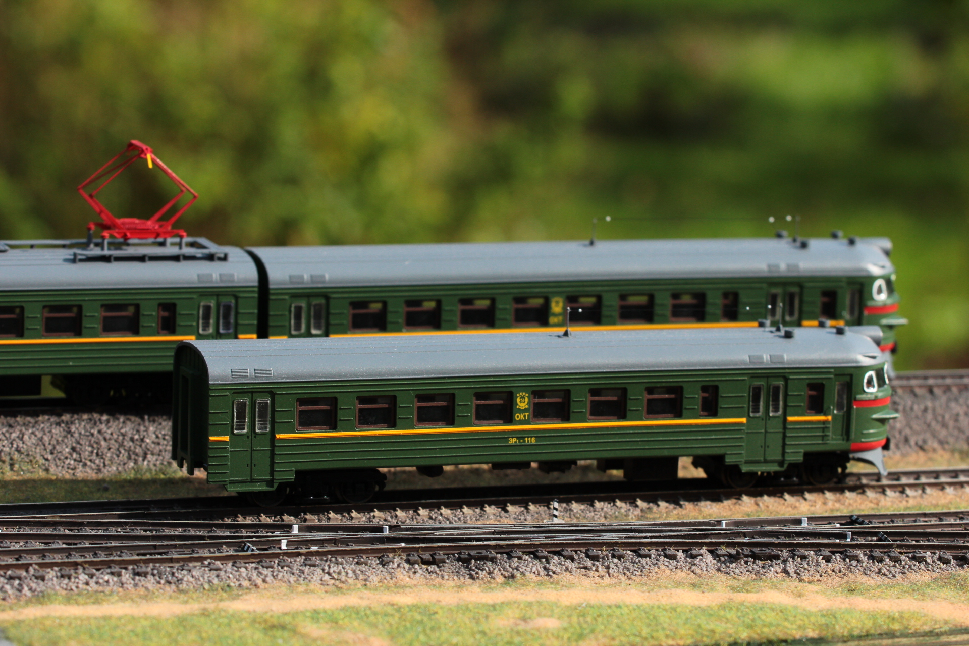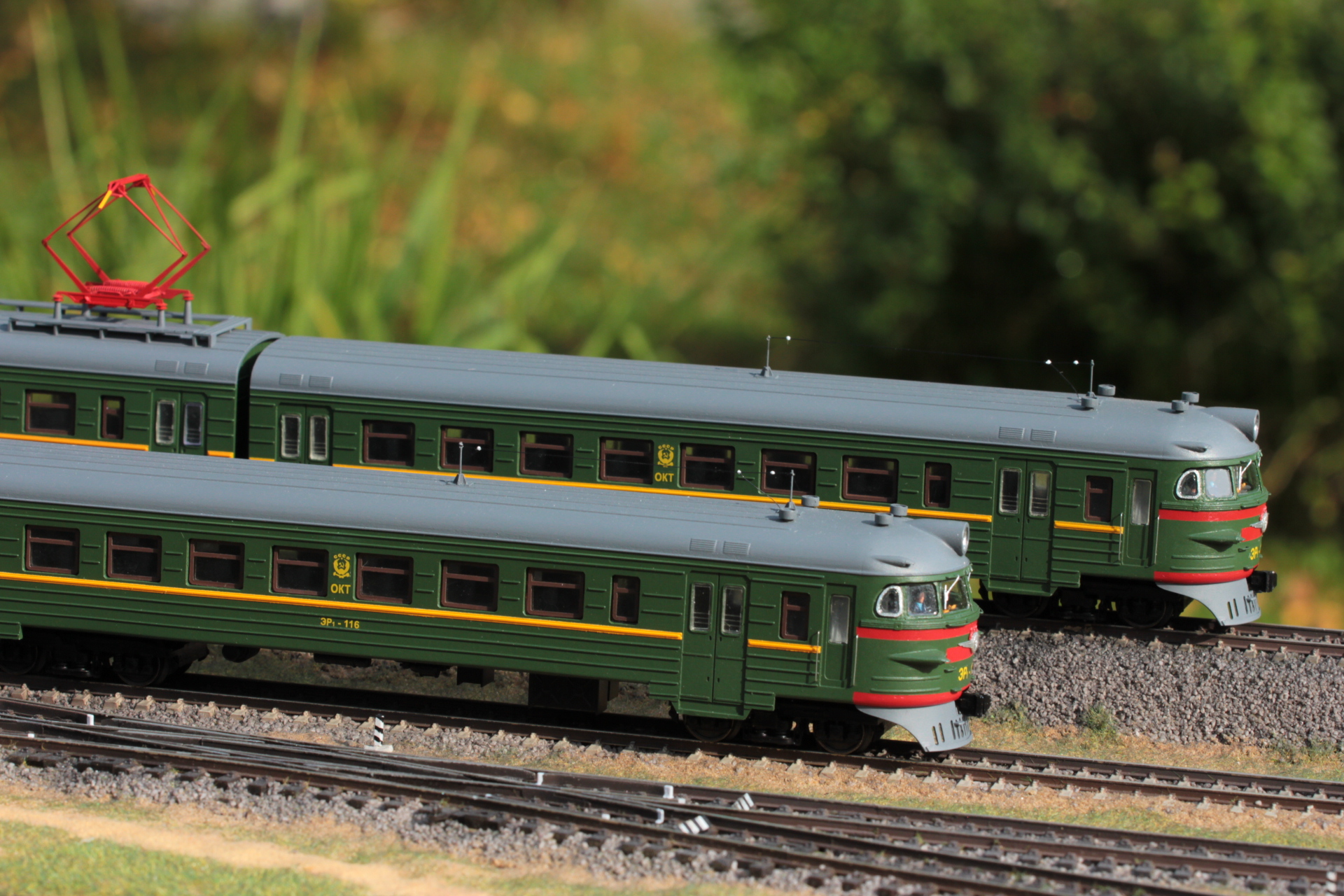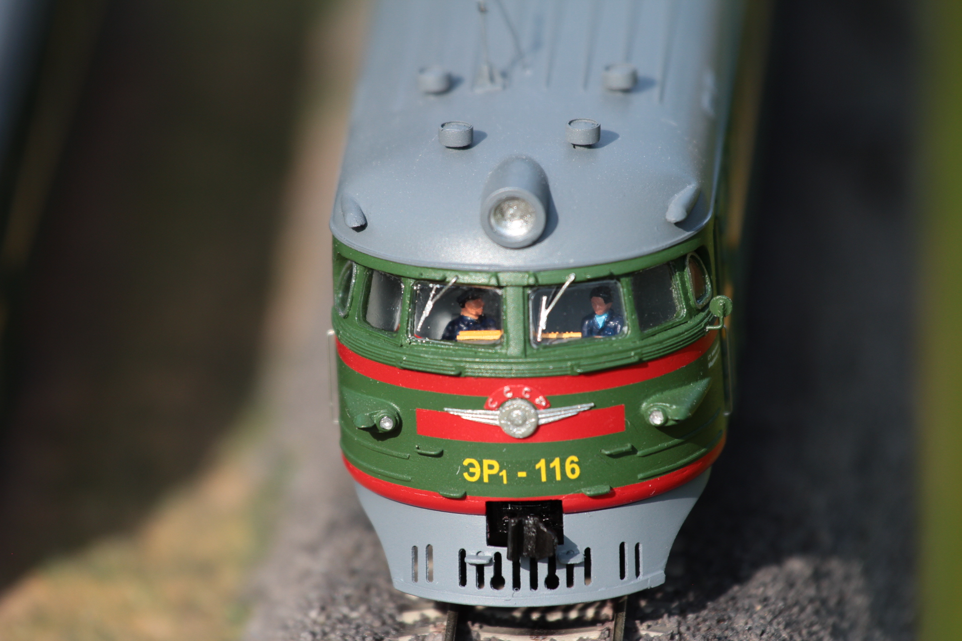 Всем привет! Представляю модель электропоезда Эр1, кит Вадима Караго. Материал смола, но кит собирается не хуже пластика. Некоторых деталей не хватало, самое трудоемкое было изготовить стекла кабины с нуля, из тамиевского пластика, добавлена антенная растяжка, щетки, зеркала, пантографы фирмы СвеТтофор. Окраска - автоэмаль, лак футура.