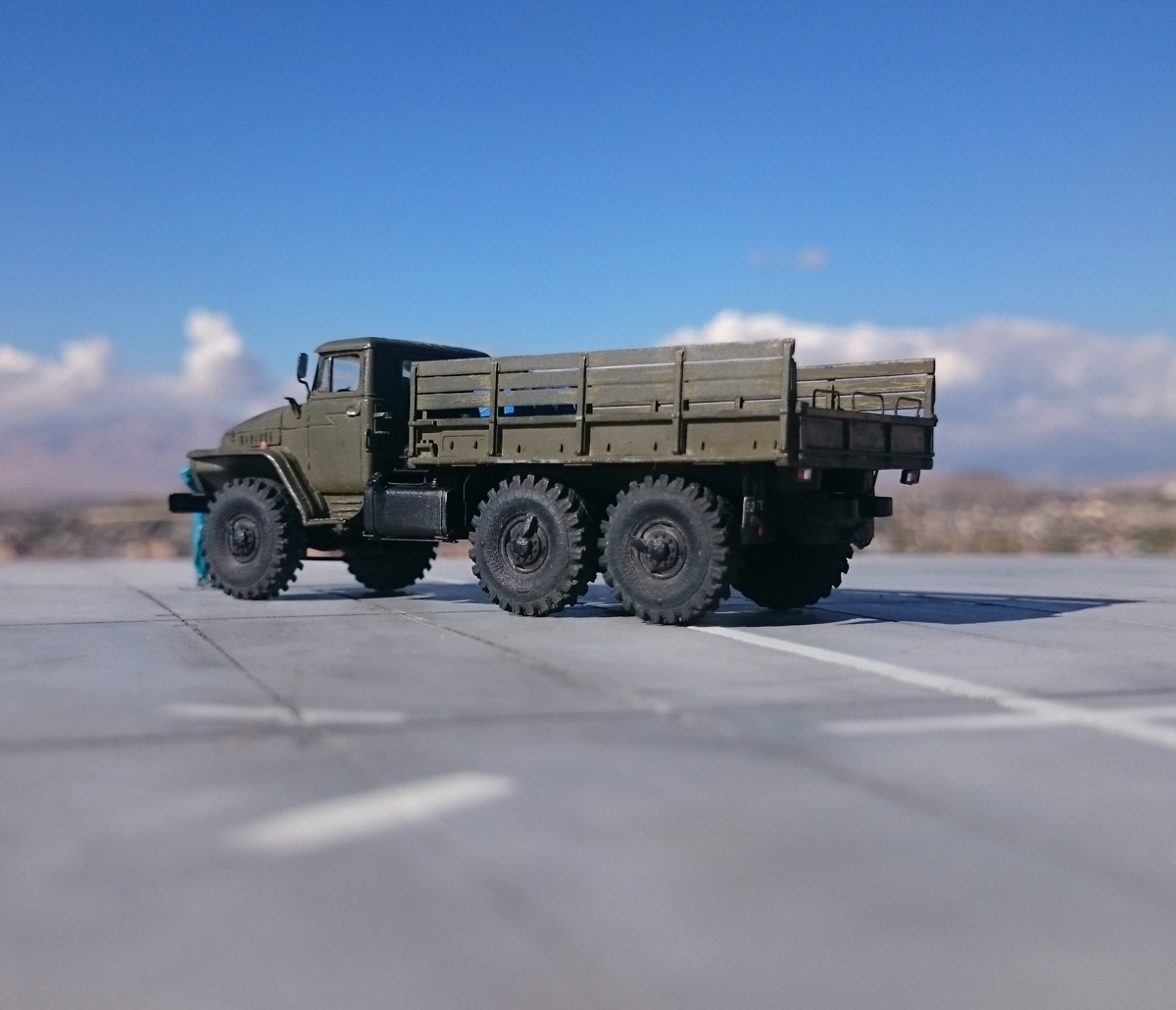 Кабина действительно смотрится заметно лучше исходика и в остальном машина не подкачала. А боковины шин от балатона на фото выглядят излишне рельефными, такой эффект - как будто в краске песок. Настоящие шины тоже все в "пупырышках" - но у них получилось не масштабно. Может, в реале этого и не видно совсем, а на фото - бросается в глаза.