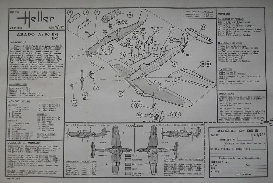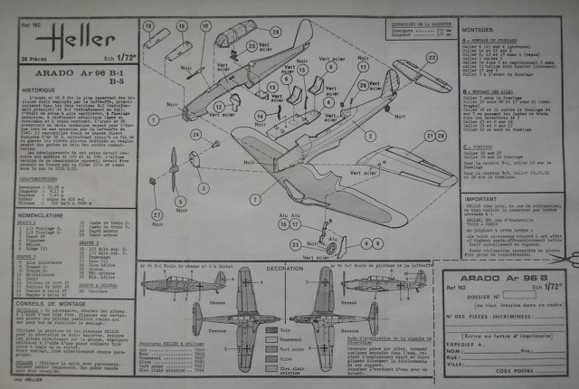 Модель от Heller в масштабе 1/72 (номер по каталогу 239) досталась мне в запечатанном состоянии, и в некотором смысле имеет «винтажную» ценность. Судя по дизайну коробки, она была выпущена в 70-х или в самом начале 80-х годов. Внутри я с удивлением обнаружил пластиковый пузырёк с клеем, который от времени потерял форму «оплавился» и «окаменел». Подобный клей я никогда не встречал внутри моделей данной фирмы даже середины 80-х годов, что и позволило мне сделать предположение о примерном возрасте набора. ЛВД – типичного качества для данной фирмы. Имеется возможность собрать модель на выбор в модификации B-1 или B-5. Скорее всего, под B-5 (которая ни в каких источниках не упоминается) производитель имеет в виду модификацию с пулемётом B-2. Фонарь смотрится отлично. Декаль даётся на два варианта. Она вся пожелтела от возраста и частично испорчена соседством с клеем. Инструкция имеет непривычный по сравнению с более поздними моделями формат, но в целом относительно информативна.