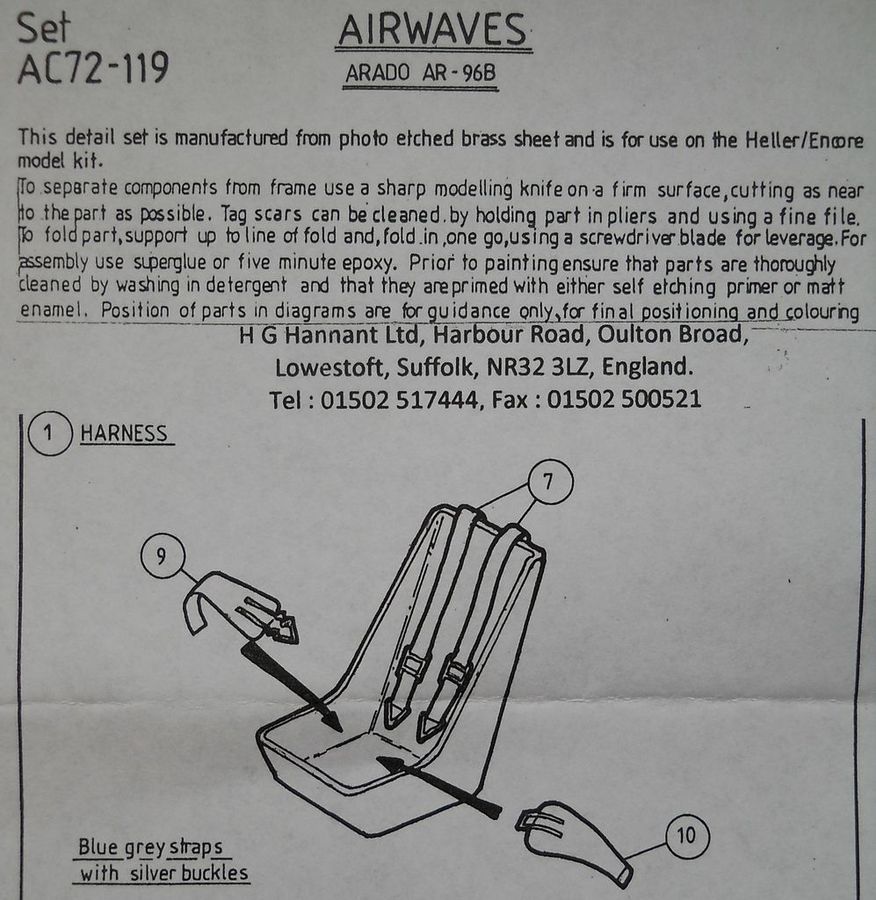Эта штука более полезная чем та декаль. :-) Хотя... Честно говоря, у чехов (Эдуарда) травло смотрится гораздо "вкуснее" чем у англичан. И наверняка дешевле. :-) Дмитрий, это сталь или латунь? Как оно гнется? У Арадо 96 весьма ажурная и заметная противокапотажная рама-перегородка между "рабочими местами", но этого элемента в травле нет, могли б и сделать. А что это за головоломка с пронумерованными кружочками? Тест на сообразительность? :-)))