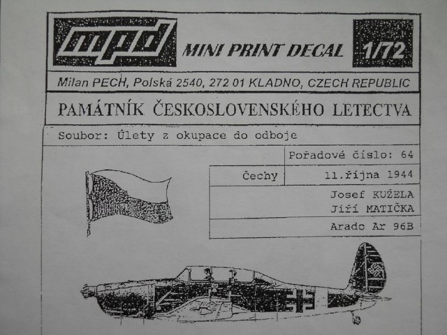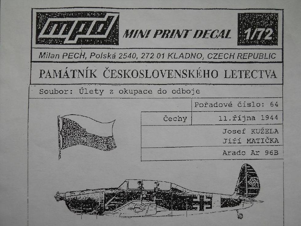 Декаль от MPD (номер по каталогу 72564) содержит один вариант на Arado Ar 96B и подойдёт для любой модели данного самолёта в 72-м масштабе.