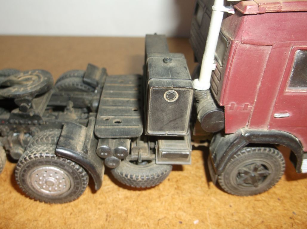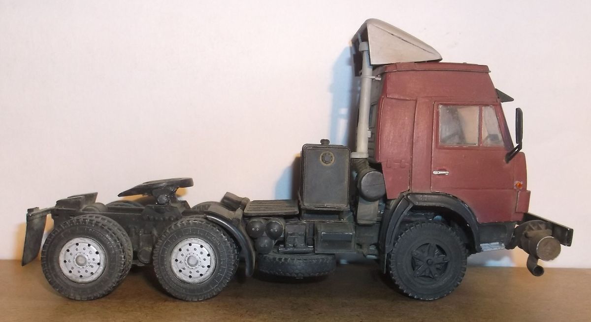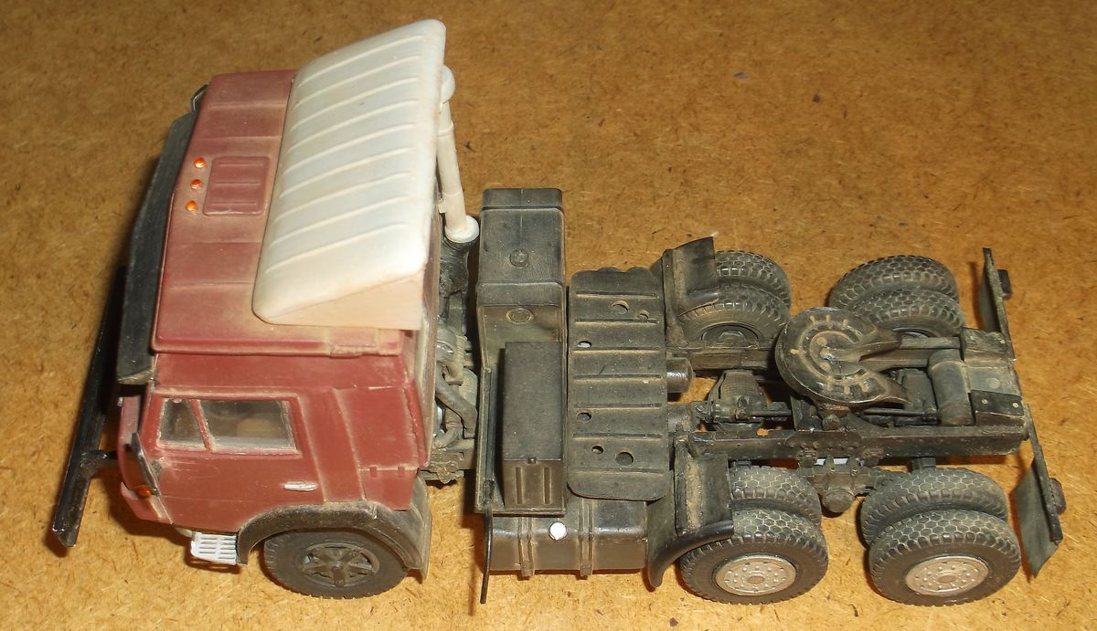 Самая нудная и трудная была переделка ходовой. Буквально каждую деталюху надо было подгонять по месту. Шорканёшь пару раз надфилем и на примерку. Что то приходилось переделывать по нескольку раз. Поэтому у машинки такой неказистый вид. Да и по легенде КАМАЗюка жил долго и не совсем счастливо и много повидал.