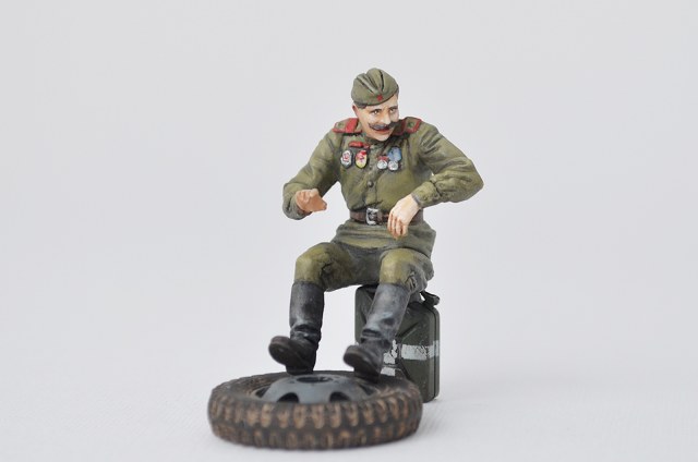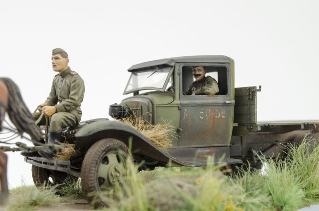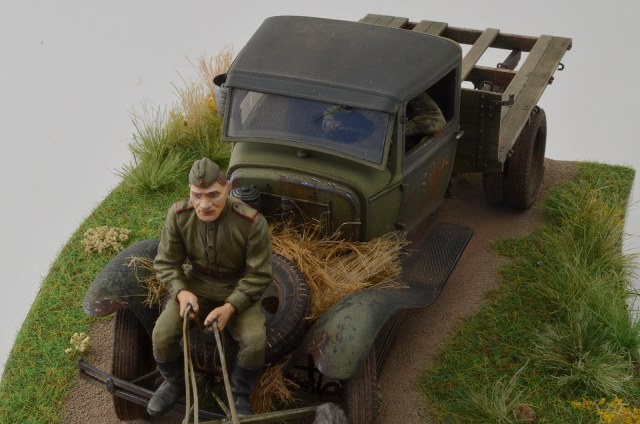 В инете есть фотка-эта же мизансцена, только едут немцы. И у машины нет левой дверки. Уже лет семь, собираюсь сделать эту же "картину". Только с немцами. Реальную фотку вставить не могу-не умею.