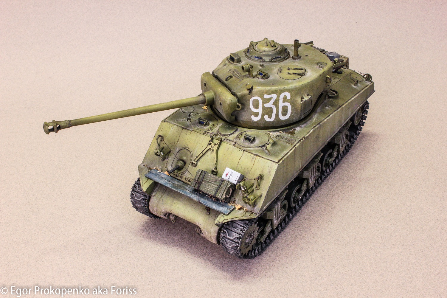 Шикарный Шерман, очень атмосферно передан, отличная игра цвета и очень выигрышные загрязнения! Несколько замечаний по матчасти))) На башне нет визира командира, хотя на фото прототипа (фото №2) его хорошо видно, так же на американских танках той поры только левая задняя фара стоп сигнал, только она красного цвета. Провиса гуслей быть не должно, понимаю, закольцевать Bronco в натяг на танке почти не реально, я собирал гуслю без ленивца, после чего им же и натягивал приклеивая по месту. Можно еще конечно, добавить, но тогда это уже будет запил! )))
