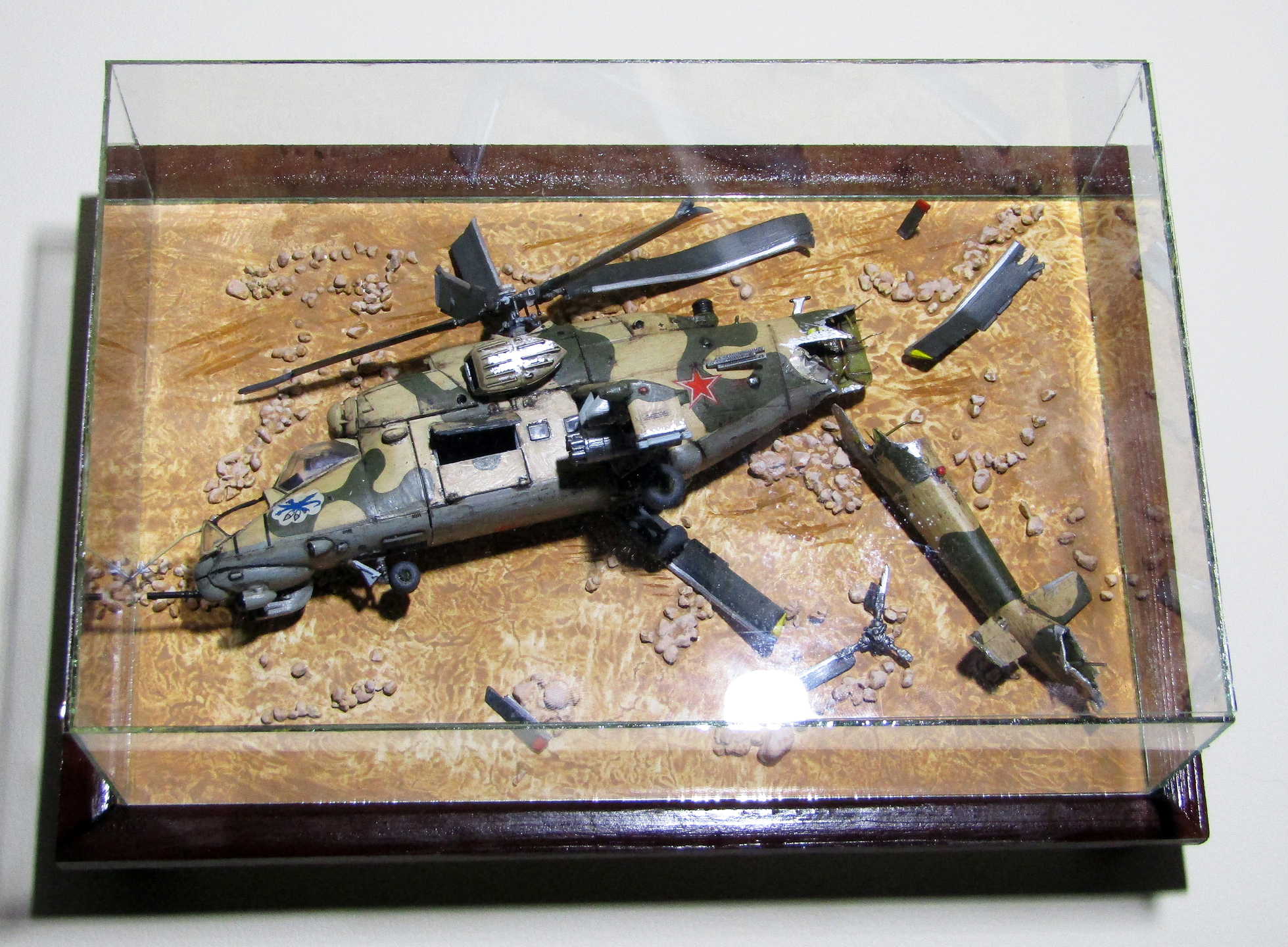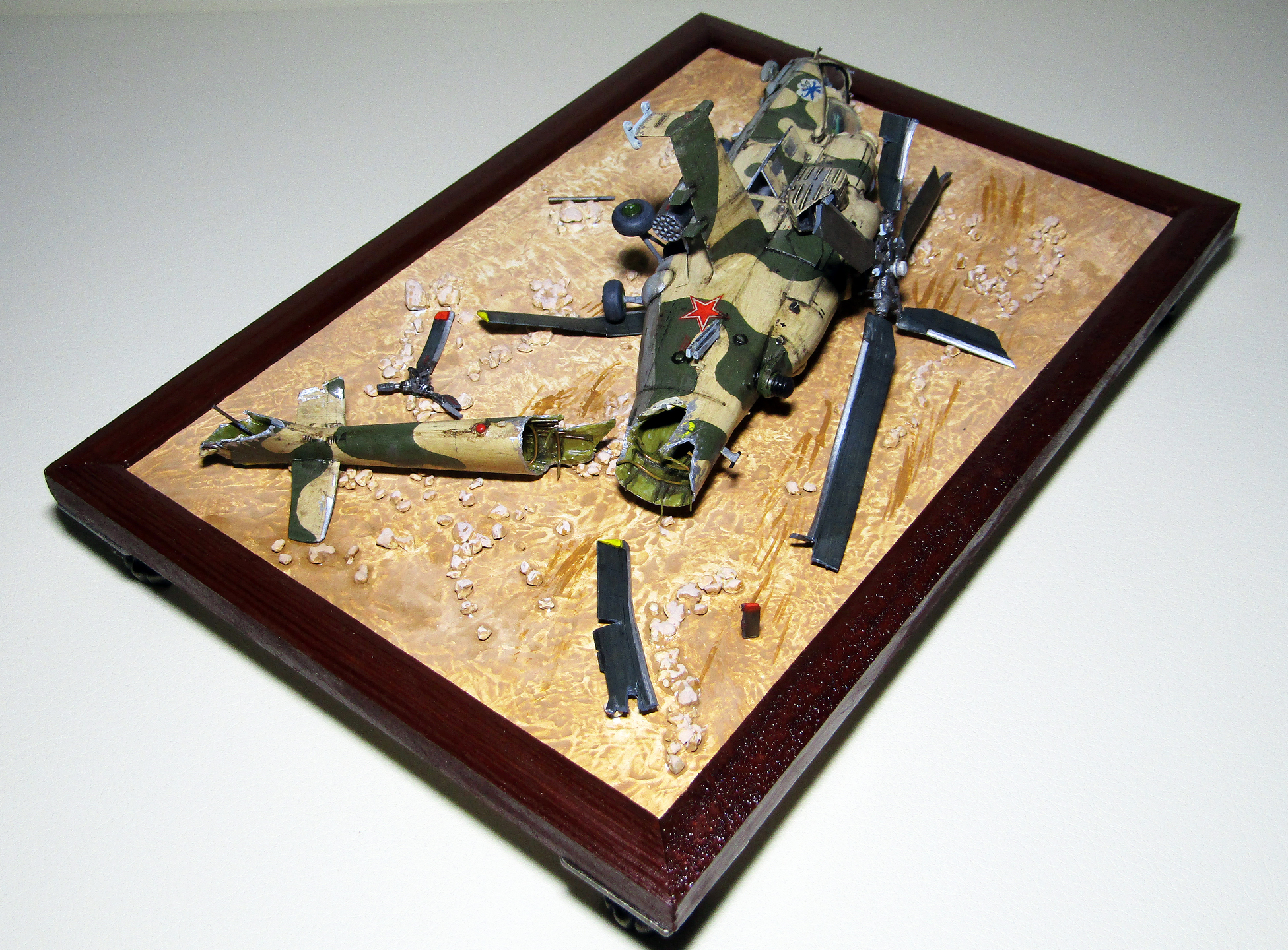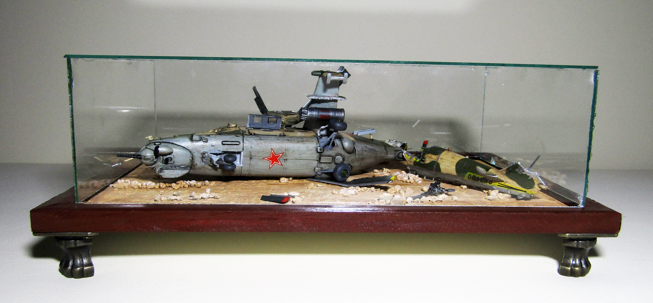 Доброго времени суток уважаемые коллеги! Довелось мне как-то собрать несколько лет назад данную вертушку. Набор от звезды очень понравился, высокая детализация и прекрасная стыкуемость деталей оставили очень приятные впечатления и заставили переменить своё отношение к звезде в целом, я наконец убедился в том, что она «может» выпускать и выпускает достойные киты. Однако исполнена данная модель была, мягко говоря не очень, ввиду отсутствия должного опыта и нормальных расходников. Красил без грунта эмалями от revell, затем перед постройкой диорамы немного «состарил» проэксперементировав разными способами смывки и перестарался. Модель получилась чересчур «грязной». Затем, в ходе переезда и вовсе поламалась. И тут, немного подумав, я решил не пропадать же добру и решил сделать небольшую миниатюру на тему афганской войны. Для сюжета использовал ряд фотографий сбитых крокодилов из различных фотоархивов. По большей части, за основу была взята фотография Ми-24П капитана Г. Павлова, подбитого у Бамиана, который после выхода из строя гидросистемы был разбит при аварийной посадке. 50-й ОСАП, 18 июня 1985 г. Умелые и слаженные действия помогли летчикам уцелеть в аварийной ситуации, однако командиру удалось выбраться из кабины, лишь разбив остекление. Но конечно-же у меня не модификация «П», а «В» с четырехствольным 12,7-мм пулемётом ЯкБ-12,7 (9-А-624). Поэтому искать какую-либо стопроцентную схожесть с фотографиями не нужно. В качестве подставки использовал листовой вспененный пластик, покрытый акриловой текстурной пастой и мелкими камушками. Лист вставлен в фоторамку. Основание красилось темперой по автомобильной грунтовке. Ножки прикрутил «шкатулочные», стеклянный колпак нарезал из фоторамочных 1-мм стёкол, склеиливал стеклянным моментом. Приятного просмотра коллеги…
